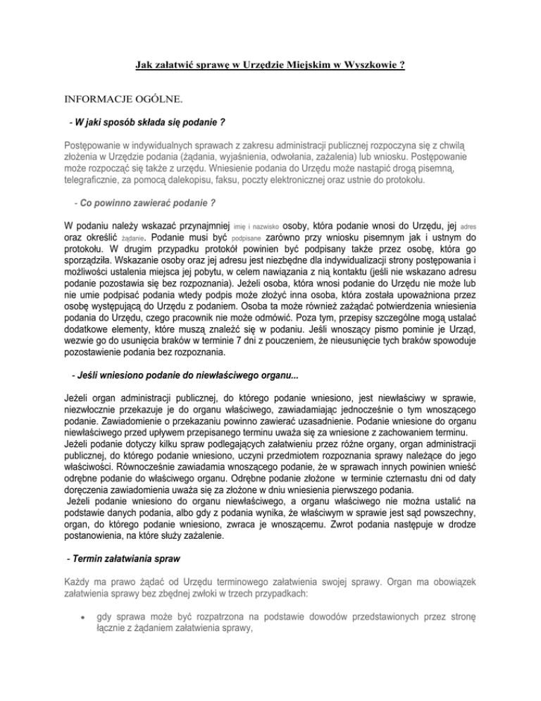 Jak załatwić sprawę w Urzędzie Miejskim w Wyszkowie ? INFORMACJE OGÓLNE. - W jaki sposób składa się podanie ? Postępowanie w indywidualnych sprawach z zakresu administracji publicznej rozpoczyna się z chwilą złożenia w Urzędzie podania (żądania, wyjaśnienia, odwołania, zażalenia) lub wniosku. Postępowanie może rozpocząć się także z urzędu. Wniesienie podania do Urzędu może nastąpić drogą pisemną, telegraficznie, za pomocą dalekopisu, faksu, poczty elektronicznej oraz ustnie do protokołu. - Co powinno zawierać podanie ? W podaniu należy wskazać przynajmniej imię i nazwisko osoby, która podanie wnosi do Urzędu, jej adres oraz określić żądanie. Podanie musi być podpisane zarówno przy wniosku pisemnym jak i ustnym do protokołu. W drugim przypadku protokół powinien być podpisany także przez osobę, która go sporządziła. Wskazanie osoby oraz jej adresu jest niezbędne dla indywidualizacji strony postępowania i możliwości ustalenia miejsca jej pobytu, w celem nawiązania z nią kontaktu (jeśli nie wskazano adresu podanie pozostawia się bez rozpoznania). Jeżeli osoba, która wnosi podanie do Urzędu nie może lub nie umie podpisać podania wtedy podpis może złożyć inna osoba, która została upoważniona przez osobę występującą do Urzędu z podaniem. Osoba ta może również zażądać potwierdzenia wniesienia podania do Urzędu, czego pracownik nie może odmówić. Poza tym, przepisy szczególne mogą ustalać dodatkowe elementy, które muszą znaleźć się w podaniu. Jeśli wnoszący pismo pominie je Urząd, wezwie go do usunięcia braków w terminie 7 dni z pouczeniem, że nieusunięcie tych braków spowoduje pozostawienie podania bez rozpoznania. - Jeśli wniesiono podanie do niewłaściwego organu... Jeżeli organ administracji publicznej, do którego podanie wniesiono, jest niewłaściwy w sprawie, niezwłocznie przekazuje je do organu właściwego, zawiadamiając jednocześnie o tym wnoszącego podanie. Zawiadomienie o przekazaniu powinno zawierać uzasadnienie. Podanie wniesione do organu niewłaściwego przed upływem przepisanego terminu uważa się za wniesione z zachowaniem terminu. Jeżeli podanie dotyczy kilku spraw podlegających załatwieniu przez różne organy, organ administracji publicznej, do którego podanie wniesiono, uczyni przedmiotem rozpoznania sprawy należące do jego właściwości. Równocześnie zawiadamia wnoszącego podanie, że w sprawach innych powinien wnieść odrębne podanie do właściwego organu. Odrębne podanie złożone w terminie czternastu dni od daty doręczenia zawiadomienia uważa się za złożone w dniu wniesienia pierwszego podania. Jeżeli podanie wniesiono do organu niewłaściwego, a organu właściwego nie można ustalić na podstawie danych podania, albo gdy z podania wynika, że właściwym w sprawie jest sąd powszechny, organ, do którego podanie wniesiono, zwraca je wnoszącemu. Zwrot podania następuje w drodze postanowienia, na które służy zażalenie. - Termin załatwiania spraw Każdy ma prawo żądać od Urzędu terminowego załatwienia swojej sprawy. Organ ma obowiązek załatwienia sprawy bez zbędnej zwłoki w trzech przypadkach: gdy sprawa może być rozpatrzona na podstawie dowodów przedstawionych przez stronę łącznie z żądaniem załatwienia sprawy, w oparciu o dowody lub fakty powszechnie znane z urzędu organowi, który rozpatruje sprawę, na podstawie dowodów i faktów możliwych do ustalenia na podstawie danych, którymi rozporządza organ. W przypadku gdy na rozstrzygnięcie sprawy trzeba poczekać, Urząd powinien poinformować o tym obywatela i określić termin, w jakim to rozstrzygnięcie nastąpi. Na jego żądanie Urząd zobowiązany jest przesłać wydaną decyzję lub postanowienie pod wskazany adres. Jeżeli do rozstrzygnięcia sprawy potrzebne jest przeprowadzenie postępowania wyjaśniającego, Urząd powinien rozpatrzyć sprawę w ciągu miesiąca, a w wyjątkowych przypadkach (gdy sprawa jest skomplikowana) w ciągu dwóch miesięcy. Nie wlicza się tutaj okresów opóźnień z przyczyn niezależnych od organu (np. działanie sił przyrody takich jak powódź, zaniechania innych organów, które są istotne do załatwienia sprawy, braku dokumentów, które strona ma obowiązek dostarczyć Urzędowi). O każdym przypadku niezałatwienia sprawy w terminie Urząd musi zawiadomić strony i podać przyczyny zwłoki , wskazując nowy termin załatwienia sprawy. Na niezałatwienie sprawy w terminie określonym stronie służy zażalenie do organu wyższego stopnia (Samorządowe Kolegium Odwoławcze, chyba że przepisy szczególne stanowią inaczej). Jeśli uzna on, że zażalenie jest uzasadnione wyznacza dodatkowy termin załatwienia sprawy oraz zarządza wyjaśnienie przyczyn i ustalenie osób winnych niezałatwienia sprawy w terminie, a w razie potrzeby także podjęcie środków zapobiegających naruszeniu terminów załatwienia spraw w przyszłości - Wymagane dokumenty Często razem z podaniem kierowanym do Urzędu należy dołączyć dodatkowe dokumenty, dlatego tez należy wcześniej dowiedzieć się, jakie dokumenty są wymagane, gdzie można je uzyskać lub skąd pobrać odpowiednie druki, a także w jakiej formie powinny one być dostarczone (np. oryginały, kopie, kopie poświadczone notarialnie). Szczegółowych informacji na ten temat powinien udzielić urzędnik, zajmujący się załatwianiem danego rodzaju spraw. Dla zaoszczędzenia czasu można zwrócić się o udzielenie takiej informacji telefonicznie korzystając z danych teleadresowych zamieszonych w BIP. - Opłata skarbowa Pracownik załatwiający sprawę ma również obowiązek udzielić informacji dotyczących opłaty skarbowej uiszczanej przy składaniu wniosku: czy jest ona wymagana, jeśli tak, to w jakiej wysokości i w jaki sposób należy dokonać wpłaty. - Odwołania i zażalenia Od decyzji wydanej przez Urząd w pierwszej instancji można odwołać się d