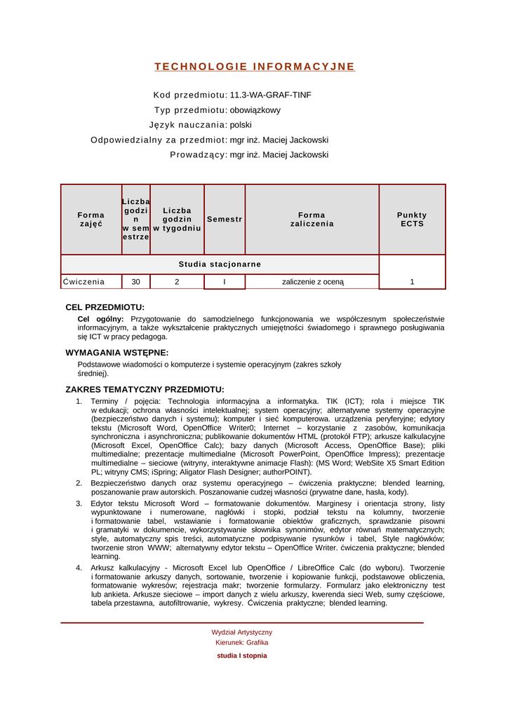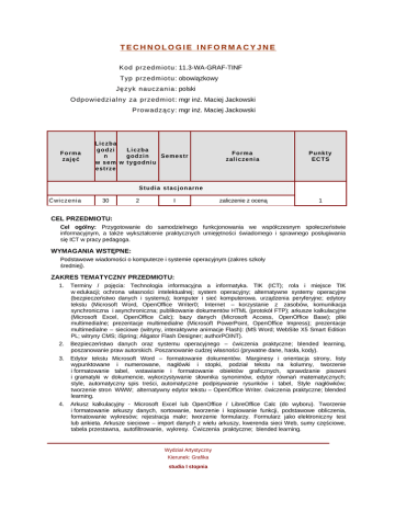 TECHNOLOGIE INFORMACYJNE Ko d p rzed mio t u : 11.3-WA-GRAF-TINF Typ p rzed mio t u : obowiązkowy Ję zyk n au cza n ia : polski O dp o wied zia ln y za p rzed mio t : mgr inż. Maciej Jackowski P ro wad zą cy: mgr inż. Maciej Jackowski F o r ma zajęć Li c z b a g o d zi Liczba n godzin S e mestr w s e m w t y g o d ni u estrze F o rma zal i czen i a P un kty ECT S zaliczenie z oceną 1 S t u di a s t acj o n arn e Ć w i c z e ni a 30 2 I CEL PRZEDMIOTU: Cel ogólny: Przygotowanie do samodzielnego funkcjonowania we współczesnym społeczeństwie informacyjnym, a także wykształcenie praktycznych umiejętności świadomego i sprawnego posługiwania się ICT w pracy pedagoga. WYMAGANIA WSTĘPNE: Podstawowe wiadomości o komputerze i systemie operacyjnym (zakres szkoły średniej). ZAKRES TEMATYCZNY PRZEDMIOTU: 1. 2. 3. 4. Terminy / pojęcia: Technologia informacyjna a informatyka. TIK (ICT); rola i miejsce TIK w edukacji; ochrona własności intelektualnej; system operacyjny; alternatywne systemy operacyjne (bezpieczeństwo danych i systemu); komputer i sieć komputerowa. urządzenia peryferyjne; edytory tekstu (Microsoft Word, OpenOffice Writer0; Internet – korzystanie z zasobów, komunikacja synchroniczna i asynchroniczna; publikowanie dokumentów HTML (protokół FTP); arkusze kalkulacyjne (Microsoft Excel, OpenOffice Calc); bazy danych (Microsoft Access, OpenOffice Base); pliki multimedialne; prezentacje multimedialne (Microsoft PowerPoint, OpenOffice Impress); prezentacje multimedialne – sieciowe (witryny, interaktywne animacje Flash): (MS Word; WebSite X5 Smart Edition PL; witryny CMS; iSpring; Aligator Flash Designer; authorPOINT). Bezpieczeństwo danych oraz systemu operacyjnego – ćwiczenia praktyczne; blended learning, poszanowanie praw autorskich. Poszanowanie cudzej własności (prywatne dane, hasła, kody). Edytor tekstu Microsoft Word – formatowanie dokumentów. Marginesy i orientacja strony, listy wypunktowane i numerowane, nagłówki i stopki, podział tekstu na kolumny, tworzenie i formatowanie tabel, wstawianie i formatowanie obiektów graficznych, sprawdzanie pisowni i gramatyki w dokumencie, wykorzystywanie słownika synonimów, edytor równań matematycznych; style, automatyczny spis treści, automatyczne podpisywanie rysunków i tabel, Style nagłówków; tworzenie stron WWW; alternatywny edytor tekstu – OpenOffice Writer. ćwiczenia praktyczne; blended learning. Arkusz kalkulacyjny - Microsoft Excel lub OpenOffice / LibreOffice Calc (do wyboru). Tworzenie i formatowanie arkuszy danych, sortowanie, tworzenie i kopiowanie funkcji, podstawowe obliczenia, formatowanie wykresów; rejestracja makr; tworzenie formularzy. Formularz jako elektroniczny test lub ankieta. Arkusze sieciowe – import danych z wielu arkuszy, kwerenda sieci Web, sumy częściowe, tabela przestawna, autofiltrowanie, wykresy. Ćwiczenia praktyczne; blended learning. Wydział Artystyczny Kierunek: Grafika studia I stopnia 5. 6. Dla zainteresowanych e-elearning – tworzenie elektronicznych testów i ankiet: http://www.uz.zgora.pl/~jjedrycz/elearning/excel1/00ex.htm. Multimedia: grafika i dźwięk, film. Grafika - typy plików graficznych, konwersja. Fotografia cyfrowa, programy do edycji zdjęć, skanery i skanowanie, tworzenie animowanych plików gif, tworzenie animacji w prezentacji multimedialnej. Dźwięk - rejestracja dźwięku z różnych źródeł, obróbka dźwięku, konwersja plików dźwiękowych. Osadzanie dźwięku w prezentacji multimedialnej. Film - rejestracja filmów z zastosowaniem kamery internetowej, rejestracja ekranu komputera z zastosowaniem aplikacji do tworzenia filmów ekranowych, zapisywanie i konwersja filmów rozpowszechnianych legalnie w Internecie, montaż plików filmowych, tworzenie prostych animacji, animowane napisy. Internet: FTP; WWW; CMS; Edytory HTML. Aplikacje w chmurze; Google Dokumenty oraz Microsoft SkyDrive; DropBox. Przegląd narzędzi do publikowania multimedialnych witryn w sieci Internet (MS Word lub kreatora, np. WebSite X5 Smart Edition PL); Podstawowe informacje o witrynach CMS. Projekt witryny (wykonanie witryny). METODY KSZTAŁCENIA: Pokaz, demonstracja, praca z książką (samodzielne korzystanie z multimedialnych kursów online: blended learning oraz e-learning), metoda zajęć praktycznych, metoda laboratoryjna. EFEKTY KSZTAŁCENIA: Opis efektu Kod efektu Kompetencje w zakresie technologii informacyjnej – absolwent posiada: K_W13 posiada wiedzę dotyczącą technologii w zakresie grafiki warsztatowej; ma wiedzę nt. rozwoju technologicznego ww., posiada wiedzę dotyczącą technologii w zakresie grafiki projektowej; ma wiedzę nt. rozwoju technologicznego ww., posiada podstawowy zakres umiejętności warsztatowych w zakresie dyscyplin graficznych pozostających poza jego głównym nurtem zainteresowań K_W14 K_U14 WERYFIKACJA EFEKTÓW KSZTAŁCENIA I WARUNKI ZALICZENIA: Wiedza teoretyczna zdobywana podczas zajęć oraz samodzielnej pracy z książką lub kursem online (przede wszystkim KA1_U44) będzie sprawdzana z zastosowaniem testów z progami punktowymi. Umiejętności praktyczne, np. korzystanie z edytora tekstu, arkusza kalkulacyjnego itp. będą weryfikowane na podstawie oceny jakości prac – sprawdzian z progami punktowymi. Weryfikacja kompetencji społecznych odbywa się na podstawie analizy realizowanych samodzielnie projektów z zastosowaniem progów punktowych. OBCIĄŻENIE PRACĄ STUDENTA: Liczba godzin Rodzaj obciążenia pracą studenta ECTS 25 Udział w ćwiczeniach 0,7 5 Udział w konsultacjach 0,1 10 Przygotowanie do ćwiczeń 0,3 40 Razem 1 LITERATURA PODSTAWOWA: 1. Furmanek M., (red.), Technologie informacyjne w warsztacie pracy nauczyciela, Oficyna Wydawnicza Uniwersytetu Zielonogórskiego, Zielona Góra 2008. 2. Jędryczkowski J., Prezentacje multimedialne w pracy nauczyciela, Oficyna Wydawnicza Uniwersytetu Wydział Artystyczny Kierunek: Grafika studia I stopnia Zielonogórskiego, Zielona Góra 2008. 3. 