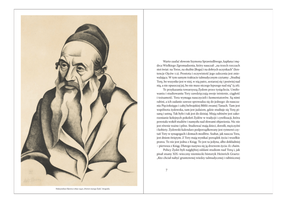 Warto zaufać słowom Szymona Sprawiedliwego, kapłana i mędrca Wielkiego Zgromadzenia, który nauczał: „na trzech rzeczach stoi świat: na Torze, na służbie [Bogu] i na dobrych uczynkach” (Sentencje Ojców 1:2). Prostota i oczywistość jego zalecenia jest zniewalająca. W tym samym traktacie talmudycznym czytamy: „Studiuj Torę, bo wszystko jest w niej, w nią patrz, zestarzej się i posiwiej nad nią, a nie opuszczaj jej, bo nie masz niczego lepszego nad nią” (5:26). Te przykazania towarzyszą Żydom przez tysiąclecia. Umiłowaniu i studiowaniu Tory zawdzięczają swoje istnienie, ciągłość i tożsamość. Tora wymaga nauczycieli i komentatorów. Są nimi rabini, a ich zadanie zawsze sprowadza się do jednego: do nauczania Pięcioksięgu i całej hebrajskiej Biblii zwanej Tanach. Tam jest wspólnota żydowska, tam jest judaizm, gdzie studiuje się Torę pisaną i ustną. Tak było i tak jest do dzisiaj. Misją rabinów jest zakorzenianie kolejnych pokoleń Żydów w tradycji i cywilizacji, która powstała wokół studiów i namysłu nad słowami objawienia. Nic nie jest równie ważne i pilne. Studiować mają dzieci, dorośli, mężczyźni i kobiety. Żydowski kalendarz podporządkowany jest rytmowi czytań Tory w synagogach i domach modlitw. Szabat, jak naucza Tora, jest dniem świętym. Z Tory mają wynikać porządek życia i wszelkie prawa. To nie jest jedna z Ksiąg. To jest ta jedyna, albo dokładniej – pierwsza z Ksiąg. Dlatego nazywa się ją drzewem życia: Ec chaim. Polscy Żydzi byli najgłębiej oddani studiom nad Torą i, jak pisał znany XIX–wieczny niemiecki historyk Heinrich Graetz: „Kto chciał nabyć gruntownej wiedzy talmudycznej i rabinicznej 6 7 Maksymilian Eljowicz (1890-1942) „Portret starego Żyda”, litografia musiał usiąść u stóp talmudystów polskich… Żartowano z »Polaków«, lecz słuchano ich we wszystkim”. To właśnie polscy rabini po wygnaniu Żydów z Hiszpanii wyznaczyli w dużej mierze styl myślenia innym wspólnotom żydowskim w całej Europie i później w Ameryce. Począwszy od XVI wieku stworzyli własny typ religijności z dominacją nauczania Talmudu i treści halachicznych. Ten styl duchowości z czasem został zakwestionowany przez chasydów, a potem przez nurt oświeceniowy zwany haskalą. Naszą wystawą chcemy pokazać, jak wielka wiedza i głęboka duchowość obecne były przez wieki w Polsce. Składały się na nie liczne jesziwy – wyższe szkoły religijne, drukarnie, synagogi. Budowało je tysiące rabinów, cadyków, drukarzy, edytorów, nauczycieli, sędziów. Oni wyznaczali niepamiętaną dzisiaj geografię Polski. Liczyły się nie tylko wielkie miasta jak Kraków, Lublin, Lwów, Wilno, ale też Kozienice, Berdyczów, Lelów, Sasów, Wołożyn. Kultura i nauka żydowska istniały obok, niezależnie od polskiej kultury. Funkcjonowały w innym rytmie czasu i w innych przestrzeniach. Mimo swej intensywności i bogactwa są w Polsce niemal doszczętnie zapomniane. Znikły z naszego duchowego i fizycznego krajobrazu. Chcemy o ich obecność się upomnieć i tą wystawą je przybliżyć. Misja rabinów trwa, póki istnieją żydowskie religijne wspólnoty. W Polsce współczesnej jest ich zaledwie kilka i każda swe odrodzenie zawdzięcza w dużym stopniu swoim rabinom. Jest ich dzisiaj bardzo niewielu: są rabini ortodoksyjni, konserwatywni, reformowani, są rabini związani z tradycją chasydzką. Im też chcemy na naszej wystawie oddać głos. Niezależnie od tego, jak bardzo się różnią w swych poglądach, ich misja pozostaje ta sama: nauczanie Tory. W tym względzie nic od tysiącleci się nie zmieniło. Paweł Śpiewak Dyrektor Żydowskiego Instytutu Historycznego 8 9
