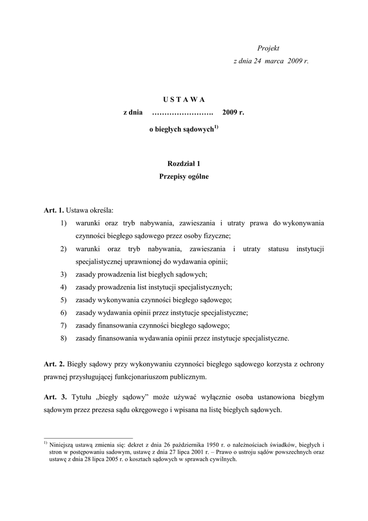 Projekt z dnia 24 marca 2009 r. USTAWA z dnia ……………………. 2009 r. o biegłych sądowych1) Rozdział 1 Przepisy ogólne Art. 1. Ustawa określa: 1) warunki oraz tryb nabywania, zawieszania i utraty prawa do wykonywania czynności biegłego sądowego przez osoby fizyczne; 2) warunki oraz tryb nabywania, zawieszania i utraty statusu instytucji specjalistycznej uprawnionej do wydawania opinii; 3) zasady prowadzenia list biegłych sądowych; 4) zasady prowadzenia list instytucji specjalistycznych; 5) zasady wykonywania czynności biegłego sądowego; 6) zasady wydawania opinii przez instytucje specjalistyczne; 7) zasady finansowania czynności biegłego sądowego; 8) zasady finansowania wydawania opinii przez instytucje specjalistyczne. Art. 2. Biegły sądowy przy wykonywaniu czynności biegłego sądowego korzysta z ochrony prawnej przysługującej funkcjonariuszom publicznym. Art. 3. Tytułu „biegły sądowy” moŜe uŜywać wyłącznie osoba ustanowiona biegłym sądowym przez prezesa sądu okręgowego i wpisana na listę biegłych sądowych. 1) Niniejszą ustawą zmienia się: dekret z dnia 26 października 1950 r. o naleŜnościach świadków, biegłych i stron w postępowaniu sadowym, ustawę z dnia 27 lipca 2001 r. – Prawo o ustroju sądów powszechnych oraz ustawę z dnia 28 lipca 2005 r. o kosztach sądowych w sprawach cywilnych. Art. 4. Wykonywanie czynności biegłego sądowego polega, w szczególności na: 1) wydawaniu opinii, na które składa się sporządzenie opinii oraz jej złoŜenie w sądzie, prokuraturze lub innym organie prowadzącym postępowanie karne; 2) udziale w przeprowadzeniu dowodu. Art. 5. Prawo do wydawania opinii mają teŜ instytucje specjalistyczne ustanowione przez prezesa sądu okręgowego i wpisane na listę instytucji specjalistycznych. Art. 6. Instytut Ekspertyz Sądowych im. prof. dra Jana Sehna w Krakowie, policyjne laboratoria kryminalistyczne, rodzinne ośrodki diagnostyczno – konsultacyjne, jednostki naukowe w rozumieniu art. 2 pkt 9 ustawy z dnia 8 października 2004 r. o zasadach finansowania nauki (Dz. U. z 2008 r. Nr 169, poz. 1049) oraz zakłady opieki zdrowotnej w rozumieniu art. 2 ustawy z dnia 30 sierpnia 1991 r. o zakładach opieki zdrowotnej (Dz. U. z 2006 r. Nr 143, poz. 1032, Nr 191, poz. 1410, z 2007 r. Nr 14, poz. 89, Nr 123, poz. 849, Nr 166, poz. 1172, Nr 176, poz. 1240, Nr 181, poz. 1290 oraz z 2008 r. Nr 171, poz. 1056 i Nr 234, poz. 1570), mają prawo do wydawania opinii bez konieczności spełnienia warunków, o których mowa w art. 5. Art. 7. W przypadku gdy powołanie biegłego sądowego, instytucji specjalistycznej albo Instytutu Ekspertyz Sądowych im. prof. dra Jana Sehna w Krakowie, policyjnych laboratoriów kryminalistycznych, rodzinnych ośrodków diagnostyczno – konsultacyjnych, jednostki naukowej lub zakładu opieki zdrowotnej, o których mowa w art. 6, jest niemoŜliwe lub utrudnione, do wykonywania czynności biegłego moŜe być powołana osoba nie ustanowiona biegłym sądowym, o której wiadomo, Ŝe ma odpowiednią wiedzę w danej dziedzinie, bądź instytucja nie ustanowiona instytucją specjalistyczną. Art. 8. Czynności biegłego sądowego związane z dostępem do informacji niejawnych wykonuje osoba dopuszczona do informacji niejawnych zgodnie z przepisami ustawy z dnia 22 stycznia 1999 r. o ochronie informacji niejawnych (Dz. U. z 2005 r. Nr 196, poz. 1631, z 2006 r. Nr 104, poz. 708 i 711, Nr 149, poz. 1078, Nr 218, poz. 1592, Nr 220, poz. 1600 oraz z 2008 r. Nr 171, poz. 1056). Rozdział 2 Biegli sądowi 2 Art. 9. 1. Biegłym sądowym moŜe zostać ustanowiona osoba fizyczna, która: 1) ma obywatelstwo polskie albo obywatelstwo jednego z państw członkowskich Unii Europejskiej, Konfederacji Szwajcarskiej lub państw członkowskich Europejskiego Porozumienia o Wolnym Handlu (EFTA) – stron umowy o Europejskim Obszarze Gospodarczym; 2) zna język polski; 3) nie ukończyła 70 roku Ŝycia; 4) ma pełną zdolność do czynności prawnych; 5) posiada nieposzlakowaną opinię i swoim zachowaniem daje rękojmię prawidłowego wykonywania czynności biegłego sądowego; 6) posiada teoretyczne i praktyczne wiadomości specjalne w dziedzinie i specjalności, w której zamierza wykonywać czynności biegłego sądowego i co najmniej pięcioletnią praktykę w tej dziedzinie i specjalności; 7) posiada uprawnienia do wykonywania zawodu w dziedzinie, w której zamierza wykonywać czynności biegłego sądowego, o ile są one wymagane odrębnymi przepisami; 8) nie podlega zakazowi wykonywania zawodu w dziedzinie, w której zamierza wykonywać czynności biegłego sądowego; 9) nie była karana za umyślne przestępstwo lub umyślne przestępstwo skarbowe; 10) nie jest podejrzana albo oskarŜona o umyślne przestępstwo ścigane z oskarŜenia publicznego lub umyślne przestępstwo skarbowe; 11) jest zdolna, ze względu na stan zdrowia, do wykonywania czynności biegłego sądowego. 2. Do ustalenia zdolności do wykonywania czynności biegłego sądowego, ze względu na stan zdrowia, o której mowa w ust. 1 pkt 11, stosuje się odpowiednio przepisy o ustroju sądów powszechnych regulujące zakres i sposób przeprowadzania badań kandydatów do objęcia urzędu sędziego. Art. 10. 1. Ustanowienie biegłym sądowym następuje na wniosek osoby fizycznej. 3 2. Do wniosku naleŜy dołączyć: 1) dokumenty potwierdzające posiadanie wiadomości specjalnych, o których mowa w art. 9 ust. 1 pkt 6, oraz dokumenty potwierdzające wykonywanie przez okres co najmniej 5 lat praktyki zawodowej w dziedzinie objętej wnioskiem; 2) dokumenty potwierdzające posiadanie odpowiednich uprawnień w dziedzinie, w której uzyskanie uprawnień zawodowych jest regulowane; 3) opinię właściwej instytucji, samorządu zawodowego, stowarzyszenia bądź pracodawcy; 4) inne dokumenty, które mogą mieć wpływ na ocenę kwalifikacji osoby ubiegającej się o ustanowienie biegłym sądowym, w przypadku ich posiadania; 5) info