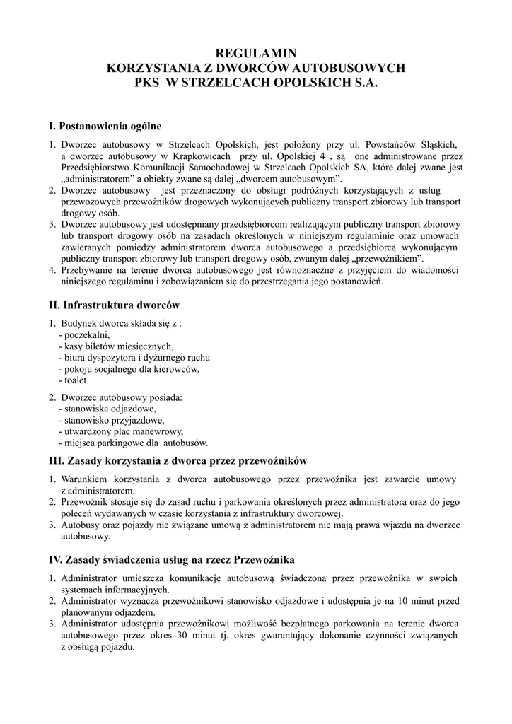 REGULAMIN KORZYSTANIA Z DWORCÓW AUTOBUSOWYCH PKS W STRZELCACH OPOLSKICH S.A. I. Postanowienia ogólne 1. Dworzec autobusowy w Strzelcach Opolskich, jest położony przy ul. Powstańców Śląskich, a dworzec autobusowy w Krapkowicach przy ul. Opolskiej 4 , są one administrowane przez Przedsiębiorstwo Komunikacji Samochodowej w Strzelcach Opolskich SA, które dalej zwane jest „administratorem” a obiekty zwane są dalej „dworcem autobusowym”. 2. Dworzec autobusowy jest przeznaczony do obsługi podróżnych korzystających z usług przewozowych przewoźników drogowych wykonujących publiczny transport zbiorowy lub transport drogowy osób. 3. Dworzec autobusowy jest udostępniany przedsiębiorcom realizującym publiczny transport zbiorowy lub transport drogowy osób na zasadach określonych w niniejszym regulaminie oraz umowach zawieranych pomiędzy administratorem dworca autobusowego a przedsiębiorcą wykonującym publiczny transport zbiorowy lub transport drogowy osób, zwanym dalej „przewoźnikiem”. 4. Przebywanie na terenie dworca autobusowego jest równoznaczne z przyjęciem do wiadomości niniejszego regulaminu i zobowiązaniem się do przestrzegania jego postanowień. II. Infrastruktura dworców 1. Budynek dworca składa się z : - poczekalni, - kasy biletów miesięcznych, - biura dyspozytora i dyżurnego ruchu - pokoju socjalnego dla kierowców, - toalet. 2. Dworzec autobusowy posiada: - stanowiska odjazdowe, - stanowisko przyjazdowe, - utwardzony plac manewrowy, - miejsca parkingowe dla autobusów. III. Zasady korzystania z dworca przez przewoźników 1. Warunkiem korzystania z dworca autobusowego przez przewoźnika jest zawarcie umowy z administratorem. 2. Przewoźnik stosuje się do zasad ruchu i parkowania określonych przez administratora oraz do jego poleceń wydawanych w czasie korzystania z infrastruktury dworcowej. 3. Autobusy oraz pojazdy nie związane umową z administratorem nie mają prawa wjazdu na dworzec autobusowy. IV. Zasady świadczenia usług na rzecz Przewoźnika 1. Administrator umieszcza komunikację autobusową świadczoną przez przewoźnika w swoich systemach informacyjnych. 2. Administrator wyznacza przewoźnikowi stanowisko odjazdowe i udostępnia je na 10 minut przed planowanym odjazdem. 3. Administrator udostępnia przewoźnikowi możliwość bezpłatnego parkowania na terenie dworca autobusowego przez okres 30 minut tj. okres gwarantujący dokonanie czynności związanych z obsługą pojazdu. V. Zasady poruszania się po terenie dworca autobusowego A. Ruch pieszy 1. Pieszy jest obowiązany korzystać z wyznaczonych ciągów komunikacyjnych. 2. Zabrania się: a) przechodzenia przez plac manewrowy, b) w razie konieczności przejścia przez plac manewrowy, zabrania się wychodzenia bezpośrednio przed jadący pojazd. B. Ruch pojazdów 1. Kierujący pojazdem zbliżając się do oznaczonych stanowisk odjazdowych na terenie dworca autobusowego jest obowiązany zmniejszyć prędkość a w razie potrzeby zatrzymać się aby umożliwić kierującemu pojazdem włączenie się do ruchu. 2. Kierujący pojazdem jest obowiązany: a) przy cofaniu ustąpić pierwszeństwa innemu pojazdowi lub uczestnikowi ruchu i zachować szczególną ostrożność, a w szczególności: - sprawdzić, czy wykonywany manewr nie spowoduje zagrożenia bezpieczeństwa ruchu lub jego utrudnienia, - upewnić się, czy za pojazdem nie znajduje się przeszkoda, w razie trudności w osobistym upewnieniu się kierujący jest obowiązany zapewnić sobie pomoc innej osoby. 3. Na terenie dworca autobusowego obowiązuje bezwzględny zakaz zatrzymywania się i postoju pojazdów na chodnikach, w miejscach oznaczonych właściwym znakiem zakazu oraz w miejscach postojowych przeznaczonych wyłącznie dla postoju pojazdów administratora. 4. Kierujący pojazdem jest obowiązany w czasie postoju zabezpieczyć pojazd przed możliwością jego uruchomienia przez osobę do tego nieuprawnioną oraz zachować inne środki ostrożności niezbędne do uniknięcia wypadku. C. Korzystanie z miejsc postojowych 1. Na terenie dworca autobusowego znajdują się wyznaczone miejsca postojowe przeznaczone dla autobusów i innych pojazdów mogących z nich korzystać. 2. Pozostawienie pojazdu na terenie dworca autobusowego nie powoduje zawarcia umowy przechowania tego pojazdu lub powstania innego zobowiązania, które obligowałoby administratora do ponoszenia odpowiedzialności za szkody powstałe w wyniku kradzieży, zniszczenia lub uszkodzenia pozostawionego pojazdu. Administrator nie ponosi również odpowiedzialności za rzeczy pozostawione w pojeździe lub stanowiące jego wyposażenie. 3. W miejscach wyznaczonych do postoju pojazdów zabronione jest: a) magazynowanie paliw, substancji łatwopalnych i pustych pojemników po paliwie, b) tankowanie pojazdów, c) mycie pojazdów, wymiana płynu chłodzącego, paliwa lub oleju, d) opróżnianie toalet, e) pozostawienie nieczystości. 4. Korzystający z miejsc postojowych obowiązani są respektować polecenia kierownictwa dworca autobusowego i służb porządkowych dotyczące obowiązujących na terenie obiektu zasad organizacji ruchu, parkowania pojazdów, porządku i bezpieczeństwa oraz warunków korzystania z usług dodatkowych. VI. Postanowienia porządkowe 1. W przypadku zanieczyszczenia dworca autobusowego płynami eksploatacyjnymi, nieczystościami stałymi lub w inny sposób należy je usunąć niezwłocznie we własnym zakresie lub zgłosić obsłudze dworca autobusowego. Za czynności usunięcia zanieczyszczeń uczestnik ruchu zostanie obciążony kosztami ich wykonywania. 2. W przypadku pozostawienia pojazdu w miejscu gdzie jest to zabronione i utrudnia ruch lub w inny sposób zagraża bezpieczeństwu czy utrudnia prowadzenie akcji ratowniczej pojazd zostanie usunięty na koszt i ryzyko posiadacza lub właściciela pojazdu za pośrednictwem Policji. 3. Pojazd pozostawiony bez tablic rejestracyjnych lub pojazd, którego stan wskazuje na to, 