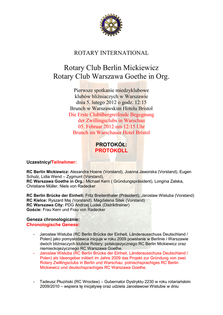 ROTARY INTERNATIONAL Rotary Club Berlin Mickiewicz Rotary Club Warszawa Goethe in Org. Pierwsze spotkanie miedzyklubowe klubów bliźniaczych w Warszawie dnia 5. lutego 2012 o godz. 12:15 Brunch w Warszawskim Hotelu Bristol Die Erste Clubübergreifende Begegnung der Zwillingsclubs in Warschau 05. Februar 2012 um 12:15 Uhr Brunch im Warschauer Hotel Bristol PROTOKÓŁ: PROTOKOLL Uczestnicy/Teilnehmer: RC Berlin Mickiewicz: Alexandra Hoene (Vorstand), Joanna Jaworska (Vorstand), Eugen Schulz, Lidia Wend – Zygmunt (Vorstand), RC Warszawa Goethe in Org.: Michael Kern ( Gründungspräsident), Longina Zalska, Christiane Müller, Niels von Radecker RC Berlin Brücke der Einheit: Fritz Breitenthaler (Präsident), Jaroslaw Wistuba (Vorstand) RC Kielce: Ryszard Maj (Vorstand), Magdalena Sitek (Vorstand) RC Warszawa City: PDG Andrzej Ludek (Distrikttreiner) Goście: Frau Kern und Frau von Radecker Geneza chronologicznie: Chronologische Genese: - - - Jarosław Wistuba (RC Berlin Brücke der Einheit, Länderausschuss Deutschland / Polen) jako pomysłodawca inicjuje w roku 2009 powstanie w Berlinie i Warszawie dwóch bliźniaczych klubów Rotary: polskojezycznego RC Berlin Mickiewicz oraz niemieckojezycznego RC Warszawa Goethe. Jaroslaw Wistuba (RC Berlin Brücke der Einheit, Länderausschuss Deutschland / Polen) als Ideengeber initiiert im Jahre 2009 das Projekt zur Gründung von zwei Rotary Zwillingsclubs in Berlin und Warschau: polnischsprachiges RC Berlin Mickiewicz und deutschsprachiges RC Warszawa Goethe. Tadeusz Płuziński (RC Wrocław) – Gubernator Dystryktu 2230 w roku rotariańskim 2009/2010 – wspiera tę inicjatywę oraz udziela Jarosławowi Wistubie w dniu - - - - - - - - - - - - 04.03.2010 pełnomocnictwa, aby podjął wszelkie niezbędne działania służące urzeczywistnieniu pomysłu założycielskiego. Tadeusz Płuziński (RC Wrocław) - der Gouverneur des Distrikts 2230 im rotarischen Jahr 2009/2010 - unterstützt die Initiative und bevollmächtigt am 04.03.2010 Freund Jarosław Wistuba, alle notwendigen Maßnahmen zu ergreifen, die zur Verwirklichung der Gründungsidee dienen würden. DG Tadeusz Płuziński w imieniu RC Wroclaw deklaruje gotowość sponsorowania obu mających powstać klubów bliźniaczych. DG Tadeusz Płuziński erklärt sich im Namen des RC Wrocław bereit, beide zu entstehenden Zwillingsclubs zu sponsern. RC Berlin Brücke der Einheit podejmuje inicjatywę swojego członka Jarosława Wistuby i również decyduje się sponsorować oba kluby w Berlinie oraz Warszawie. Inicjatywę tę popierają również obie sekcje Komitetu Międzykrajowego (ICC PL / D) RC Berlin Brücke der Einheit folgt der Initiative seines Mitglieds Freund Jarosław Wistuba und entscheidet sich ebenso, beide zu entstehenden Clubs in Berlin und Warschau zu sponsern. Die Initiative findet auch Unterstützung beider Sektionen des Länderausschusses D / PL. DG Dieter Brandt – urzędujący Gubernator Dystryktu 1940 udziela zgody na utworzenie polskojęzycznego (j.urzedowy niem.) klubu pod nazwą RC Berlin Mickiewicz. Dieter Bradt – der amtierende Gouverneur des Distrikts 1940 erteilt seine Einwilligung, einen polnischsprachigen (Amtssprache Deutsch) Rotary Club namens RC Berlin Mickiewicz zu gründen DG Dieter Brandt mianuje na prośbę Jarosława Wistuby PDG Karla Ziegera pełnomocnikiem ds. utworzenia RC Berlin Mickiewicz, którego macierzysty klub RC Potsdam przyłącza się do sponsorowania. DG Dieter Brandt ernennt auf Bitte von Freund Wistuba PDG Karl Zieger zum Gründungsbeauftragten des RC Berlin Mickiewicz, dessen Mutterklub RC Potsdam sich dem Sponsoring von RC Berlin Mickiewicz ebenso anschließt. Inicjator Jarosław Wistuba i Pełnomocnik Gubernatora Karl Zieger doprowadzają w ciągu ok. roku do czarteru RC Berlin Mickiewicz. Der Initiator Jarosław Wistuba und der Gründungsbeauftragte Karl Zieger führen gemeinsam im Laufe von ca. einem Jahr zur Charterfeier des RC Berlin Mickiewicz. Dzieki sympatii i pomocy PDG Tadeusza Pluzinskiego, PDG Dietera Brandta, PDG Piotra Wygnanczuka, PDG Hansa Jürgena Frerkera, DG Myroslava Gavryliva oraz DG Bernda Neubüsera czarter RC Berlin Mickiewicz odbywa się 02..09.2011 roku w Berlinie. Klub liczy wówczas 27 człoków. Obecnie rozwija się dynamicznie, oczekujac na wyczarterowanie „brata blizniaka” w Warszawie. Dank Sympathie und Unterstützung von PGD Tadeusz Płuziński, PDG Dieter Brandt, PDG Piotr Wygnańczuk, PDG Hans-Jürgen Frerker, DG Myroslav Gavryliv und DG Bernd Neubüser findet am 02.09.2011 in Berlin die Chartefeier des RC Berlin Mickiewicz statt. Der Klub zählt bei der Charterfeier 27 Mitglieder. Zurzeit entwickelt sich der Klub dynamisch, indem er auf die Charterfeier seines „Zwillingsbruders“ wartet. DG Tadeusz Płuziński udziela Jarosławowi Wistubie oraz na jego prośbę PDG Andrzejowi Ludkowi w dniu 15.03.2010 pełnomocnictwa do utworzenia w Warszawie niemieckojęzycznego (j.urzedowy polski) klubu RC Warszawa Goethe. Andrzej Ludek - - - - - - deklaruje przejęcie prac organizacyjnych w Warszawie oraz współsponsorowanie przez jego macierzysty RC Warszawa City mających powstać klubów bliźniaczych. DG Tadeusz Płuziński beauftragt am 15.03.2010 Freund Jarosław Wistuba und auf dessen Bitte Freund PDG Andrzej Ludek, in Warschau, einen deutschsprachigen (Amtssprache Polnisch) RC Warszawa Goethe zu gründen. Andrzej Ludek erklärt sich bereit, die organisatorischen Arbeiten in Warschau zu übernehmen sowie im Namen seines RC Warszawa City, beide zu entstehenden Clubs mitzusponsoren. Na ręce Andrzeja Ludka płyną z Berlina (i nie tylko) pierwsze nazwiska potencjalnych kandydatow, materialy szkoleniowo – informacyjne w jez. niemieckim oraz informacje o postępach działań założycielskich w Berlinie. Zu Händen von Freund Andrzej Ludek kommen aus Berlin (und nicht nur) die ersten Namen der potentiellen Kandidaten, Schulungsmaterialien in deutscher Sprache sowie Informationen über die Fortschritte bei