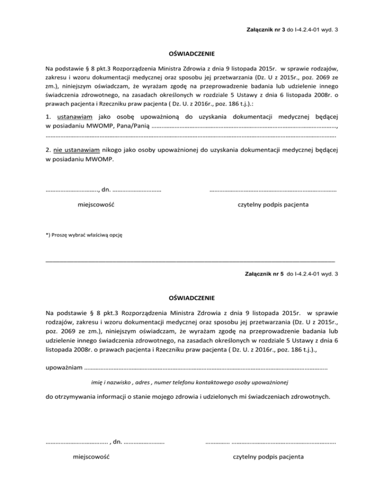 Załącznik nr 3 do I-4.2.4-01 wyd. 3 OŚWIADCZENIE Na podstawie § 8 pkt.3 Rozporządzenia Ministra Zdrowia z dnia 9 listopada 2015r. w sprawie rodzajów, zakresu i wzoru dokumentacji medycznej oraz sposobu jej przetwarzania (Dz. U z 2015r., poz. 2069 ze zm.), niniejszym oświadczam, że wyrażam zgodę na przeprowadzenie badania lub udzielenie innego świadczenia zdrowotnego, na zasadach określonych w rozdziale 5 Ustawy z dnia 6 listopada 2008r. o prawach pacjenta i Rzeczniku praw pacjenta ( Dz. U. z 2016r., poz. 186 t.j.).: 1. ustanawiam jako osobę upoważnioną do uzyskania dokumentacji medycznej będącej w posiadaniu MWOMP, Pana/Panią ……..……………………………………………………………………………………………, ……………………………………………………………………………………………………………………………………………………………. 2. nie ustanawiam nikogo jako osoby upoważnionej do uzyskania dokumentacji medycznej będącej w posiadaniu MWOMP. ………………………….., dn. ………………………… …………………………………………………………………… miejscowość czytelny podpis pacjenta *) Proszę wybrać właściwą opcję __________________________________________________________________________________ Załącznik nr 5 do I-4.2.4-01 wyd. 3 OŚWIADCZENIE Na podstawie § 8 pkt.3 Rozporządzenia Ministra Zdrowia z dnia 9 listopada 2015r. w sprawie rodzajów, zakresu i wzoru dokumentacji medycznej oraz sposobu jej przetwarzania (Dz. U z 2015r., poz. 2069 ze zm.), niniejszym oświadczam, że wyrażam zgodę na przeprowadzenie badania lub udzielenie innego świadczenia zdrowotnego, na zasadach określonych w rozdziale 5 Ustawy z dnia 6 listopada 2008r. o prawach pacjenta i Rzeczniku praw pacjenta ( Dz. U. z 2016r., poz. 186 t.j.)., upoważniam ………………………………………………………………………………………………………………………………….. imię i nazwisko , adres , numer telefonu kontaktowego osoby upoważnionej do otrzymywania informacji o stanie mojego zdrowia i udzielonych mi świadczeniach zdrowotnych. ……………………………….. , dn. ……………………. miejscowość …………… ………………………………………………………. czytelny podpis pacjenta
