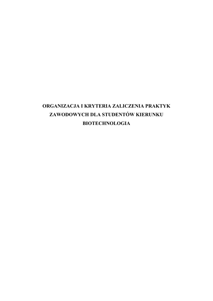 ORGANIZACJA I KRYTERIA ZALICZENIA PRAKTYK ZAWODOWYCH DLA STUDENTÓW KIERUNKU BIOTECHNOLOGIA INSTRUKCJA DOTYCZĄCA PRAKTYK ZAWODOWYCH dla studentów II roku Biotechnologii Informacje ogólne: Praktyki trwają 4 tygodnie i mogą odbywać się w okresie 1 lipca – 30 września (w wyjątkowych sytuacjach istnieje możliwość odbycia praktyki w innym miesiącu, wymaga to jednak specjalnej zgody dyrektora Zakładu Praktyk) Student może odbyć praktykę za granicą jednak wymaga to specjalnej zgody dyrektora Zakładu Praktyk Na spotkaniu informacyjnym z koordynatorem praktyki studenci zostaną poinformowani o sposobie załatwienia formalności związanych z praktyką Formalności przed praktyką: 1. W celu uzgodnienia praktyki student odbiera z Zakładu Praktyk CEU UO, (ul. Katowicka 87A 45-060 Opole) skierowanie na praktykę oraz drukuje zamieszczone na stronie internetowej Samodzielnej Katedry Biotechnologii i Biologii Molekularnej dokumenty: list intencyjny do instytucji, w której ma odbyć się praktyka (załącznik 1) regulamin praktyki (załącznik 2) i jej ramowy program (załącznik 3) druk zgody instytucji, w której ma się odbyć praktyka (załącznik 4) Z wyżej wymienionymi dokumentami student zgłasza się do miejsca przyszłej praktyki. 2. Po uzyskaniu zgody na odbycie praktyki w docelowym miejscu zostanie wyznaczony opiekun praktyki, który opracowuje szczegółowy zakres praktyki (druk w załączniku 5), zgodny z Ramowym Programem Praktyki. 3. Do koordynatora praktyk na uczelni (ul. Kominka 6a, pokój 311) student dostarcza następujące dokumenty: Podpisaną zgodę instytucji, w której odbędzie się praktyka Szczegółowy plan praktyki (do zatwierdzenia przez koordynatora praktyk) 4. Po zatwierdzeniu szczegółowego planu praktyki przez koordynatora praktyki student dostarcza do Zakładu Praktyk uzupełnione w miejscu przyszłej praktyki skierowanie. 5. Należy również dostarczyć kserokopię polisy ubezpieczenia NNW 6. Następnie Zakład Praktyk przygotowuje umowę w dwóch egzemplarzach dla instytucji, w której będą się odbywały praktyki. Student dostarcza podpisany egzemplarz do Zakładu Praktyk. 7. Przed rozpoczęciem praktyki student otrzymuje ankietę dla interesariusza (załącznik 6) oraz rejestruje w Katedrze wydrukowany i wypełniony dziennik praktyk (załącznik 7) Formalności w trakcie praktyki: 1. Student zabiera ze sobą na praktykę regulamin praktyki (załącznik 2) oraz dziennik praktyki. 2. W trakcie praktyki student dokumentuje w dzienniku czynności wykonywane w miejscu praktyki, które potwierdza opiekun praktyki. 3. Praktyki mogą być wizytowane przez pracownika Samodzielnej Katedry Biotechnologii i Biologii Molekularnej. Zaliczenie praktyk 1. Po zakończeniu praktyki student dostarcza do opiekuna praktyk na uczelni do dnia 10 października: dziennik praktyk wraz z opinią z miejsca praktyki (opinia musi zawierać wyszczególnione umiejętności, zakres wiedzy oraz kompetencje społeczne, które student nabył w trakcie praktyki oraz ocenę wystawioną przez opiekuna) wypełnioną przez opiekuna praktyk ankietę dla interesariusza 2. Zaliczenie praktyki następuje na ocenę. Podstawą do wystawienia oceny pozytywnej jest opinia i ocena uzyskana od opiekuna praktyki oraz wypełniony dziennik praktyk. Ocena jest średnią z oceny uzyskanej od opiekuna praktyki i oceny dziennika praktyk. 3. Student, który nie uzyskał pozytywnej opinii od opiekuna praktyki lub nie odbył praktyki nie otrzymuje zaliczenia. Kontakt: dr Anna Pańczyszyn [email protected] ul. Kominka 6a pok. 311 tel. 077 4016047 Załącznik 2 REGULAMIN PRAKTYK STUDENCKICH 1) Student zobowiązany jest do terminowego rozpoczęcia praktyki. Osoby, które rozpoczynają praktykę z opóźnieniem bez względu na powody, będą ją miały przedłużoną o analogiczną liczbę dni. W przypadku wystąpienia okoliczności uniemożliwiających studentowi stawienie sie w wyznaczonym terminie w Zakładzie Pracy, w której ma odbyć praktykę, musi on o tym fakcie powiadomić zakładowego opiekuna praktyk oraz opiekuna praktyk z ramienia Uniwersytetu Opolskiego. 2) Każda nieobecność w pracy powinna być usprawiedliwiona odpowiednim wpisem do dzienniczka praktyki lub zaświadczeniem lekarskim. W przypadku długotrwałej choroby student ma prawo ubiegać się o udzielenie urlopu dziekańskiego z koniecznością odbycia praktyki w roku następnym. 3) W miejscu praktyk praktykant powinien (od poniedziałku do piątku w trybie dziennym). przebywać 6 godzin dziennie 4) Student po przybyciu na praktykę powinien zostać przeszkolony z zakresu przepisów BHP i P.poż oraz zapoznać się z organizacją zakładu pracy, regulaminem/przepisami obowiązującymi w Zakładzie Pracy, a także z dokumentacją, oprogramowaniem, aparaturą, sprzętem związanymi z pełnieniem obowiązków na zajmowanym stanowisku pracy. 5) W Zakładzie Pracy wyznaczana jest imiennie osoba pełniąca funkcję opiekuna praktykanta – służąca pomocą, sprawująca nadzór nad przyjmowanym studentem i dokonująca stosownych wpisów dokumentujących praktykę. 6) Przedstawiciel uczelni będący opiekunem kierunkowym praktyki jest przełożonym studentów odbywających praktykę. Współodpowiada on za realizację praktyki zgodnie z jej celem i ustalonym programem, jest upoważniony do rozstrzygania wspólnie z pracodawcą - opiekunem praktykanta - spraw związanych z realizacją programu i przebiegiem praktyki. 7) Uczelnia sprawuje nadzór nad prawidłowym przebiegiem praktyk - możliwe są hospitacje prowadzone przez kierunkowych opiekunów praktyk. 8) Podczas praktyki student zobowiązany jest do prowadzenia dziennika praktyk, w którym zapisuje codzienne czynności, uwagi i spostrzeżenia. Dziennik praktyk należy co najmniej raz w tygodniu przedkładać do sprawdzenia i do podpisu opiekunowi praktyk. 9) Instytucja przyjmująca studenta na praktykę na podstawie ważnego skierowania może zażądać od uczelni odwołania st