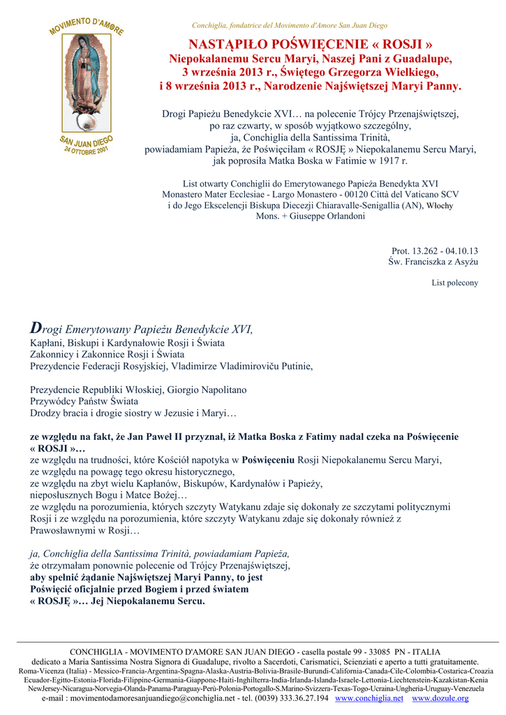 Conchiglia, fondatrice del Movimento d'Amore San Juan Diego NASTĄPIŁO POŚWIĘCENIE « ROSJI » Niepokalanemu Sercu Maryi, Naszej Pani z Guadalupe, 3 września 2013 r., Świętego Grzegorza Wielkiego, i 8 września 2013 r., Narodzenie Najświętszej Maryi Panny. Drogi Papieżu Benedykcie XVI… na polecenie Trójcy Przenajświętszej, po raz czwarty, w sposób wyjątkowo szczególny, ja, Conchiglia della Santissima Trinità, powiadamiam Papieża, że Poświęciłam « ROSJĘ » Niepokalanemu Sercu Maryi, jak poprosiła Matka Boska w Fatimie w 1917 r. List otwarty Conchiglii do Emerytowanego Papieża Benedykta XVI Monastero Mater Ecclesiae - Largo Monastero - 00120 Città del Vaticano SCV i do Jego Ekscelencji Biskupa Diecezji Chiaravalle-Senigallia (AN), Włochy Mons. + Giuseppe Orlandoni Prot. 13.262 - 04.10.13 Św. Franciszka z Asyżu List polecony Drogi Emerytowany Papieżu Benedykcie XVI, Kapłani, Biskupi i Kardynałowie Rosji i Świata Zakonnicy i Zakonnice Rosji i Świata Prezydencie Federacji Rosyjskiej, Vladimirze Vladimiroviču Putinie, Prezydencie Republiki Włoskiej, Giorgio Napolitano Przywódcy Państw Świata Drodzy bracia i drogie siostry w Jezusie i Maryi… ze względu na fakt, że Jan Paweł II przyznał, iż Matka Boska z Fatimy nadal czeka na Poświęcenie « ROSJI »… ze względu na trudności, które Kościół napotyka w Poświęceniu Rosji Niepokalanemu Sercu Maryi, ze względu na powagę tego okresu historycznego, ze względu na zbyt wielu Kapłanów, Biskupów, Kardynałów i Papieży, nieposłusznych Bogu i Matce Bożej… ze względu na porozumienia, których szczyty Watykanu zdaje się dokonały ze szczytami politycznymi Rosji i ze względu na porozumienia, które szczyty Watykanu zdaje się dokonały również z Prawosławnymi w Rosji… ja, Conchiglia della Santissima Trinità, powiadamiam Papieża, że otrzymałam ponownie polecenie od Trójcy Przenajświętszej, aby spełnić żądanie Najświętszej Maryi Panny, to jest Poświęcić oficjalnie przed Bogiem i przed światem « ROSJĘ »… Jej Niepokalanemu Sercu. CONCHIGLIA - MOVIMENTO D'AMORE SAN JUAN DIEGO - casella postale 99 - 33085 PN - ITALIA dedicato a Maria Santissima Nostra Signora di Guadalupe, rivolto a Sacerdoti, Carismatici, Scienziati e aperto a tutti gratuitamente. Roma-Vicenza (Italia) - Messico-Francia-Argentina-Spagna-Alaska-Austria-Bolivia-Brasile-Burundi-California-Canada-Cile-Colombia-Costarica-Croazia Ecuador-Egitto-Estonia-Florida-Filippine-Germania-Giappone-Haiti-Inghilterra-India-Irlanda-Islanda-Israele-Lettonia-Liechtenstein-Kazakistan-Kenia NewJersey-Nicaragua-Norvegia-Olanda-Panama-Paraguay-Perù-Polonia-Portogallo-S.Marino-Svizzera-Texas-Togo-Ucraina-Ungheria-Uruguay-Venezuela e-mail : [email protected] - tel. (0039) 333.36.27.194 www.conchiglia.net www.dozule.org Poświęcenie zostało dokonane w prywatnej Kaplicy ruchu Movimento d’Amore San Juan Diego, we wtorek, 3 września 2013 o godz. 16.00 podczas Mszy Świętej, odprawionej przez Kapłana, który towarzyszy ruchowi Movimento d’Amore San Juan Diego w pielgrzymkach do Dozulé oraz do innych miejsc światowego chrześcijaństwa we Francji, i zostało powtórzone w poszczególnych Parafiach i rodzinach, w zjednoczeniu ze wszystkimi przynależącymi do ruchu Movimento d’Amore San Juan Diego, dzisiaj, w niedzielę, 8 września 2013 o godz. 16.00, w święto Narodzenia NMP, w prywatnej Kaplicy ruchu Movimento d’Amore San Juan Diego, a to w celu ograniczenia i złagodzenia następnych szkód oraz przyszłych klęsk dla Ludzkości i Planety Ziemi. Ludzkość już zbiera złe owoce zasianych czynów i jeszcze więcej ich zbierze. Wszystko jest bliskie, poważne i ciężkie, ponieważ Ludzkość, w osobach, które się nie nawróciły, gdyż nie wierzą w Jezusa, Syna Bożego, który Sam jest Bogiem, jak jest napisane w Świętej Ewangelii, nie dostąpi zbawienia. OGROMNEJ POWAGI JEST MILCZENIE KOŚCIOŁA KATOLICKIEGO ODNOŚNIE BRAKU POŚWIĘCENIA, O KTÓRE PROSIŁA MARYJA, MATKA BOŻA I MATKA KOŚCIOŁA, PONIEWAŻ, JAK WYNIKA Z UKAZANYCH TUTAJ DOKUMENTÓW, JAN PAWEŁ II JASNO PRZYZNAŁ, ŻE MATKA BOSKA NADAL CZEKA NA POŚWIĘCENIE ROSJI. Drogi Emerytowany Papieżu Benedykcie XVI, Powiadamiam Papieża, że wykorzystałam to samo Poświęcenie, co Jan Paweł II, dodając wzmiankę o “ Rosji ”, a to za przyczyną i z powodu Powierzeń i Poświęceń, niezgodnych z żądaniem i Wolą Najświętszej Maryi Panny, dokonanych w Fatimie, 13 maja 1982 r. i w Rzymie, w niedzielę 25 marca 1984 r. o godz. 16.00. Jako że Kościół Katolicki uznał jako prawdziwe Objawienia Najświętszej Maryi Panny w Fatimie, dlaczego w swoich szczytach, do dzisiejszego dnia, Kościół jest nieposłuszny żądaniu i Woli Najświętszej Maryi Panny? Z powodu braku posłuszeństwa Kościoła wobec Maryi, wszyscy mogą stwierdzić wiele milionów ofiar od wtedy aż do dziś, ze straszliwym skutkiem: wielokrotne wojny, trzęsienia ziemi, powodzie, tsunami, radioaktywność, choroby, śmiertelne masowe szczepienia, epidemie, masowe ofiary z ludzi dla Szatana, ukryte pod maską nieszczęść oraz ukryte pod maską ataków terrorystycznych, handel niewolnikami, łącznie z kobietami i dziećmi, uchodźcy z każdej części świata, grabieże organów, ludzkie klonacje, ludzkie hybrydacje genetyczne, aborcja, maltretowanie zwierząt, zepsucie genetyczne Natury roślinnej i inne. Jeszcze większe i niewyobrażalne… pozostaje niebezpieczeństwo dla Ludzkości i dla Planety Ziemi. To jest źródło oryginalnego dokumentu z L’OSSERVATORE ROMANO, dziennika Stolicy Apostolskiej, zamieszczonego również w książce Christophera A. Ferrary – Tajemnica nadal ukryta: http://docs.google.com/viewer?a=v&q=cache:m9auwuWdbEJ:www.ilsegretoancoranascosto.it/pdf/appendice5.pdf+26+marzo+1984+l'osservatore+romano&hl=it&gl=it&pid=bl &srcid=ADGEESjyHM5UxJLHQrAklMDadr0p_kXoVWVj1flTTDPIOR3rtED5LxW85iAgA0RjRK_cOPgMDyjYZGQzgAW PrDKeKJdlQTzlcNSMF1Av8r8bEtmp8oG7PEkn