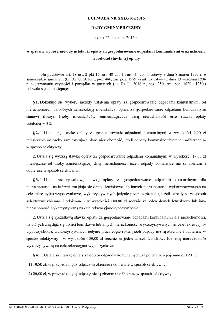 UCHWAŁA NR XXIX/166/2016 RADY GMINY BRZEZINY z dnia 22 listopada 2016 r. w sprawie wyboru metody ustalania opłaty za gospodarowanie odpadami komunalnymi oraz ustalenia wysokości stawki tej opłaty Na podstawie art. 18 ust. 2 pkt 15, art. 40 ust. l i art. 41 ust. 1 ustawy z dnia 8 marca 1990 r. o samorządzie gminnym (t.j. Dz. U. 2016 r., poz. 446, zm. poz. 1579.) i art. 6k ustawy z dnia 13 września 1996 r. o utrzymaniu czystości i porządku w gminach (t.j. Dz. U. 2016 r., poz. 250, zm. poz. 1020 i 1250.) uchwala się, co następuje: § 1. Dokonuje się wyboru metody ustalenia opłaty za gospodarowanie odpadami komunalnymi od nieruchomości, na których zamieszkują mieszkańcy, opłata za gospodarowanie odpadami komunalnymi stanowi iloczyn liczby mieszkańców zamieszkujących daną nieruchomość oraz stawki opłaty ustalonej w § 2. § 2. 1. Ustala się stawkę opłaty za gospodarowanie odpadami komunalnymi w wysokości 9,00 zł miesięcznie od osoby zamieszkującej daną nieruchomość, jeżeli odpady komunalne zbierane i odbierane są w sposób selektywny. 2. Ustala się wyższą stawkę opłaty za gospodarowanie odpadami komunalnymi w wysokości 17,00 zł miesięcznie od osoby zamieszkującej daną nieruchomość, jeżeli odpady komunalne nie są zbierane i odbierane w sposób selektywny. § 3. 1. Ustala się ryczałtową stawkę opłaty za gospodarowanie odpadami komunalnymi dla nieruchomości, na których znajdują się domki letniskowe lub innych nieruchomości wykorzystywanych na cele rekreacyjno-wypoczynkowe, wykorzystywanych jedynie przez część roku, jeżeli odpady są w sposób selektywny zbierane i odbierane - w wysokości 100,00 zł rocznie za jeden domek letniskowy lub inną nieruchomość wykorzystywaną na cele rekreacyjno-wypoczynkowe. 2. Ustala się ryczałtową stawkę opłaty za gospodarowanie odpadami komunalnymi dla nieruchomości, na których znajdują się domki letniskowe lub innych nieruchomości wykorzystywanych na cele rekreacyjnowypoczynkowe, wykorzystywanych jedynie przez część roku, jeżeli odpady nie są zbierane i odbierane w sposób selektywny - w wysokości 150,00 zł rocznie za jeden domek letniskowy lub inną nieruchomość wykorzystywaną na cele rekreacyjno-wypoczynkowe. § 4. 1. Ustala się stawkę opłaty za odbiór odpadów komunalnych, za pojemnik o pojemności 120 1: 1) 10,80 zł, w przypadku, gdy odpady są zbierane i odbierane w sposób selektywny; 2) 20,00 zł, w przypadku, gdy odpady nie są zbierane i odbierane w sposób selektywny. Id: 1DB4FDD6-4D6B-4C31-8F9A-7D7E583D02C7. Podpisany Strona 1 z 2 2. Ustalona w ust. 1 stawka za pojemnik o pojemności 120 1 stanowi podstawę do ustalenia ryczałtowej stawki opłaty za gospodarowanie odpadami komunalnymi dla nieruchomości, na których znajdują się domki letniskowe lub innych nieruchomości wykorzystywanych na cele rekreacyjno-wypoczynkowe, wykorzystywanych jedynie przez część roku. § 5. Określenie wysokości opłaty ustalonej w § 2 i § 3 nastąpi na podstawie deklaracji o wysokości opłaty za gospodarowanie odpadami komunalnymi, której wzór zostanie określony odrębną uchwałą. § 6. Traci moc uchwała Nr VIII/65/2015 z dnia 25 czerwca 2015 r. w sprawie wyboru metody ustalania opłaty za gospodarowanie odpadami komunalnymi oraz ustalania wysokości stawki tej opłaty. § 7. Wykonanie uchwały powierza się Wójtowi Gminy Brzeziny. § 8. Uchwała wchodzi w życie po upływie 14 dni od dnia jej ogłoszenia w Dzienniku Urzędowym Województwa Łódzkiego z mocą obowiązującą od dnia 1 stycznia 2017 roku. Przewodniczący Rady Gminy Marek Kolasa Id: 1DB4FDD6-4D6B-4C31-8F9A-7D7E583D02C7. Podpisany Strona 2 z 2
