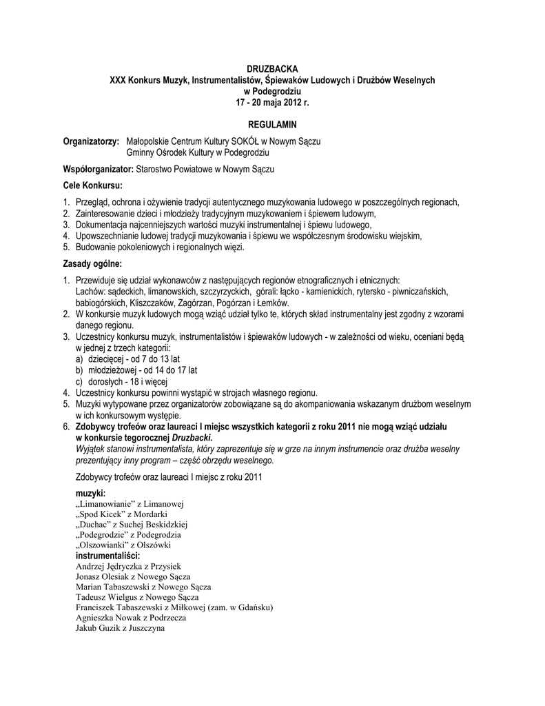DRUZBACKA XXX Konkurs Muzyk, Instrumentalistów, Śpiewaków Ludowych i Drużbów Weselnych w Podegrodziu 17 - 20 maja 2012 r. REGULAMIN Organizatorzy: Małopolskie Centrum Kultury SOKÓŁ w Nowym Sączu Gminny Ośrodek Kultury w Podegrodziu Współorganizator: Starostwo Powiatowe w Nowym Sączu Cele Konkursu: 1. 2. 3. 4. 5. Przegląd, ochrona i ożywienie tradycji autentycznego muzykowania ludowego w poszczególnych regionach, Zainteresowanie dzieci i młodzieży tradycyjnym muzykowaniem i śpiewem ludowym, Dokumentacja najcenniejszych wartości muzyki instrumentalnej i śpiewu ludowego, Upowszechnianie ludowej tradycji muzykowania i śpiewu we współczesnym środowisku wiejskim, Budowanie pokoleniowych i regionalnych więzi. Zasady ogólne: 1. Przewiduje się udział wykonawców z następujących regionów etnograficznych i etnicznych: Lachów: sądeckich, limanowskich, szczyrzyckich, górali: łącko - kamienickich, rytersko - piwniczańskich, babiogórskich, Kliszczaków, Zagórzan, Pogórzan i Łemków. 2. W konkursie muzyk ludowych mogą wziąć udział tylko te, których skład instrumentalny jest zgodny z wzorami danego regionu. 3. Uczestnicy konkursu muzyk, instrumentalistów i śpiewaków ludowych - w zależności od wieku, oceniani będą w jednej z trzech kategorii: a) dziecięcej - od 7 do 13 lat b) młodzieżowej - od 14 do 17 lat c) dorosłych - 18 i więcej 4. Uczestnicy konkursu powinni wystąpić w strojach własnego regionu. 5. Muzyki wytypowane przez organizatorów zobowiązane są do akompaniowania wskazanym drużbom weselnym w ich konkursowym występie. 6. Zdobywcy trofeów oraz laureaci I miejsc wszystkich kategorii z roku 2011 nie mogą wziąć udziału w konkursie tegorocznej Druzbacki. Wyjątek stanowi instrumentalista, który zaprezentuje się w grze na innym instrumencie oraz drużba weselny prezentujący inny program – część obrzędu weselnego. Zdobywcy trofeów oraz laureaci I miejsc z roku 2011 muzyki: „Limanowianie” z Limanowej „Spod Kicek” z Mordarki „Duchac” z Suchej Beskidzkiej „Podegrodzie” z Podegrodzia „Olszowianki” z Olszówki instrumentaliści: Andrzej Jędryczka z Przysiek Jonasz Olesiak z Nowego Sącza Marian Tabaszewski z Nowego Sącza Tadeusz Wielgus z Nowego Sącza Franciszek Tabaszewski z Miłkowej (zam. w Gdańsku) Agnieszka Nowak z Podrzecza Jakub Guzik z Juszczyna Samuel Guzik z Juszczyna Ewa Ptak z Tęgoborza Marzena Żmuda z Olszówki mistrz i uczeń: Jakub Rusiecki z Niedźwiedzia drużbowie weselni: Józef Tokarczyk z Mordarki Tadeusz Woźniak z Witowic Dolnych starosta weselny: Stanisław Źrałka z Piwnicznej-Zdroju grupy śpiewacze: żeńska grupa „Dolina Popradu” z Piwnicznej-Zdroju męska grupa „Dolina Popradu” z Piwnicznej-Zdroju żeńska z Podegrodzia (dorosła) męska „Skalnik” z Kamionki Wielkiej żeńska „Zbójnik” ze Skawicy żeńska z Podegrodzia (młodzieżowa) „Mali Lipniczanie” z Lipnicy Wielkiej śpiewacy soliści: Zuzanna Jędrzejek z Limanowej Dawid Ciągło z Podegrodzia Sabina Polak z Suchej Beskidzkiej Grzegorz Poręba z Męciny 7. Uczestnicy biorący udział w konkursie po raz pierwszy oraz wskazani przez organizatora, zobowiązani są do nadesłania kasety magnetofonowej lub płyty CD z nagraniem roboczym swojego repertuaru lub poddania się konsultacji organizatora, co będzie warunkiem kwalifikacji do konkursu. 8. Całość występów konkursowych rejestrowana będzie przez Małopolskie Centrum Kultury SOKÓŁ w Nowym Sączu w celach dokumentacyjnych i szkoleniowych. I. KONKURS MUZYK LUDOWYCH 1. Muzyki mogą wykonywać po 4 - 5 utworów. 2. Wybrane utwory powinny obrazować bogactwo muzyczne regionu. 3. Program muzyczny może być urozmaicony przyśpiewkami ludowymi wykonywanymi przez członków muzyki jeśli jest to zgodne z tradycją. 4. Skrzypek nie może wystąpić w konkursie w dwóch muzykach w charakterze prymisty. 5. W przypadkach losowych dopuszcza się do występu muzykę w niepełnym składzie ale wyłącznie w porozumieniu z organizatorami 6. Czas występu do 10 minut. KRYTERIA OCENY: skład muzyki - dobór instrumentów właściwych dla regionu, dobór repertuaru, technika wykonania, czystość brzmienia, zachowanie charakteru gry własnego regionu. II. KONKUKRS INSTRUMENTALISTÓW LUDOWYCH 1. W konkursie mogą wziąć udział wyłącznie instrumentaliści - soliści (bez towarzyszenia muzyk lub innych instrumentów), którzy zaprezentują melodie związane z własnym regionem. 2. Z jednej kapeli biorącej udział w konkursie muzyk, może wystąpić indywidualnie tylko jeden (najlepszy) muzyk wytypowany przez członków kapeli. 3. Pożądane jest zaprezentowanie starych ludowych instrumentów muzycznych właściwych dla danego regionu. 4. Uczestnik konkursu może zagrać na kilku różnych instrumentach. 5. Dopuszcza się przyśpiewki do wykonywanej melodii na instrumencie jeśli jest to zgodne z tradycją. 6. Czas występu do 5 minut. KRYTERIA OCENY: wybór melodii właściwych dla swojego regionu, zachowanie w grze specyfiki i zdobnictwa muzycznego swojego regionu, wybór instrumentu (wskazana jest gra na zanikających tradycyjnych instrumentach ludowych takich jak: fujarka, okaryna, heligonka), czystość brzmienia i technika opanowania instrumentu, ogólny wyraz muzyczny. III. KONKURS ŚPIEWAKÓW LUDOWYCH 1. 2. 3. 4. 5. W konkursie mogą wziąć udział śpiewacy lub zespoły śpiewacze (liczące nie więcej niż 10 osób). Uczestnicy winni zaprezentować stare, tradycyjne melodie charakterystyczne dla własnego regionu. Grupa śpiewacza może wytypować tylko jednego śpiewaka (najlepszego) do występu indywidualnego. Śpiewacy występują w konkursie bez towarzyszenia muzyki (a cappella). Czas występu do 5 minut. KRYTERIA OCENY: dobór melodii i tekstów gwarowych właściwych dla prezentowanego regionu, zachowanie właściwego wykonawstwa dla prezentowanego regionu, czystość brzmienia, ogólny wyraz artystyczny. IV. KONKURS "MISTRZ - UCZEŃ" 1.
