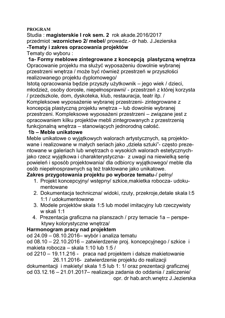 PROGRAM Studia : magisterskie I rok sem. 2 rok akade.2016/2017 przedmiot :wzornictwo 2/ mebel/ prowadz.- dr hab. J.Jezierska -Tematy i zakres opracowania projektów Tematy do wyboru : 1a- Formy meblowe zintegrowane z koncepcją plastyczną wnętrza Opracowanie projektu ma służyć wyposażeniu dowolnie wybranej przestrzeni wnętrza / może być również przestrzeń w przyszłości realizowanego projektu dyplomowego/ Istotą opracowania będzie przyszły użytkownik – jego wiek / dzieci, młodzież, osoby dorosłe, niepełnosprawni/ - przestrzeń z której korzysta / przedszkole, dom, dyskoteka, klub, restauracja, teatr itp. / Kompleksowe wyposażenie wybranej przestrzeni- zintegrowane z koncepcją plastyczną projektu wnętrza – lub dowolnie wybranej przestrzeni. Kompleksowe wyposażeni przestrzeni – związane jest z opracowaniem kilku projektów mebli zintegrowanych z przestrzenią funkcjonalną wnętrza – stanowiących jednorodną całość. 1b – Meble unikatowe Meble unikatowe o wyjątkowych walorach artystycznych, są projektowane i realizowane w małych seriach jako „dzieła sztuki”- często prezentowane w galeriach lub wnętrzach o wysokich walorach estetycznychjako rzecz wyjątkowa i charakterystyczna- z uwagi na niewielką serię powieleń i sposób projektowania/ dla odbiorcy wyjątkowego/ meble dla osób niepełnosprawnych są też traktowane jako unikatowe. Zakres przygotowania projektu po wyborze tematu-/ pełny/ 1. Projekt koncepcyjny/ wstępny/ szkice,makietka robocza- udokumentowane 2. Dokumentacja techniczna/ widoki, rzuty, przekroje,detale skala l:5 1:1 / udokumentowane 3. Modele projektów skala 1:5 lub model imitacyjny lub rzeczywisty w skali 1:1 4. Prezentacja graficzna na planszach / przy temacie 1a – perspektywy kolorystyczne wnętrza/ Harmonogram pracy nad projektem od 24.09 – 08.10.2016– wybór i analiza tematu od 08.10 – 22.10.2016 – zatwierdzenie proj. koncepcyjnego / szkice i makieta robocza – skala 1:10 lub 1:5 / od 2210 – 19.11.216 - praca nad projektem i dalsze makietowanie 26.11.2016- zatwierdzenie projektu do realizacji dokumentacji i makiety/ skala 1:5 lub 1: 1/ oraz prezentacji graficznej od 03.12.16 – 21.01.2017– realizacja zadania do oddania / zaliczenie/ opr. dr hab.arch.wnętrz J.Jezierska