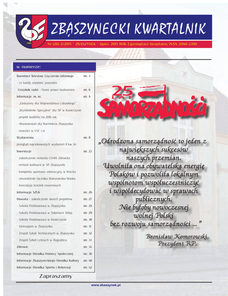 ZBASZYNECKI KWARTALNIK , Nr (26) 2/2015 * ZBĄSZYNEK * lipiec 2015 ROK Egzemplarz bezpłatny ISSN 2080-2390 w numerze: Burmistrz Wiesław Czyczerski informuje str. 3 - co każdy wiedzieć powinien Urzędnik radzi - Nowe prawo budowlane Informacje, m. in: str. 6 str. 8 - „Zasłużony dla Województwa Lubuskiego” - „Wyróżnienie Specjalne” dla SP w Kosieczynie - projekt budżetu na 2016 rok - Absolutorium dla Burmistrza Zbąszynka - nowości w USC c.d. Wydarzenia „ str. 11 przegląd najciekawszych wydarzeń II kw. br. Inwestycje str. 23 - zakończenie remontu CUMiS Zdrowita - remont kotłowni w SP Zbąszynek - kompleks sportowo rekreacyjny w Kręcku - utwardzenie łącznika Warszawska-Wąska - koncepcja ścieżek rowerowych Informacje SZUK str. 26 Oświata - zakończenie dwóch projektów str. 27 - Szkoła Podstawowa w Zbąszynku str. 28 - Szkoła Podstawowa w Dąbrówce Wlkp. str. 29 - Szkoła Podstawowa w Kosieczynie str. 30 - Gimnazjum w Zbąszynku str. 31 - Zespół Szkół Technicznych w Zbąszynku str. 32 - Zespół Szkół Leśnych w Rogozińcu str. 33 Zdrowie str. 34 Informacje Ośrodka Pomocy Społecznej str. 36 Informacje Zbąszyneckiego Ośrodka Kultury str. 40 Informacje Ośrodka Sportu i Rekreacji str. 42 Zapraszamy www.zbaszynek.pl „ ZBASZYNECKI KWARTALNIK , INWESTYCJE ZBASZYNECKI KWARTALNIK , Wydawca: Urząd Miejski w Zbąszynku ul. Rynek 1 66-210 Zbąszynek Tel. 68 384 91 40; fax: 66 384 94 84 Nakład: 1 500 egzemplarzy. Autorzy tekstów i zdjęć: pracownicy Urzędu Miejskiego w Zbąszynku i jednostek organizacyjnych pod redakcją Sekretarza Gminy. e-mail: [email protected] 2 www.zbaszynek.pl ZBASZYNECKI KWARTALNIK , BURMISTRZ WIESŁAW CZYCZERSKI INFORMUJE Wiesław Czyczerski CO KAŻDY WIEDZIEĆ POWINIEN Szanowni Mieszkańcy! W tym roku mija 25 lat od powstania gminnych samorządów. W 1990 roku diametralnie zmieniły się zasady sprawowania władzy w gminach. Zaczęliśmy, jako obywatele, mieć decydujący wpływ na rozwój naszej „małej ojczyzny”. Jubileusze powodują różnego rodzaju podsumowania, analizy i dyskusje na temat minionych lat, o tym co się udało, co można było wykonać lepiej, a co jest jeszcze do zrobienia. Minione 25 lat to niewiele, a już o pewnych sprawach i wydarzeniach zapominamy, zmieniamy chronologię itp. Postanowiłem w tym krótkim artykule spróbować podsumować te lata, przypomnieć najważniejsze „minione” inwestycje i tematy, którymi się zajmowaliśmy. W pierwszej kadencji cieszyły nas nawet drobne inwestycje. Ułożenie kawałka chodnika i uporządkowanie terenu stawało się wydarzeniem. Startowaliśmy co prawda jak na tamte czasy z dobrej pozycji. Mieliśmy wodociągi, a w mieście nawet kanalizację. PKP i Spółdzielnia Mieszkaniowa wybudowały nam bloki a więc mieliśmy mieszkania i skokowy wzrost ilości mieszkańców. Odziedziczyliśmy nowy ośrodek zdrowia z mieszkaniami dla lekarzy, nową szkołę przy ul. Sportowej z mieszkaniami dla nauczycieli, nową szkołę w Dąbrówce Wielkopolskiej, nowe przedszkole przy ul. Małej, miejsca pracy na PKP, czyli całkiem przyzwoicie. Brakowało natomiast dobrej wody o odpowiednim ciśnieniu, telefonów, gazu, dobrych dróg, chodników, kanalizacji na wsiach i oczyszczalni ścieków, uzbrojonych terenów inwestycyjnych oraz alternatywy dla PKP. Radni I kadencji pełni zapału zabrali się za tworzenie nowego prawa gminnego i inwestycje, rozpoczynając budowę stacji uzdatniania wody i gazyfikację. Były to duże wyzwania. Szczególnie, że zaczęły się problemy w przedsiębiorstwie PKP. Rozpoczęły się masowe zwolnienia, zaczęło przybywać bezrobotnych (zjawisko całkowicie nowe w Zbąszynku), osiągnęliśmy poziom ponad 35 % bezrobocia - dzisiaj niewyobrażalny. II kadencja to kontynuacja rozpoczętej gazyfikacji i zakończenie budowy stacji uzdatniania wody. Rozpoczęto tematy związane z drogami i chodnikami. Najważniejsze to mo- dernizacja ulic: Kilińskiego, Szerokiej, Bydgoskiej, Gdańskiej oraz budowa dróg na nowym osiedlu Topolowa II, czy jak niektórzy mówią osiedlu „Literatów”, budowa sali sportowej w Kosieczynie. Jednak najważniejszym stało się dążenie do zmniejszenia bezrobocia. Rozpoczęły się pierwsze rozmowy i zabieganie o inwestorów. III kadencja to podpisanie porozumienia z firmą Swedwood i rozpoczęcie inwestycji (sierpień 1999) w Chlastawie, związane z poniesieniem znacznych wydatków na porządkowanie i uzbrojenie terenów inwestycyjnych w media. Oceniając z perspektywy czasu opłaciło się bezrobocie zaczęło się zmniejszać. III kadencja to również okres korzystania ze środków tzw. przedakcesyjnych Unii Europejskiej. Środki te pozwalały na kontynuację gazyfikacji i zmianę systemów grzewczych w szkołach i innych obiektach komunalnych. Kontynuowaliśmy budowę i modernizację dróg takich jak: Zbąszyńska, Poznańska, Dworcowa w Dąbrówce Wlkp., Wojska Polskiego, chodniki i droga przy Swedwood w Chlastawie, ul. Mała w Kosieczynie. Rozpoczyna się okres przejmowania od PKP różnych zbędnych im obiektów i terenów. Przejęliśmy byłe koszary, dom „Pod zegarem”, Dom Kultury, przychodnię PKP, budynek komitetu partii i tereny przyległe, przedszkole przy ul. Kasprowicza. IV kadencja to rozpoczęcie kanalizacji w naszych wioskach. Chlastawa z odbudową drogi, Kosieczyn, z zamianą bruku tzw. „kocich łbów” na asfalt (dzisiaj zmora kierowców podobnie jak wtedy „kocie łby”), połączenie Kosieczyna z Chlastawą kolektorem sanitarnym i wodociągiem. Najważniejsza i największa inwestycja to budowa oczyszczalni ścieków. IV kadencja to rozpoczęcie korzystania ze środków Unii Europejskiej, to nowe programy rozwoju. Zwiększyliśmy ilość projektów drogowych, weszliśmy w program tzw. „Schetynówek” - jako jedyna gmina w woj. lubuskim skorzystaliśmy ze wszystkich rozdań tego programu. Pierwszy projekt to ul. Topolowa i Sportowa, następnie PCK, Czarna Droga, obwodnica północn