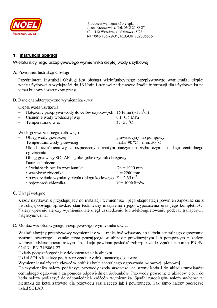 Producent wymienników ciep a Jacek Krzeszowiak, Tel. 0508 25 88 27 53 – 442 Wroc aw, ul. Spi&owa 15/28 NIP 883-136-79-31, REGON 932836665 1. Instrukcja obs ugi Wielofunkcyjnego przep#ywowego wymiennika ciep#ej wody u(ytkowej A. Przedmiot Instrukcji Obs ugi Przedmiotem Instrukcji Obs ugi jest obs uga wielofunkcyjnego przep ywowego wymiennika ciep ej wody u&ytkowej o wydajno0ci do 16 l/min i stanowi podstawowe 2ród o informacji dla u&ytkownika na temat budowy i warunków pracy. B. Dane charakterystyczne wymiennika c.w.u. Ciep a woda u&ytkowa – Nat8&enie przep ywu wody do celów u&ytkowych 16 l/min (~1 m3/h) – Ci0nienie wody wodoci<gowej 0,1÷0,5 MPa – Temperatura c.w.u. 37÷55 oC Woda grzewcza obiegu kot owego – Obieg wody grzewczej grawitacyjny lub pompowy – Temperatura wody grzewczej maks. 90 oC min. 50 oC – Uk ad bezci0nieniowy zabezpieczony otwartym naczyniem wzbiorczym instalacji centralnego ogrzewania – Obieg grzewczy SOLAR – glikol jako czynnik obiegowy – Dane techniczne • 0rednica zbiornika wymiennika Dz = 1000 mm • wysoko0E zbiornika L = 2200 mm • powierzchnia wymiany ciep a obiegu kot owego F = 2,35 m2 • pojemno0E zbiornika V = 1000 litrów C. Uwagi wst8pne Ka&dy u&ytkownik przyst8puj<cy do instalacji wymiennika i jego eksploatacji powinien zapoznaE si8 z instrukcj< obs ugi, sprawdziE stan techniczny urz<dzenia i jego wyposa&enia oraz jego kompletno0E. Nale&y upewniE si8 czy wymiennik nie uleg uszkodzeniu lub zdekompletowaniu podczas transportu i magazynowania. D. Monta& wielofunkcyjnego przep ywowego wymiennika c.w.u. Wielofunkcyjny przep ywowy wymiennik c.w.u. mo&e byE w <czony do uk adu centralnego ogrzewania systemu otwartego i zamkni8tego pracuj<cego w uk adzie grawitacyjnym lub pompowym z kot em wodnym niskotemperaturowym. Instalacja powinna posiadaE zabezpieczenie zgodne z norm< PN-/B02413 i BN-71/8864-27. Uk ady po <czeI zgodnie z dokumentacj< dla obiektu. Uk ad SOLAR nale&y pod <czyE zgodnie z dokumentacj< dostawcy. Wymiennik nale&y zabudowaE w pobli&u kot a centralnego ogrzewania, w pozycji pionowej. Do wymiennika nale&y pod <czyE przewody wody grzewczej od strony kot a i do uk adu ruroci<gów centralnego ogrzewania za pomoc< odpowiednich 0rubunków. Przewody powrotne z uk adów c.o. i do kot a nale&y pod <czyE do odpowiednich króEców wymiennika. Spadki ruroci<gów nale&y wykonaE w kierunku do kot a zarówno dla przewodu zasilaj<cego jak i powrotnego. Tak samo nale&y pod <czyE uk ad SOLAR. KróEce rezerwowe nale&y za0lepiE odpowiednimi korkami. Wod8 wodoci<gow< nale&y doprowadziE do wymiennika rur< ½”, od odpowiednich króEców montuj<c zawór odcinaj<cy, zawór zwrotny zabezpieczaj<cy przed cofaniem wody gor<cej do sieci oraz trójnik dla przewodu do zaworu mieszaj<cego trójdro&nego. Pod <czenie do w8&ownicy nale&y wykonaE 0rubunkiem ½” Odp yw ciep ej wody u&ytkowej nale&y wykonaE z odpowiedniego króEca wymiennika za pomoc< 0rubunku ½” i zabudowaE zawór mieszaj<cy, którego zadaniem jest utrzymanie zadanej temperatury wody u&ytkowej. Ruroci<g nale&y w <czyE do sieci ciep ej wody u&ytkowej obiektu. Po wykonaniu w/w robót nale&y sprawdziE szczelno0E po <czeI przez próbne nape nienie uk adu, a nast8pnie zaizolowaE ruroci<gi. Po w/w próbie nale&y odwodniE uk ad przez dolny korek wymiennika i skontrolowaE czysto0E powierzchni w wymienniku. Ruroci<g wody wodoci<gowej nale&y przep ukaE wod< wodoci<gow< do najbli&szego odbioru. Po wykonaniu w/w czynno0ci przep ywowy wymiennik c.w.u. jest gotowy do eksploatacji. E. Uruchomienie i u&ytkowanie wielofunkcyjnego przep ywowego wymiennika c.w.u. Po uruchomieniu kot a wodnego i osi<gni8ciu odpowiedniej temperatury wody grzewczej mo&na u&ytkowaE instalacj8 ciep ej wody u&ytkowej ustawiaj<c zaworem trójdro&nym mieszaj<cym odpowiedni< temperatur8 wody. Okresowo nale&y sprawdzaE stan nape nienia z adu wod< z kontrol< wyp ywu z rury bezpieczeIstwa naczynia wzbiorczego. Eksploatacja wymiennika i uk adu jest bezpieczna i nie stwarza zagro&enia dla obs ugi i obiektu. Temperatura wody u&ytkowej jest funkcj< temperatury wody grzewczej z kot a. W uk adzie pompowym utrzymuje si8 sta a temperatura wody w kotle, a reguluje si8 temperatur8 w obiegu centralnego ogrzewania zaworem mieszaj<cym. F. Konserwacja Przep ywowy wymiennik c.w.u. wymaga okresowej kontroli czysto0ci po sezonie grzewczym przez spuszczenie wody przez dolny korek i ewentualne wyczyszczenie wn8trza. W czasie eksploatacji nale&y kontrolowaE szczelno0E po <czeI gwintowanych oraz stan izolacji ciep ochronnej. Konserwacj8 uk adu SOLAR nale&y prowadziE wed ug instrukcji dostawcy. G. Zasady bezpieczeIstwa przy obs udze kot a i wymiennika c.w.u. – – – – Na przewodzie hydraulicznym <cz<cym kocio i wymiennik c.w.u. z naczyniem wzbiorczym nie wolno instalowaE &adnych zaworów ani innej armatury zmniejszaj<cej przekrój wewn8trzny Naczynie wzbiorcze, rura zbiorcza, rura przelewowa i sygnalizacyjna nie powinny znajdowaE si8 ca kowicie w pomieszczeniu, w którym temperatura mo&e spadaE poni&ej 0 oC Przed rozpaleniem kot a nale&y upewniE si8, czy poziom wody w naczyniu wzbiorczym jest w a0ciwy, a woda nie jest zamarzni8ta Nie wolno dopu0ciE do zagotowania si8 wody w kotle – temperatura wody powinna zawsze byE ni&sza ni& 90 oC Uwagi: Do instrukcji nale&y do <czyE rysunek zestawczy i schematy w <czenia wymiennika ciep ej wody u&ytkowej do instalacji centralnego ogrzewania.