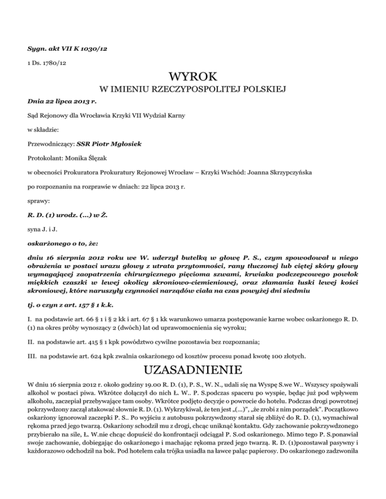 Sygn. akt VII K 1030/12 1 Ds. 1780/12 WYROK W IMIENIU RZECZYPOSPOLITEJ POLSKIEJ Dnia 22 lipca 2013 r. Sąd Rejonowy dla Wrocławia Krzyki VII Wydział Karny w składzie: Przewodniczący: SSR Piotr Mgłosiek Protokolant: Monika Ślęzak w obecności Prokuratora Prokuratury Rejonowej Wrocław – Krzyki Wschód: Joanna Skrzypczyńska po rozpoznaniu na rozprawie w dniach: 22 lipca 2013 r. sprawy: R. D. (1) urodz. (...) w Ż. syna J. i J. oskarżonego o to, że: dniu 16 sierpnia 2012 roku we W. uderzył butelką w głowę P. S., czym spowodował u niego obrażenia w postaci urazu głowy z utrata przytomności, rany tłuczonej lub ciętej skóry głowy wymagającej zaopatrzenia chirurgicznego pięcioma szwami, krwiaka podczepcowego powłok miękkich czaszki w lewej okolicy skroniowo-ciemieniowej, oraz złamania łuski lewej kości skroniowej, które naruszyły czynności narządów ciała na czas powyżej dni siedmiu tj. o czyn z art. 157 § 1 k.k. I. na podstawie art. 66 § 1 i § 2 kk i art. 67 § 1 kk warunkowo umarza postępowanie karne wobec oskarżonego R. D. (1) na okres próby wynoszący 2 (dwóch) lat od uprawomocnienia się wyroku; II. na podstawie art. 415 § 1 kpk powództwo cywilne pozostawia bez rozpoznania; III. na podstawie art. 624 kpk zwalnia oskarżonego od kosztów procesu ponad kwotę 100 złotych. UZASADNIENIE W dniu 16 sierpnia 2012 r. około godziny 19.00 R. D. (1), P. S., W. N., udali się na Wyspę S.we W.. Wszyscy spożywali alkohol w postaci piwa. Wkrótce dołączył do nich Ł. W.. P. S.podczas spaceru po wyspie, będąc już pod wpływem alkoholu, zaczepiał przebywające tam osoby. Wkrótce podjęto decyzje o powrocie do hotelu. Podczas drogi powrotnej pokrzywdzony zaczął atakować słownie R. D. (1). Wykrzykiwał, że ten jest „(...)”, „że zrobi z nim porządek”. Początkowo oskarżony ignorował zaczepki P. S.. Po wyjściu z autobusu pokrzywdzony starał się zbliżyć do R. D. (1), wymachiwał rękoma przed jego twarzą. Oskarżony schodził mu z drogi, chcąc uniknąć kontaktu. Gdy zachowanie pokrzywdzonego przybierało na sile, Ł. W.nie chcąc dopuścić do konfrontacji odciągał P. S.od oskarżonego. Mimo tego P. S.ponawiał swoje zachowanie, dobiegając do oskarżonego i machając rękoma przed jego twarzą. R. D. (1)pozostawał pasywny i każdorazowo odchodził na bok. Pod hotelem cała trójka usiadła na ławce paląc papierosy. Do oskarżonego zadzwoniła żona, M. D., która miała problem z zachowaniem płynności rozmowy ponieważ, R. D. (1)musiał ją przerywać na skutek zachowanie pokrzywdzonego. Po zakończonej rozmowie, w pewnym momencie P. S.po raz kolejny podbiegł do oskarżonego i przycisnął go swoim ciałem do ściany. Wówczas R. D. (1), chcąc go odepchnął, uderzył pokrzywdzonego trzymaną w reku butelką piwa. P. S.upadł na ziemię i stracił przytomność. Zadzwoniono po pogotowie ratunkowe. Oskarżony przebywał na miejscu zdarzenia do momentu odwiezienia P. S.do szpitala. Dowód: - zeznania świadków: P. S.: k. 3, 143-144; Ł. W.: k. 144, 26; W. N.: k. 144-145, 26 W wyniku zdarzenia pokrzywdzony doznał: rany tłuczonej lub ciętej skóry głowy, wymagającej zaopatrzenia chirurgicznego pięcioma szwami, krwiaka podczepcowego powłok miękkich czaszki w lewej okolicy skroniowociemieniowej, oraz złamania łuski lewej kości skroniowej, które naruszyły czynności narządów ciała na czas powyżej dni siedmiu. Dowód: - opinia sądowo-lekarska: k. 34-37; - dokumentacja medyczna: k. 95-102 Oskarżony R. D. (1) nigdy w swoim dotychczasowym życiu nie był karany sądownie. Aktualnie pracuje uzyskuje dochód w wysokości 3.000 zł, ma na utrzymaniu niepracującą żonę i dwójkę dzieci. Dowód: - dane o karalności: k. 25; - oświadczenie oskarżonego: k. 86; R. D. (2) w toku dochodzenia przyznał się częściowo do popełnienia zarzucanego mu czynu. Wyjaśniając stwierdził, że w dniu zdarzenia wraz z pokrzywdzonym oraz Ł. W. i W. N. przebywali na Wyspie S. we W. gdzie spożywali alkohol w postaci głównie piwa. Już wtedy P. S. wulgarnie odzywał się do ludzi wyzywając ich i zaczepiając. Jego zachowanie nasiliło się w drodze powrotnej, wówczas zaczął być agresywny także wobec oskarżonego. Wyzywał go słowami wulgarnymi oraz, podchodził na bliską odległość i wymachiwał rękoma przez R. D. (1). Kierował również pod jego adresem słowa: „ja cię zabiję”. Obserwując zachowanie pokrzywdzonego, Ł. W., starał się nie dopuścił pokrzywdzonego do oskarżonego, odciągając P. S.. Będąc pod hotelem, w którym nocowali, wszyscy usiedli na ławce, zachowanie pokrzywdzonego nie zmieniało się. W pewnym momencie, jak wyjaśniał oskarżony, został on przyciśnięty przez P. S. do ściany, chcąc go odepchnąć R. D. (1) uderzył pokrzywdzonego trzymaną w ręku butelką piwa marki L. o pojemności 0,5 litra. Pokrzywdzony stracił przytomność i upadł na ziemię. R. D. (1) wezwał karetkę pogotowia i czekał na miejscu na jej przybycie. O. w toku dochodzenia złożył wniosek o wydanie wyroku skazującego bez przeprowadzenia postępowania dowodowego i wymierzenie mu kary sześciu miesięcy pozbawienia wolności z warunkowym zawieszeniem jej wykonania na okres dwóch lat, grzywny 30 stawek dziennych po 10 zł każda stawka. Przed Sądem oskarżony R. D. (1) nie przyznał się do popełnienia zarzucanego mu czynu. Opisał zdarzenie w sposób zbieżny z wyjaśnieniami złożonymi w toku dochodzenia, dodając, że bał się o swoje bezpieczeństwo ponieważ nieustannie był atakowany przez pokrzywdzonego w drodze powrotnej z Wyspy S.. R. D. (1) wyjaśniał, iż rzeczywiście przestraszył się zachowania pokrzywdzonego gdy ten przyparł go do muru pod hotelem. Chcąc go do siebie odepchnąć nie zdawał sobie sprawy, że trzyma w ręku butelkę piwa. Jednocześnie R. D. (1) przeprosił na rozprawie głównej pokrzywdzonego za skutki uderzenia. Sąd zważył co następuje: W ocenie Sąd