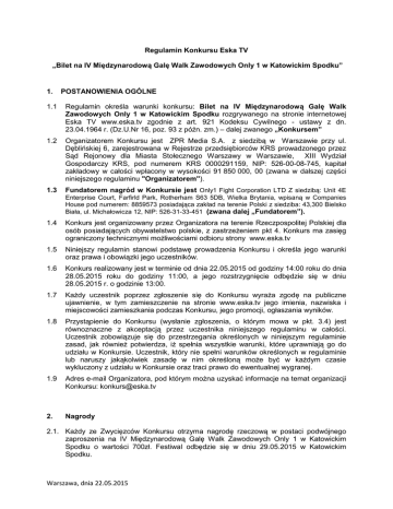 Regulamin Konkursu Eska TV „Bilet na IV Międzynarodową Galę Walk Zawodowych Only 1 w Katowickim Spodku” 1. POSTANOWIENIA OGÓLNE 1.1 Regulamin określa warunki konkursu: Bilet na IV Międzynarodową Galę Walk Zawodowych Only 1 w Katowickim Spodku rozgrywanego na stronie internetowej Eska TV www.eska.tv zgodnie z art. 921 Kodeksu Cywilnego - ustawy z dn. 23.04.1964 r. (Dz.U.Nr 16, poz. 93 z późn. zm.) – dalej zwanego „Konkursem” 1.2 Organizatorem Konkursu jest ZPR Media S.A. z siedzibą w Warszawie przy ul. Dęblińskiej 6, zarejestrowana w Rejestrze przedsiębiorców KRS prowadzonego przez Sąd Rejonowy dla Miasta Stołecznego Warszawy w Warszawie, XIII Wydział Gospodarczy KRS, pod numerem KRS 0000291159, NIP: 526-00-08-745, kapitał zakładowy w całości wpłacony w wysokości 91 850 000, 00 (zwana w dalszej części niniejszego regulaminu "Organizatorem"). 1.3 Fundatorem nagród w Konkursie jest Only1 Fight Corporation LTD Z siedzibą: Unit 4E Enterprise Court, Farfirld Park, Rotherham S63 5DB, Wielka Brytania, wpisaną w Companies House pod numerem: 8859573 posiadająca zakład na terenie Polski z siedziba: 43,300 Bielsko Biała, ul. Michałowicza 12, NIP: 526-31-33-451 (zwana dalej „Fundatorem”). 1.4 Konkurs jest organizowany przez Organizatora na terenie Rzeczpospolitej Polskiej dla osób posiadających obywatelstwo polskie, z zastrzeżeniem pkt 4. Konkurs ma zasięg ograniczony technicznymi możliwościami odbioru strony www.eska.tv 1.5 Niniejszy regulamin stanowi podstawę prowadzenia Konkursu i określa jego warunki oraz prawa i obowiązki jego uczestników. 1.6 Konkurs realizowany jest w terminie od dnia 22.05.2015 od godziny 14:00 roku do dnia 28.05.2015 roku do godziny 11:00, a jego rozstrzygnięcie odbędzie się w dniu 28.05.2015 r. o godzinie 13:00. 1.7 Każdy uczestnik poprzez zgłoszenie się do Konkursu wyraża zgodę na publiczne ujawnienie, w tym zamieszczenie na stronie www.eska.tv jego imienia, nazwiska i miejscowości zamieszkania podczas Konkursu, jego promocji, ogłaszania wyników. 1.8 Przystąpienie do Konkursu (wysłanie zgłoszenia, o którym mowa w pkt. 3.4) jest równoznaczne z akceptacją przez uczestnika niniejszego regulaminu w całości. Uczestnik zobowiązuje się do przestrzegania określonych w niniejszym regulaminie zasad, jak również potwierdza, iż spełnia wszystkie warunki, które uprawniają go do udziału w Konkursie. Uczestnik, który nie spełni warunków określonych w regulaminie lub naruszy jakąkolwiek zasadę w nim określoną może być w każdym czasie wykluczony z udziału w Konkursie oraz traci prawo do ewentualnej wygranej. 1.9 Adres e-mail Organizatora, pod którym można uzyskać informacje na temat organizacji Konkursu: [email protected] 2. Nagrody 2.1. Każdy ze Zwycięzców Konkursu otrzyma nagrodę rzeczową w postaci podwójnego zaproszenia na IV Międzynarodową Galę Walk Zawodowych Only 1 w Katowickim Spodku o wartości 700zł. Festiwal odbędzie się w dniu 29.05.2015 w Katowickim Spodku. Warszawa, dnia 22.05.2015 2.2 Organizator oświadcza, iż wszystkie nagrody obowiązującymi przepisami prawa podatkowego. 2.3 Organizator nie ponosi odpowiedzialności za niemożność odbioru lub nieodebranie którejkolwiek nagrody, z jakiejkolwiek przyczyny leżącej po stronie nagrodzonego uczestnika. 2.4 Organizator nie ponosi odpowiedzialności za zmianę miejsca zamieszkania i/lub podanego przez uczestnika Konkursu adresu lub zmianę innych danych – uniemożliwiającą kontakt z tym uczestnikiem lub odebranie przez niego zestawu nagród/nagrody. 2.5 O szczegółach odbioru i realizacji nagród zwycięzca Konkursu zostanie poinformowany przez Organizatora drogą mailową lub za pośrednictwem rozmowy telefonicznej. 2.6 Nagrody nie odebrane przez zwycięzcę Konkursu w terminie 30 dni od rozstrzygnięcia Konkursu pozostają własnością Fundatora. 2.7 Przy odbiorze przez zwycięzcę Konkursu nagrody zobowiązany jest on okazać dokument potwierdzający jego tożsamość lub w przypadku odbioru tej nagrody przez pełnomocnika zwycięzcy zobowiązany jest on okazać pisemne upoważnienie od zwycięzcy, który wygrał nagrodę, zawierające następujące informacje: imię nazwisko, adres, numer i seria dowodu osobistego, telefon kontaktowy tego zwycięzcy oraz adnotację o upoważnieniu określonej osoby do odbioru w jego imieniu danej nagrody, jak również podpis tego zwycięzcy wraz z danymi osoby odbierającej czyli imieniem, nazwiskiem, serią i numerem dowodu osobistego oraz telefonem odbiorcy. W przypadku niespełnienia przez osobę podającą się za pełnomocnika zwycięzcy powyższych warunków nagroda nie będzie jej wydany. 2.8 Wszystkie nagrody pozostają własnością Fundatora do momentu przekazania ich zwycięzcom Konkursu. 2.9 Nagrodę główną ufundowaną przez Fundatora zwycięzcy Konkursu przekaże Organizator . 3. zostaną wydane zgodnie z Zasady uczestnictwa w konkursie 3.1 Ogólne zasady Konkursu podawane są na stronie internetowej www.eska.tv, zakładka Konkursy. 3.2 W czasie trwania Konkursu odbędzie się jedna edycja Konkursu podczas której wyłoniony zostanie 1 Zwycięzca 3.3 Zwycięzcy zostaną ogłoszeni na stronie WWW oraz na Facebooku na stronie „Eska TV”. 3.4 W celu wzięcia udziału w Konkursie należy w dniach od 22.05.2015r. od godziny 14:00 do dnia 28.05.2015r do godziny 11:00: Wejść na stronę Eska.tv, otworzyć zakładkę Konkursy, znaleźć zakładkę z konkursem dotyczącym na IV Międzynarodową Galę Walk Zawodowych Only 1 w Katowickim Spodku i odszukać pytanie konkursowe, które brzmi: „Podaj chociaż jeden styl walki gali Only1 i uzasadnij dlaczego to Ty powinieneś wygrać podwójny bilet na IV Międzynarodową Galę Walk Zawodowych Only 1 w Katowickim Spodku”, oraz wysłać na adres [email protected] odpowiedź na powyższe pytanie. Warszawa, dnia 22.05.2015 3.5 Zgłoszenia do Konkursu należy dokonać na adres: [email protected] mailowe powinno zaw