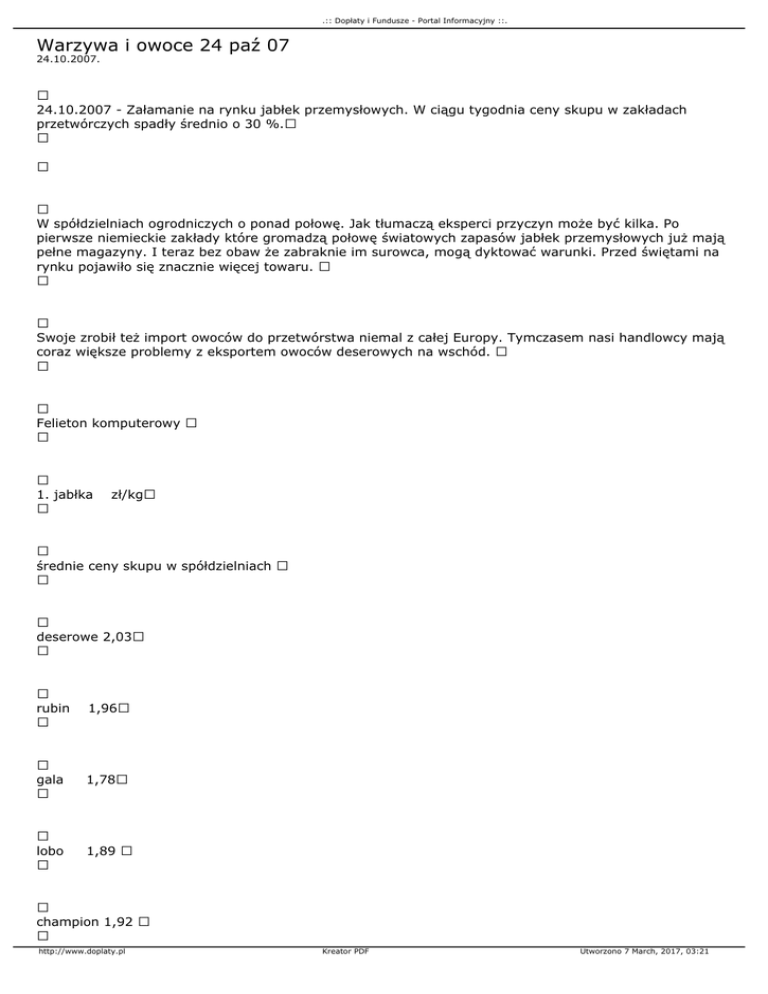 .:: Dopłaty i Fundusze - Portal Informacyjny ::. Warzywa i owoce 24 paź 07 24.10.2007. 24.10.2007 - Załamanie na rynku jabłek przemysłowych. W ciągu tygodnia ceny skupu w zakładach przetwórczych spadły średnio o 30 %. W spółdzielniach ogrodniczych o ponad połowę. Jak tłumaczą eksperci przyczyn może być kilka. Po pierwsze niemieckie zakłady które gromadzą połowę światowych zapasów jabłek przemysłowych już mają pełne magazyny. I teraz bez obaw że zabraknie im surowca, mogą dyktować warunki. Przed świętami na rynku pojawiło się znacznie więcej towaru. Swoje zrobił też import owoców do przetwórstwa niemal z całej Europy. Tymczasem nasi handlowcy mają coraz większe problemy z eksportem owoców deserowych na wschód. Felieton komputerowy 1. jabłka zł/kg średnie ceny skupu w spółdzielniach deserowe 2,03 rubin 1,96 gala 1,78 lobo 1,89 champion 1,92 http://www.doplaty.pl Kreator PDF Utworzono 7 March, 2017, 03:21 .:: Dopłaty i Fundusze - Portal Informacyjny ::. gruszki 2,50 Źródło IERiGŻ Spadek cen w przetwórniach pociągnął za sobą obniżki również owoców konsumpcyjnych. Choć tu przeceny są zdecydowanie skromniejsze. W zależności od odmiany jabłka staniały od kilku do kilkunastu groszy za kilogram. Tanieją także gruszki. 2. warzywa ceny skupu w spółdzielniach kalafiory 2,20 – 2,70 zł/szt. brokuły 1,80 – 2,80 zł/szt. Marchew 0,35 – 0,80 zł/kg Kapusta biała 0,34 – 0,45 zł/kg Buraki 0,30 – 0,60 Źródło IERiGŻ Co dziwne o tej porze roku drożeją za to warzywa, i to nie tylko ciepłolubne, ale przede wszystkim kalafiory, brokuły a nawet kapusta i marchew. http://www.doplaty.pl Kreator PDF Utworzono 7 March, 2017, 03:21 .:: Dopłaty i Fundusze - Portal Informacyjny ::. Agnieszka Niemcewicz/TVP Informacje Rolnicze http://www.doplaty.pl Kreator PDF Utworzono 7 March, 2017, 03:21