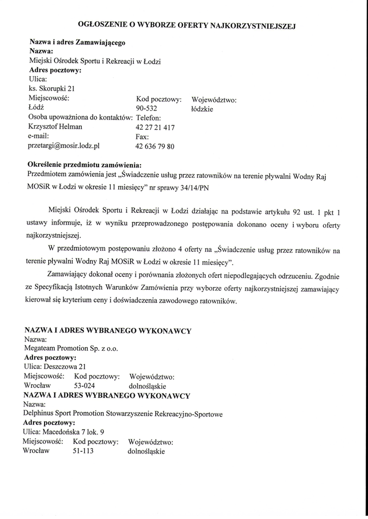 OGLOSZENIE O WYBORZE OFERTY NAJKORZYSTNIEJSZEJ Nazwa i adres Zamawiaj^cego Nazwa: Miejski Osrodek Sportu i Rekreacji w Lodzi Adres pocztowy: Ulica: ks. Skorupki 21 Miejscowosc:Kod pocztowy: Wojewodztwo: Lodz90-532lodzkie Osoba upowazniona do kontaktow: Telefon: Krzysztof Helman42 27 21 417 e-mail:Fax: [email protected] 636 79 80 Okreslenie przedmiotu zamowienia: Przedmiotem zamowienia jest ,,Swiadczenie uslug przez ratownikow na terenie plywalni Wodny Raj MOSiR w Lodzi w okresie 11 miesiecy" nr sprawy 34/14/PN Miejski Osrodek Sportu i Rekreacji w Lodzi dzialaj^c na podstawie artykulu 92 ust. 1 pkt 1 ustawy informuje, iz w wyniku przeprowadzonego postepowania dokonano oceny iwyboru oferty naj korzy stniej szej. W przedmiotowym postepowaniu zlozono 4 oferty na ,,Swiadczenie uslug przez ratownikow na terenie plywalni Wodny Raj MOSiR w Lodzi w okresie 11 miesiecy". Zamawiaj^cy dokonal oceny i porownania zlozonych ofert niepodlegaj^cych odrzuceniu. Zgodnie ze SpecyfikacJ^ Istotnych Warunkow Zamowienia przy wyborze oferty najkorzystniejszej zamawiaj^cy kierowal sie kryterium ceny i doswiadczenia zawodowego ratownikow. NAZWA I ADRES WYBRANEGO WYKONAWCY Nazwa: Megateam Promotion Sp. z o.o. Adres pocztowy: Ulica: Deszczowa 21 Miejscowosc: Kod pocztowy: Wojewodztwo: Wroclaw53-024dolnoslaskie NAZWA I ADRES WYBRANEGO WYKONAWCY Nazwa: Delphinus Sport Promotion Stowarzyszenie Rekreacyjno-Sportowe Adres pocztowy: Ulica: Macedonska 7 lok. 9 Miejscowosc: Kod pocztowy: Wojewodztwo: Wroclaw51-113dolnosl^skie Wykaz i porownanie zlozonych ofert Numer Nazwa (firma) i adres oferty wykonawcy Streszczenie Kryterium Cena/ spelnienia Doswiadczenia Punktacja warunkow udzialu ratownikow waga (90 %) w postepowaniu i Waga (10%) Punktacja RAZEM oceny ofert ,,Sport Academy" Maciej Tylus Wykonawca nie ul. Grzebien51,97-500 1 Radomsko e-mail: [email protected] spelnia warunkow 197.372,60 zl/ udzialu w -pkt postepowaniu, -pkt - oferta podlega odrzuceniu Konsorcjum: Wykonawca Megateam Promotion Sp. z o.o. spelnia warunki udzialu w ul. Deszczowa 21, 53-024 Wroclaw postepowaniu, e-mail: biuro(a),megateam.com.pl 2 Delphinus Sport Promotion Stowarzyszenie Rekreacyjno- oferta nie podlega 200.061,60 zl/ 88,85 pkt odrzuceniu 10 pkt 98,85 10 pkt 91,21 5 pkt 95,00 Sportowe ul. Macedonska 7 lok. 9, 51- 113 Wroclaw e-mail: [email protected] Multigrupa Sp. z o.o. Wykonawca ul. Rynek 20/21 lok. 15, 50-111 3 Wroclaw e-mail: 218.880,00 zl/ 81,21 pkt mirocki@multigrupa. com spelnia warunki udzialu w postepowaniu, oferta nie podlega odrzuceniu Ratownictwo Wodne Szkola Wykonawca Plywania i Sportow Wodnych 4 ul.Rojna 69 A, 91-134 Lodz e-mail: [email protected] spelnia warunki 197.507,05 zl/ udzialu w 90 pkt postepowaniu, oferta nie podlega odrzuceniu Na podstawie oceny spelnienia warunkow udzialu w post^powaniu oraz kryterium oceny ofert ustalono, iz oferta nr 2 zlozona przez Konsorcjum: Megateam Promotion Sp. z o.o. Delphinus Sport Promotion Stowarzyszenie Rekreacyjno-Sportowe odpowiada wszystkim wymaganiom okreslonym w ustawie Pzp oraz w Specyfikacji Istotnych Warunkow Zamdwienia i zostala oceniona jako najkorzystniejsza w oparciu o podane w SIWZ kryterium wyboru. Lodz, dnia 12 stycznia 2015 r. (podpis kierownika Zamawi^j^cego)