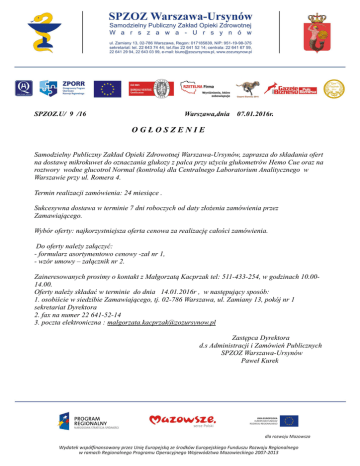 SPZOZ.U/ 9 /16 Warszawa,dnia 07.01.2016r. OGŁOSZENIE Samodzielny Publiczny Zakład Opieki Zdrowotnej Warszawa-Ursynów, zaprasza do składania ofert na dostawę mikrokuwet do oznaczania glukozy z palca przy użyciu glukometrów Hemo Cue oraz na roztwory wodne glucotrol Normal (kontrola) dla Centralnego Laboratorium Analitycznego w Warszawie przy ul. Romera 4. Termin realizacji zamówienia: 24 miesiące . Sukcesywna dostawa w terminie 7 dni roboczych od daty złożenia zamówienia przez Zamawiającego. Wybór oferty: najkorzystniejsza oferta cenowa za realizację całości zamówienia. Do oferty należy załączyć: - formularz asortymentowo cenowy -zał nr 1, - wzór umowy – załącznik nr 2. Zaineresowanych prosimy o kontakt z Małgorzatą Kacprzak tel: 511-433-254, w godzinach 10.0014.00. Oferty należy składać w terminie do dnia 14.01.2016r , w następujący sposób: 1. osobiście w siedzibie Zamawiającego, tj. 02-786 Warszawa, ul. Zamiany 13, pokój nr 1 sekretariat Dyrektora 2. fax na numer 22 641-52-14 3. poczta elektroniczna : [email protected] Zastępca Dyrektora d.s Administracji i Zamówień Publicznych SPZOZ Warszawa-Ursynów Paweł Kurek