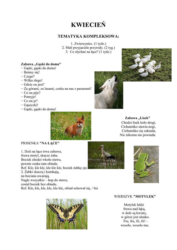 KWIECIEŃ TEMATYKA KOMPLEKSOWA: 1. Zwierzyniec. (1 tydz.) 2. Mali przyjaciele przyrody. (2 tyg.) 3. Co słychać na łące? (1 tydz.) Zabawa „Gąski do domu” − Gąski, gąski do domu! − Boimy się! − Czego? − Wilka złego! − Gdzie on jest? − Za górami, za lasami, czeka na nas z pazurami! − Co on pije? − Pomyje! − Co on je? − Gąseczki! − Gąski, gąski do domu! Zabawa „Lisek” Chodzi lisek koło drogi, Cichuteńko stawia nogi, Cichuteńko się zakrada, Nic nikomu nie powiada. PIOSENKA "NA ŁĄCE" 1. Dziś na łące trwa zabawa, fruwa motyl, skacze żaba. Bociek chodzi wkoło stawu, pewnie szuka tam obiadu. Ref. Kle, kle kle, kle kle kle, bociek żabkę zje. / bis 2. Żabki skaczą i kumkają, na bociana uważają. Nagle wszystkie – hop do stawu, został bociek bez obiadu. Ref. Kle, kle, kle, kle, kle kle, obiad schował się. / bis WIERSZYK "MOTYLEK" Motylek lekki fruwa nad łąką, w dole są kwiaty, w górze jest słonko. Fru, fru, fii, fii! – wesoło, wesoło mu. Zamierzenia dydaktyczno-wychowawcze na kwiecień: poznawanie nazw zwierząt hodowanych na wsi; rozwijanie umiejętności liczenia; poznawanie zwierząt egzotycznych; kształtowanie pojęć matematycznych: duży, mały; kształtowanie odpowiedzialności za stan środowiska przyrodniczego; promowanie aktywnego spędzania czasu w gronie rodzinnym; nauka piosenki; rozróżnianie różnych materiałów: papieru, plastiku, szkła, metalu; rozwijanie mowy; rozwijanie umiejętności malowania; wykorzystywanie prostych instrumentów do grania; rozwijanie poczucia rytmu; rozwijanie umiejętności integracji z rówieśnikami; obserwowanie przyrody; rozwijanie sprawności manualnej.