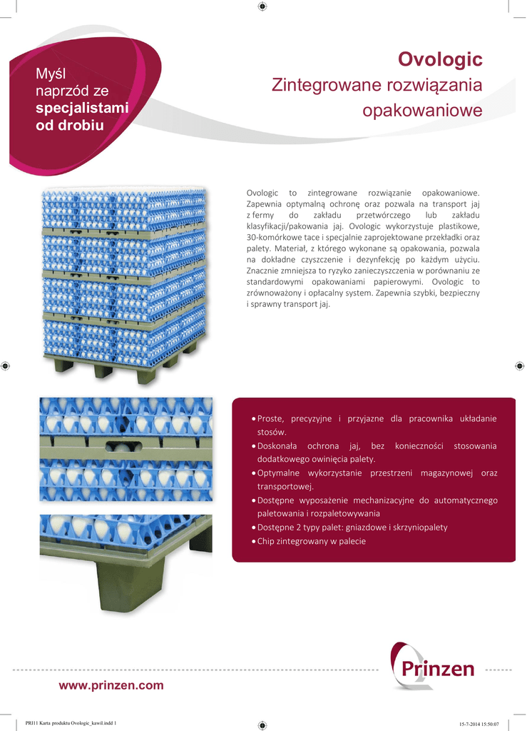 Myśl naprzód ze specjalistami od drobiu Ovologic Zintegrowane rozwiązania opakowaniowe Ovologic to zintegrowane rozwiązanie opakowaniowe. Zapewnia optymalną ochronę oraz pozwala na transport jaj z fermy do zakładu przetwórczego lub zakładu klasyfikacji/pakowania jaj. Ovologic wykorzystuje plastikowe, 30-komórkowe tace i specjalnie zaprojektowane przekładki oraz palety. Materiał, z którego wykonane są opakowania, pozwala na dokładne czyszczenie i dezynfekcję po każdym użyciu. Znacznie zmniejsza to ryzyko zanieczyszczenia w porównaniu ze standardowymi opakowaniami papierowymi. Ovologic to zrównoważony i opłacalny system. Zapewnia szybki, bezpieczny i sprawny transport jaj. Proste, precyzyjne i przyjazne dla pracownika układanie stosów. Doskonała ochrona jaj, bez konieczności stosowania dodatkowego owinięcia palety. Optymalne wykorzystanie przestrzeni magazynowej oraz transportowej. Dostępne wyposażenie mechanizacyjne do automatycznego paletowania i rozpaletowywania Dostępne 2 typy palet: gniazdowe i skrzyniopalety Chip zintegrowany w palecie www.prinzen.com PRI11 Karta produktu Ovologic_kawil.indd 1 15-7-2014 15:50:07 Ovologic Zintegrowane rozwiązania opakowaniowe Charakterystyka techniczna• Pojemność pełnej palety to 10 800 jaj (stos wysoki na 5 warstw) lub maksymalnie 12 960 jaj (stos wysoki na 6 warstw). Najbardziej popularne są palety zawierające 5 warstw. Wymagane elementy na jedną paletę jaj: Liczba jaj 30-komórkowe tace Przekładki Ovologic Paleta Ovologic 10 800 360 4 1 12 960 432 5 1 Taca 30-komórkowa została Przekładki pełnią dwie funkcje: pokrywy zaprojektowana tak, aby chroniącej szczyt stosu oraz podstawy dla wygodnie ustawiać stosy oraz kolejnej warstwy. chronić każde jajo z osobna. Góra palety ma taki sam profil jak przekładka, aby umożliwić błyskawiczne ustawianie stosu. Pozwala również na równe układanie tac. Wymiary paczki do transportu (bez jaj): Ovologic Wymiary Waga (tolerancja wagi) Ilość (na potrzeby transportu) Wysokość palety (na potrzeby transportu) Taca 30 x 30 cm 144 gramy (+/- 3 gramy) 5000 210 cm Przekładka 120 x 90 cm 3700 gramów (+/- 65 gramów) 70 238 cm Paleta 120 x 90 cm 11 300 gramów (+/- 200 gramów) 44 240 cm Na potrzeby transportu palety i przekładki Ovologic zostały specjalnie zaprojektowane, aby ułatwić układanie stosów. Paleta z przekładkami może utrzymać do 70 sztuk. Palety można układać w stosy po 44 szt. (w tym paleta transportowa). Prinzen, spółka Grupy Vencomatic PRI11 Karta produktu Ovologic_kawil.indd 2 15-7-2014 15:50:09