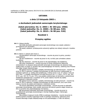 LexPolonica nr 28750. Stan prawny 2013-01-01 Dz.U.2010.80.526 (U) Dochody jednostek samorządu terytorialnego USTAWA z dnia 13 listopada 2003 r. o dochodach jednostek samorządu terytorialnego (tekst pierwotny: Dz. U. 2003 r. Nr 203 poz. 1966) (tekst jednolity: Dz. U. 2008 r. Nr 88 poz. 539) (tekst jednolity: Dz. U. 2010 r. Nr 80 poz. 526) Rozdział 1 Przepisy ogólne Art. 1. Ustawa określa: 1) źródła dochodów jednostek samorządu terytorialnego oraz zasady ustalania i gromadzenia tych dochodów; 2) zasady ustalania i przekazywania subwencji ogólnej oraz dotacji celowych z budżetu państwa. Art. 2. Ilekroć w ustawie jest mowa o: 1) jednostkach samorządu terytorialnego - rozumie się przez to gminy, powiaty i województwa; 2) roku budżetowym - rozumie się przez to rok, na który jest uchwalana ustawa budżetowa; 3) roku bazowym - rozumie się przez to rok poprzedzający rok budżetowy; 4) liczbie mieszkańców - rozumie się przez to liczbę mieszkańców faktycznie zamieszkałych na obszarze danej jednostki samorządu terytorialnego lub obszarze kraju, według stanu na dzień 31 grudnia roku poprzedzającego rok bazowy, ustaloną przez Prezesa Głównego Urzędu Statystycznego; 5) ogólnej kwocie wpływów z podatku dochodowego od osób fizycznych - rozumie się przez to 100 % wpływów z podatku dochodowego od osób fizycznych, pobieranego na zasadach ogólnych, tj. według skali podatkowej, o której mowa w art. 27 ustawy z dnia 26 lipca 1991 r. o podatku dochodowym od osób fizycznych (Dz. U. z 2010 r. Nr 51, poz. 307, Nr 57, poz. 352 i Nr 75, poz. 473), oraz podatku pobieranego od dochodów z pozarolniczej działalności gospodarczej w wysokości 19 %; przez wpływy rozumie się wpłaty pomniejszone o dokonane zwroty; 6) ogólnej kwocie wpływów z podatku dochodowego od osób prawnych - rozumie się przez to 100 % wpływów z podatku dochodowego od osób prawnych, przy czym przez wpływy rozumie się wpłaty pomniejszone o dokonane zwroty; 7) nowych jednostkach samorządu terytorialnego - rozumie się przez to jednostki samorządu terytorialnego, które zostały utworzone lub których granice uległy zmianie po dniu 31 grudnia roku poprzedzającego rok bazowy; 8) reprezentacji jednostek samorządu terytorialnego - rozumie się przez to przedstawicieli samorządu terytorialnego w Komisji Wspólnej Rządu i Samorządu Terytorialnego; 9) produkcie krajowym brutto (PKB) na jednego mieszkańca - rozumie się przez to średnią wartość produktu krajowego brutto na jednego mieszkańca, ogłoszoną przez Prezesa Głównego Urzędu Statystycznego za rok poprzedzający o 3 lata rok bazowy; 10) stopie bezrobocia i liczbie bezrobotnych - rozumie się przez to stopę bezrobocia i liczbę bezrobotnych, ustalone przez Prezesa Głównego Urzędu Statystycznego według stanu na dzień 31 grudnia roku poprzedzającego rok bazowy; 11) gęstości zaludnienia - rozumie się przez to liczbę mieszkańców przypadających na jeden kilometr kwadratowy danej jednostki samorządu terytorialnego lub kraju, ustaloną przez Prezesa Głównego Urzędu Statystycznego według stanu na dzień 31 grudnia roku poprzedzającego rok bazowy; 12) 13) przewodniczącym zarządu jednostki samorządu terytorialnego - rozumie się przez to również wójta (burmistrza, prezydenta miasta); 14) podatniku podatku dochodowego od osób prawnych, posiadającym siedzibę na obszarze odpowiednio: gminy, powiatu i województwa - rozumie się przez to także podatnika podatku dochodowego od osób prawnych, mającego siedzibę lub zarząd poza terytorium Rzeczypospolitej Polskiej, prowadzącego działalność poprzez położony na terytorium Rzeczypospolitej Polskiej zakład zagraniczny, o którym mowa w ustawie z dnia 15 lutego 1992 r. o podatku dochodowym od osób prawnych (Dz. U. z 2000 r. Nr 54, poz. 654, z późn. zm.). Art. 3. 1. Dochodami jednostek samorządu terytorialnego są: 1) dochody własne; 2) subwencja ogólna; 3) dotacje celowe z budżetu państwa. 2. W rozumieniu ustawy dochodami własnymi jednostek samorządu terytorialnego są również udziały we wpływach z podatku dochodowego od osób fizycznych oraz z podatku dochodowego od osób prawnych. 3. Dochodami jednostek samorządu terytorialnego mogą być: 1) środki pochodzące ze źródeł zagranicznych niepodlegające zwrotowi; 2) środki pochodzące z budżetu Unii Europejskiej; 3) inne środki określone w odrębnych przepisach. Rozdział 2 Źródła dochodów jednostek samorządu terytorialnego Art. 4. 1. Źródłami dochodów własnych gminy są: 1) wpływy z podatków: a) od nieruchomości, b) rolnego, c) leśnego, d) od środków transportowych, e) dochodowego od osób fizycznych, opłacanego w formie karty podatkowej, f) g) od spadków i darowizn, h) od czynności cywilnoprawnych; 2) wpływy z opłat: a) skarbowej, b) targowej, c) miejscowej, uzdrowiskowej i od posiadania psów, d) e) eksploatacyjnej - w części określonej w ustawie z dnia 4 lutego 1994 r. Prawo geologiczne i górnicze (Dz. U. z 2005 r. Nr 228, poz. 1947, z późn. zm.), f) innych stanowiących dochody gminy, uiszczanych na podstawie odrębnych przepisów; 3) dochody uzyskiwane przez gminne jednostki budżetowe oraz wpłaty od gminnych zakładów budżetowych; 4) dochody z majątku gminy; 5) spadki, zapisy i darowizny na rzecz gminy; 6) dochody z kar pieniężnych i grzywien określonych w odrębnych przepisach; 7) 5,0 % dochodów uzyskiwanych na rzecz budżetu państwa w związku z realizacją zadań z zakresu administracji rządowej oraz innych zadań zleconych ustawami, o ile odrębne przepisy nie stanowią inaczej; 8) odsetki od pożyczek udzielanych przez gminę, o ile odrębne przepisy nie stanowią inaczej; 9) odsetki od nieterminowo przekazywanych należności stanowiących dochody gminy; 10) odsetki od środków finansowych gromadzonych na rachunkach bankowych gminy, o ile odrębne przepisy nie stanowią inaczej; 11) dotacje z budżetów innych jednostek samorządu ter