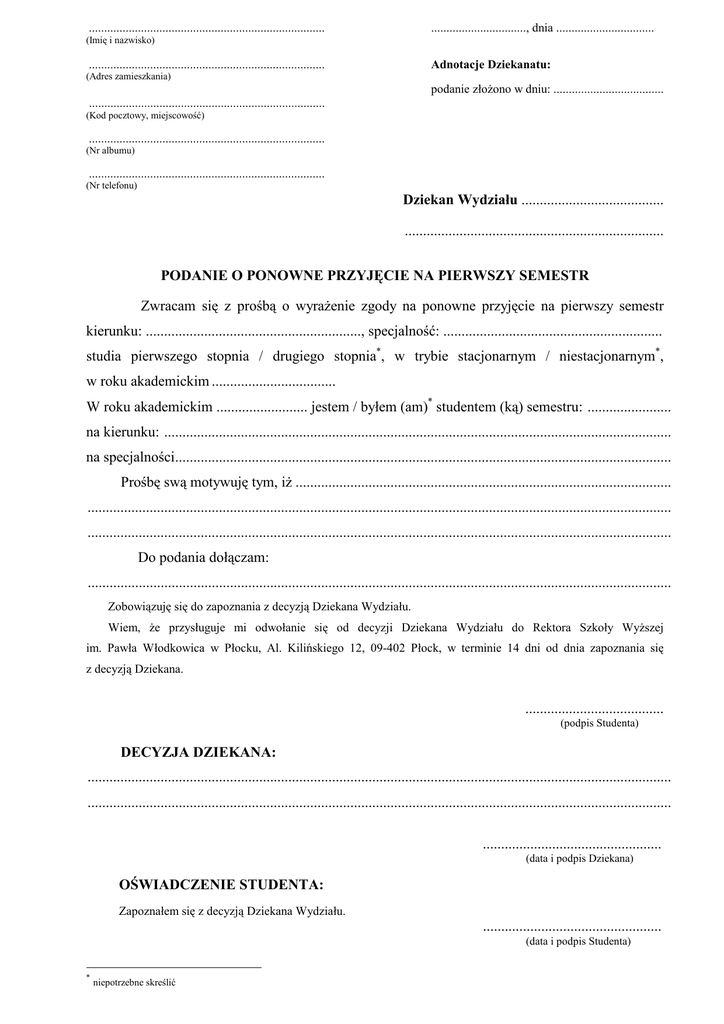 Podanie o ponowne przyjęcie na semestr I