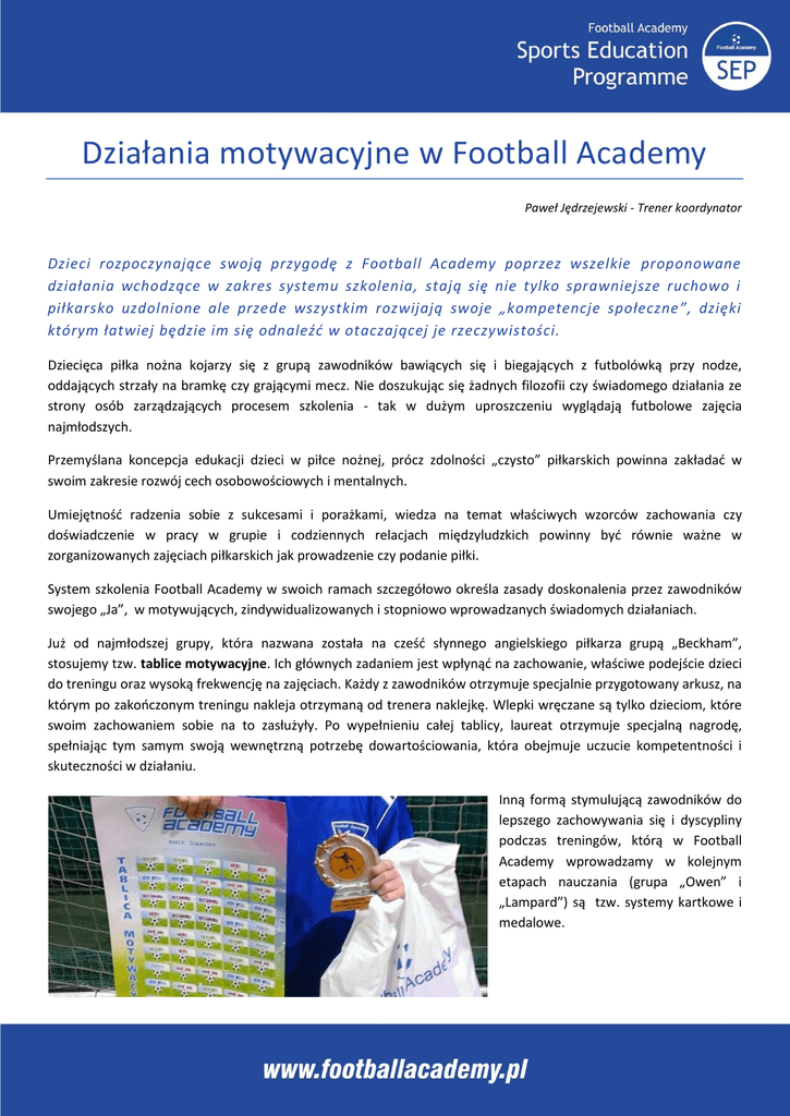 Działania motywacyjne w Football Academy Paweł Jędrzejewski - Trener koordynator Dzieci rozpoczynające swoją przygodę z Football Academy poprzez wszelkie proponowane działania wchodzące w zakres systemu szkolenia, stają się nie tylko sprawniejsze ruchowo i piłkarsko uzdolnione ale przede wszystkim rozwijają swoje „kompetencje społeczne”, dzięki którym łatwiej będzie im się odnaleźć w otaczającej je rzeczywistości. Dziecięca piłka nożna kojarzy się z grupą zawodników bawiących się i biegających z futbolówką przy nodze, oddających strzały na bramkę czy grającymi mecz. Nie doszukując się żadnych filozofii czy świadomego działania ze strony osób zarządzających procesem szkolenia - tak w dużym uproszczeniu wyglądają futbolowe zajęcia najmłodszych. Przemyślana koncepcja edukacji dzieci w piłce nożnej, prócz zdolności „czysto” piłkarskich powinna zakładać w swoim zakresie rozwój cech osobowościowych i mentalnych. Umiejętność radzenia sobie z sukcesami i porażkami, wiedza na temat właściwych wzorców zachowania czy doświadczenie w pracy w grupie i codziennych relacjach międzyludzkich powinny być równie ważne w zorganizowanych zajęciach piłkarskich jak prowadzenie czy podanie piłki. System szkolenia Football Academy w swoich ramach szczegółowo określa zasady doskonalenia przez zawodników swojego „Ja”, w motywujących, zindywidualizowanych i stopniowo wprowadzanych świadomych działaniach. Już od najmłodszej grupy, która nazwana została na cześć słynnego angielskiego piłkarza grupą „Beckham”, stosujemy tzw. tablice motywacyjne. Ich głównych zadaniem jest wpłynąć na zachowanie, właściwe podejście dzieci do treningu oraz wysoką frekwencję na zajęciach. Każdy z zawodników otrzymuje specjalnie przygotowany arkusz, na którym po zakończonym treningu nakleja otrzymaną od trenera naklejkę. Wlepki wręczane są tylko dzieciom, które swoim zachowaniem sobie na to zasłużyły. Po wypełnieniu całej tablicy, laureat otrzymuje specjalną nagrodę, spełniając tym samym swoją wewnętrzną potrzebę dowartościowania, która obejmuje uczucie kompetentności i skuteczności w działaniu. Inną formą stymulującą zawodników do lepszego zachowywania się i dyscypliny podczas treningów, którą w Football Academy wprowadzamy w kolejnym etapach nauczania (grupa „Owen” i „Lampard”) są tzw. systemy kartkowe i medalowe. System kartkowy ma na celu zmotywowanie dzieci do lepszego zachowywania się nawiązując do zasady „w treningu jak w meczu ”. Chodzi o to, by zawodnicy przyzwyczajali się, że złe i niesportowe zachowanie jest niewskazane. Żółta kartka podobnie jak w meczu pełni funkcję upomnienia, natomiast czerwona jest karą ostateczną i zakazuje udziału w dalszej części treningu, w tym najważniejszym jego punkcie, a więc meczu. System medalowy z kolei, ma na celu dopingować dzieci do większego przykładania się do treningów. W związku z negatywnym systemem kartkowym (system kar) musi być pozytywny odpowiednik czyli system nagród. Medale są wręczane raz w miesiącu w trzech najważniejszych dla dzieci kategoriach: wzór zachowania, wzór postępów oraz wzór fair play. Medale są przechodnie tzn. że po miesiącu, każdy z nagrodzonych oddaje swój medal, który jest ponownie wręczany innemu zwycięzcy. Laureat oprócz samego medalu, widnieje na stronie internetowej Football Academy jako osoba wyróżniona w danym miesiącu. Systemu medalowego, ze względu na wiek dzieci i ich świadomość nie stosujemy w najmłodszej grupie. Dzięki opisanym działaniom motywacyjnym w kolejnych etapach szkolenia Football Academy, nie mamy większych problemów z utrzymaniem właściwej dyscypliny na treningach. Wszystkie wymienione elementy wszechstronnego szkolenia mają również charakter inspiracji zawodników do ich indywidualnego rozwoju i pracy nad sobą. Motywacja do stawania się coraz lepszym jest tym większa im realniejszy jest cel do osiągnięcia i rzeczywiście użyteczny. Pamiętajmy jednak, że żadne tablice czy systemy kartkowe i medalowe nie zastąpią pracy rodzica z dzieckiem. Dzieci upodobniają się do dorosłych i w nich szukają autorytetów. Najlepszym więc motywatorem do rozwoju i właściwego zachowywania się dzieci jesteśmy my sami i nasze reakcje oraz postępowanie w otaczającej nasz rzeczywistości.