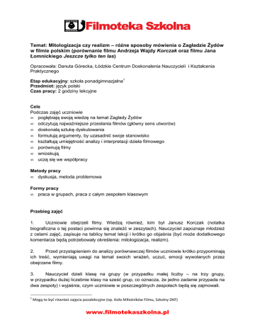 Temat: Mitologizacja czy realizm – różne sposoby mówienia o Zagładzie Żydów w filmie polskim (porównanie filmu Andrzeja Wajdy Korczak oraz filmu Jana Łomnickiego Jeszcze tylko ten las) Opracowała: Danuta Górecka, Łódzkie Centrum Doskonalenia Nauczycieli i Kształcenia Praktycznego Etap edukacyjny: szkoła ponadgimnazjalna1 Przedmiot: język polski Czas pracy: 2 godziny lekcyjne Cele Podczas zajęć uczniowie • pogłębiają swoją wiedzę na temat Zagłady Żydów • odczytują najważniejsze przesłania filmów (główny sens utworów) • doskonalą sztukę dyskutowania • formułują argumenty, by uzasadnić swoje stanowisko • kształtują umiejętność analizy i interpretacji dzieła filmowego • porównują filmy • wnioskują • uczą się we współpracy Metody pracy • dyskusja, metoda problemowa Formy pracy • praca w grupach, praca z całym zespołem klasowym Przebieg zajęć 1. Uczniowie obejrzeli filmy. Wiedzą również, kim był Janusz Korczak (notatka biograficzna o tej postaci powinna się znaleźć w zeszytach). Nauczyciel zapoznaje młodzież z celami zajęć, zapisuje na tablicy temat lekcji i krótko go objaśnia (być może dodatkowego komentarza będą potrzebowały określenia: mitologizacja, realizm). 2. Przed przystąpieniem do analizy porównawczej filmów uczniowie krótko przypominają ich treść, wymieniają uwagi na temat swoich wrażeń, uczuć, emocji wywołanych przez obejrzane filmy. 3. Nauczyciel dzieli klasę na grupy (w przypadku małej liczby – na trzy grupy, w przypadku dużej liczebnie klasy na sześć grup, co oznacza, że jedno zadanie przypada na dwa zespoły) i wyjaśnia, czym uczniowie w poszczególnych zespołach będą się zajmowali. 1 Mogą to być również zajęcia pozalekcyjne (np. Koło Miłośników Filmu, Szkolny DKF) www.filmotekaszkolna.pl Grupa I Czas, przestrzeń, sceneria wydarzeń Wasze zadanie polega na przyjrzeniu się obu filmom pod kątem czasu, przestrzeni, scenerii wydarzeń. W porównaniu tych kategorii pomogą Wam zamieszczone w instrukcji pytania: • Kiedy toczy się akcja filmów, jaki wycinek czasu obejmuje? • W jakiej przestrzeni (scenerii) rozgrywają się wydarzenia? • Co przedstawiona w filmach przestrzeń (sceneria) mówi o sytuacji bohaterów? Przedyskutujcie w zespole te zagadnienia. Wybierzcie osobę, która zrelacjonuje wyniki pracy grupy na forum klasy. Czas pracy – 20 minut Grupa II Sposób opowiadania, kompozycja Wasze zadanie polega na przyjrzeniu się sposobowi opowiadania i kompozycji w obu filmach. W ich porównaniu pomogą Wam zawarte w instrukcji pytania i polecenia: • Co spełnia rolę dominanty kompozycyjnej w obu filmach – akcja, postać bohatera, organizacja przedstawionej przestrzeni? • Jakim układem wątków jest fabuła filmów? • Jakiego charakteru nabiera filmowa opowieść Wajdy dzięki czarno-białym zdjęciom? • Określcie rolę wyrazistej kolorystyki w filmie „Jeszcze tylko ten las”. • Porównajcie zakończenia obu filmów. Przedyskutujcie w zespole te zagadnienia. Wybierzcie osobę, która zrelacjonuje wyniki pracy grupy na forum klasy. Czas pracy – 20 minut Grupa III Bohaterowie i sposób ich przedstawienia Wasze zadanie polega na przyjrzeniu się bohaterom i sposobowi ich przedstawienia w obu filmach. W ich porównaniu pomogą Wam zawarte w instrukcji pytania i polecenia: • Bohater jednostkowy czy zbiorowy? • Bohater wzór czy antywzór? Zastanówcie się nad motywacją działań bohaterów. • W jaki sposób bohaterów filmu charakteryzuje ich język? • Oceńcie konstrukcję bohaterów, biorąc pod uwagę kryterium prawdziwości. Przedyskutujcie w zespole te zagadnienia. Wybierzcie osobę, która zrelacjonuje wyniki pracy grupy na forum klasy. Czas pracy – 20 minut 4. Uczniowie dyskutują w grupach nad zagadnieniami przydzielonymi im przez nauczyciela, szukają odpowiedzi na pytania zawarte w instrukcji, wykonują polecenia. Prowadzący zajęcia czuwa nad pracą grup – może włączyć się w dyskusję, objaśnić dodatkowo któreś z pytań czy poleceń. 5. Po wyznaczonym czasie przedstawiciele grup referują efekty pracy zespołowej. Pozostali uczniowie mogą włączać się do rozmowy, uzupełniać wypowiedzi kolegów. Wynikiem tych prezentacji jest tabelka, na którą składają się syntetyczne wnioski wyprowadzone z wypowiedzi uczniowskich: www.filmotekaszkolna.pl Korczak akcja filmu toczy się od czasów przedwojennych aż do momentu likwidacji Domu Sierot w getcie warszawskim (sierpień 1942) zamknięta (wręcz ciasna) przestrzeń getta i domu dziecka poczucie uwięzienia, osaczenia, zamknięcia, statyczność dominanta kompozycyjna – postać Korczaka fabuła wielowątkowa, fresk ukazujący getto film czarno-biały, konwencja filmu dokumentalnego scena finałowa wyłamuje się z konwencji filmu dokumentalnego, ma charakter symboliczny (poetycki), jest zabiegiem dość kontrowersyjnym głównie Żydzi (w tle okrutni hitlerowcy) na pierwszym planie los zbiorowości(żydowskich dzieci), na tym tle losy Korczaka Korczak – niekwestionowany autorytet moralny, jego ocena - jednoznaczna Korczak dla swoich podopiecznych i współpracowników jest absolutnym, autorytetem, dobrotliwym i opiekuńczym Ojcem , któremu wszyscy bezgranicznie ufają i przypisują wręcz boskie cechy, jego postępowanie ma wręcz metafizyczny wymiar (altruizm, gotowość do poświęceń, pewność słuszności własnych racji) Korczak posługuje się językiem literackim, w zasadzie neutralnym, podobnie mówią jego współpracownicy, jest to język człowieka wykształconego znamy losy Korczaka, wiemy, jak skończy się jego historia, w zasadzie wypadki Jeszcze tylko ten las dwa dni lata 1942 r. na początku filmu – labirynt getta, potem przestrzeń otwarta, obrazy lata, słońca, obrazy przyrody (łąka, las) wyjście (wyzwolenie) z getta, wędrówka bohaterów, dynamizm dominanta kompozycyjna – główne bohaterki (Kulgawcowa i żydo