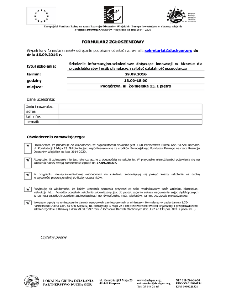 Europejski Fundusz Rolny na rzecz Rozwoju Obszarów Wiejskich: Europa inwestująca w obszary wiejskie Program Rozwoju Obszarów Wiejskich na lata 2014 - 2020 FORMULARZ ZGŁOSZENIOWY Wypełniony formularz należy odręcznie podpisany odesłać na: e-mail: [email protected] do dnia 16.09.2016 r. tytuł szkolenia: Szkolenie informacyjno-szkoleniowe dotyczące innowacji w biznesie dla przedsiębiorców i osób planujących założyć działalność gospodarczą termin: 29.09.2016 godziny 13.00-18.00 miejsce: Podgórzyn, ul. Żołnierska 13, I piętro Dane uczestnika: Imię i nazwisko: adres: tel. / fax. e-mail: Oświadczenia zamawiającego: √ Oświadczam, że przyjmuję do wiadomości, że organizatorem szkolenia jest LGD Partnerstwo Ducha Gór, 58-540 Karpacz, ul. Konstytucji 3 Maja 25. Szkolenie jest współfinansowane ze środków Europejskiego Funduszu Rolnego na rzecz Rozwoju Obszarów Wiejskich na lata 2014-2020. √ Akceptuję, iż zgłoszenie nie jest równoznaczne z obecnością na szkoleniu. W przypadku niemożliwości pojawienia się na szkoleniu należy swoją nieobecność zgłosić do 27.09.2016 r. √ W przypadku nieusprawiedliwionej nieobecności na szkoleniu zobowiązuję się pokryć koszty szkolenia na osobę w wysokości proporcjonalnej do liczby uczestników. √ Przyjmuję do wiadomości, że każdy uczestnik szkolenia przywozi ze sobą wydrukowany wzór wniosku, biznesplan, instrukcje itd…. Ponadto uczestnik szkolenia zobowiązany jest do przestrzegania zakazu nagrywania zajęć dydaktycznych za pomocą wszelkich urządzeń audiowizualnych np. dyktafonów, mp3, telefonów, kamer, bez zgody prowadzącego. √ Wyrażam zgodę na umieszczenie danych osobowych zamieszczonych w niniejszym formularzu w bazie danych LGD Partnerstwo Ducha Gór, 58-540 Karpacz, ul. Konstytucji 3 Maja 25 i ich przetwarzanie w celu organizacji i przeprowadzenia szkoleń zgodnie z Ustawą z dnia 29.08.1997 roku o Ochronie Danych Osobowych (Dz.U.97 nr 133 poz. 883 z pozn.zm. ). Czytelny podpis LOKALNA GRUPA DZIAŁANIA PARTNERSTWO DUCHA GÓR ul. Konstytucji 3 Maja 25 58-540 Karpacz www.duchgor.org; [email protected], Tel. 75 644 21 65 NIP 611-266-36-54 REGON 020906334 KRS 0000321321