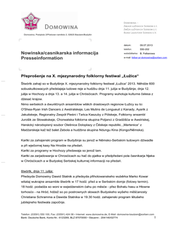 Domowina, Postplatz 2/Póstowe naměsto 2, 02625 Bautzen/Budyšin Nowinska/casnikarska informacija Presseinformation datum: 09.07.2013 telefon: 550-202 wobdźěłarka: B. Felberowa e-mail: [email protected] Přeprošenje na X. mjezynarodny folklorny festiwal „Łužica“ Štwórtk zahaji so w Budyšinje X. mjezynarodny folklorny festiwal „Łužica“ 2013. Něhdźe 600 sobuskutkowacych předstajeja ludowe reje a hudźbu dnja 11. julija w Budyšinje, dnja 12. julija w Hochozy a dnja 13. a 14. julija w Chrósćicach. Programy wuhotuja kulturne čelesa z dźesać krajow. Nimo serbskich a dwurěčnych ansamblow wšěch drastowych regionow Łužicy su to: O'Shea-Ryan Irish Dancers z Awstralskeje, Les Mutins de Longueuil z Kanady, Ayarik z Jakutiskeje, Regionalny Zespół Pieśni i Tańca Kaszuby z Pólskeje, Folklorny ansambl Jurošik ze Słowakskeje, Chorwatska folklorna skupina Poljanci z Gradźišća w Awstriskej, Hanácký národopisný soubor Olešnica Doloplazy z Čěskeje republiki, „Martenica“ z Madźarskeje kaž tež balet Zebola a hudźbna skupina Ndungu Kina (Kongo/Němska). Kartki za zahajenski program w Budyšinje su jenož w Němsko-Serbskim ludowym dźiwadle a při wječornej kasy Na Hrodźe na předań. Kartki za programy w Hochozy předawaja so jenož tam. Kartki za zarjadowanja w Chrosćicach su hač do pjatka w předpředani pola časnikarja Njeka w Chrósćicach a w Budyskej Serbskej kulturnej informaciji na předań. štwórtk, dnja 11. julija: Předsyda Domowiny Dawid Statnik a předsyda přihotowanskeho wuběrka Marko Kowar witataj wukrajne ansamble štwórtk w 17 hodź. před a w Serbskim domje (fotowy termin). 18 hodź. podadźa so woni w swjedźenskim ćahu po měsće - přez Bohatu hasu a Hłowne torhosćo - na Hród, hdźež so po postrownych słowach Budyskeho wyšeho měšćanosty Christiana Schramma a Dawida Statnika w 19.30 hodź. zahajenski program lětušeho jubilejneho festiwala započnje. Telefon: (03591) 550 100, Fax: (03591) 424 08 • Internet: www.domowina.de, E-Mail: [email protected] 1 Bank: Deutsche Bank, Konto-Nr.: 6123269, BLZ 87070000 • Steuernr.: 204/140/02774 Pjatk, dnja 12. julija zeznaja wukrajne ansamble Delnju Łužicu. We 18.30 hodź. započnu so programy wukrajnych a łužiskich ansamblow w Hochozy z hudźbu, rejemi a regionalnymi specialitami na wjacorych burskich dworach. Sobotu, dnja 13. julija w 13 hodź. zahaji so program na jednym Chróšćan statoku a w 16 hodź. wustupja dźěćace a młodźinske skupiny z Łužicy. Sobotu w 14.30 hodź. su zajimcy a žurnalisća přeprošeni na folklorny sympozij na temu „Organizaciske struktury rejowarskich skupin a folklornych ansamblow” do „Jednoty” (barowy rum). Na nim wobdźěli so tohorunja předsyda Domowiny Dawid Statnik. časowy plan: - 14:30 witanje referenta Domowiny za kulturu a wukraj Clemensa Škody, zawod do tematiki - předstajenje Domowiny a předstajenje dźěłowych wobłukow refarata za wukraj - Marinov – SFAW (Wudwor) (předstajenje, wopisanje struktury dźěwałosće) - Ideja Zwjazka Serbskich Folklornych skupin - Gabriel Krawc – SRSS (Smjerdźaca) – předstajenje/jězby do wukraja (10 min.) - wukrajna kulturna skupina – tamniša organizacija folklornych ansamblow - wukrajna kulturna skupina – tamniša organizacija folklornych ansamblow - prašenja na skupiny - 16:00 kónc Wot 19 hodź. hudźi, spěwa a rejuje so na šěsć statokach, hdźež poskićuja stajnje tež kulinariske wosebitosće. Mjezynarodna party „Chróšćan specialita” započnje so w 23 hodź. Njedźelu, dnja 14. julija, su wěriwi w 10.30 hodź. na Božu mšu na swjedźenskej łuce přeprošeni. W 11.30 hodź. zaklinči tam dujerska hudźba a wotewrja so wiki tradicionalneho rjemjesła. Po witanju čestnych hosći přez předsydu Domowiny Dawida Statnika (12 hodź., jenož po přeprošenju) započnje so w 13 hodź. při wjacezaměrowej hali „Jednota” swjedźenski ćah po Chrósćicach, kiž wjedźe hač k swjedźenskej łuce při pomniku. Tam wustupja wot 14 hodź. ansamble z Łužicy a wot 15.15 hodź. pokazuje Serbski ludowy ansambl „Serbske reje”. W 16 hodź. zahaji so wulke festiwalne finale, w kotrymž hišće raz wšě wukrajne skupiny z wjace hač 300 wuměłcami sobuskutkuja. dalše informacije pod www.folklorefestival-lausitz.de akreditowanje medijow pola nowinskeje rěčnicy domowiny ([email protected]) 2