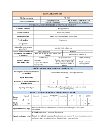 KARTA PRZEDMIOTU NP-BiB Kod przedmiotu w języku polskim w języku angielskim Nazwa przedmiotu BIOCHEMIA I BIOFIZYKA Biochemistry and Biophysics USYTUOWANIE PRZEDMIOTU W SYSTEMIE STUDIÓW Kierunek studiów Pielęgniarstwo Forma studiów Studia stacjonarne Poziom studiów Studia pierwszego stopnia licencjackie Profil studiów Praktyczny Specjalność - Jednostka prowadząca przedmiot Instytut Nauk o Zdrowiu Imię i nazwisko Kontakt Prof. zw. dr hab. n. med. Paweł Piotr [email protected] Liberski Forma zajęć Miejsce realizacji Termin realizacji Zajęcia w pomieszczeniach Wykłady dydaktycznych Instytutu Rok I – semestr Zajęcia bez udziału Nauk o Zdrowiu PWSZ w zimowy i letni nauczyciela Płocku Osoba odpowiedzialna za przedmiot- koordynator przedmiotu Termin i miejsce odbywania zajęć OGÓLNA CHARAKTERYSTYKA PRZEDMIOTU Status przedmiotu/przynależność do modułu Przedmiot obowiązkowy / Nauki podstawowe Język wykładowy Polski Semestry, na których realizowany jest przedmiot I II Wiedza z zakresu biologii i chemii na poziomie szkoły ponadgimnazjalnej; Wymagania wstępne FORMY, SPOSOBY I METODY PROWADZENIA ZAJĘĆ Formy zajęć Liczba godzin Wykład rok S 34 14/20 Sposób realizacji zajęć ćwiczenia lektorat r r s s konwersatori seminarium um r s r s ZP r PZ S r ZBUN s r s 11 5/6 wykłady dla wszystkich studentów, wielkość jednostki zajęć 6 h lekcyjne tygodniowo Wykłady zaliczenie z oceną po II semestrze Sposób zaliczenia zajęć Zajęcia bez udziału nauczyciela zaliczenie prac zleconych przez nauczyciela, ocena podsumowująca po zakończeniu wykonanej pracy przez studenta Metody dydaktyczne Przedmioty powiązane/moduł Wykłady: - wykład informacyjny, - wykład problemowy, - dyskusja dydaktyczna, - metoda programowana z użyciem komputera. Zajęcia bez udziału nauczyciela: - studiowanie literatury, - prezentacja multimedialna, dyskusja dydaktyczna. Mikrobiologia, Parazytologia, Farmakologia Podstawowa Wykaz literatury Uzupełni ająca 1. Bańkowski E., Biochemia. Podręcznik dla studentów uczelni medycznych. Urban & Partner, Wrocław, 2004 2. Filipowicz B., Więckowski W., Biochemia Tom I i II. PWN, Warszawa – Łódź 1983 3. Hames B.D., Hooper N.M, Houghton J.D., Krótkie wykłady – Biochemia. PWN, Warszawa 2010 4. Jaroszyk F., Biofizyka, Wydawnictwo Lekarskie PZWL, Warszawa 2006 5. Jóźwiak Z., Bartosz G., Biofizyka, PWN, Warszawa 2005 6. Murrary R.K., Granner D.K., Mayes P.A., Rodwell V.W., Biochemia Harpera. PZWL, Warszawa 2001 7. Mulas E. , Rumianowski R., Rachunek niepewności pomiaru w pracowni fizycznej, Oficyna Wydawnicza Politechniki Warszawskiej, Warszawa 2002 8. Stryer L., Biochemia, PWN, Warszawa 2001 9. Terlecki J., Ćwiczenia laboratoryjne z biofizyki i fizyki, Wydawnictwo Lekarskie PZWL, Warszawa 1999 1. Trębacz K., Ćwiczenia z biofizyki, Wydawnictwo Uniwersytetu M. CurieSkłodowskiej, Lublin 2. Pasternak K., Biochemia: podręcznik dla studentów medycznych studiów licencjackich, Czelej, Lublin 2005 3. Kędryna T., Gałka-Walczak M., Wybrane zagadnienia z biochemii ogólnej z ćwiczeniami. Wyd. Uniwersytetu Jagiellońskiego, Kraków 2001 4. Koolman J., Rohm K.-H., Biochemia. Ilustrowany przewodnik, PZWL, Warszawa 2005 CELE, TREŚCI I EFEKTY KSZTAŁCENIA Cele przedmiotu (ogólne, szczegółowe) Student: wyjaśni biochemiczne podstawy integralności organizmu ludzkiego, budowę i funkcje makromolekuł występujących w organizmie ludzkim oraz zróżnicuje biochemiczne podstawy funkcjonowania organizmu ludzkiego. Student : C1. zidentyfikuje podstawowe procesy biochemiczne zachodzące w żywym organizmie, C2. rozpozna budowę i funkcje makromolekuł obecnych w organizmie człowieka, C3. omówi budowę i funkcje błon komórkowych, budowę enzymów i mechanizmy regulacji ich działania, C4. wyjaśni główne procesy metabolizmu białek, lipidów i węglowodanów w organizmie, C5. omówi biochemiczne podstawy patogenezy chorób. Treści programowe Efekty kształcenia (kody) NPBiB_W01 NP- BiB _W02 NP- BiB Forma zajęć W W W Temat W 2 - Podstawowe mechanizmy regulujące metabolizm ustrojowy: sprzężenie zwrotne, enzymy, regulacja aktywności enzymów. W 1 - Błony komórkowe: budowa i dynamika, białka błonowe, kanały i pompy błonowe, pompa sodowa, pompy wapniowe. W 3 - Aminokwasy i białka: struktura i metabolizm Suma liczby godzin Liczba godzin 6 6 6 6 5 17 _W03 NP- BiB _U01 W NP- BiB _U02 Zbun NP- BiB _U03 NP- BiB _K01 NP- BiB _K02 aminokwasów; synteza, budowa i glikozylacja białek. W 4 - Metabolizm węglowodanów: monosacharydy i disacharydy; oligosacharydy i polisacharydy; glikoliza; glukoneogeneza; rozkład i synteza glikogenu. W 5 - Lipidy - biosynteza i udział w utrzymaniu homeostazy: biosynteza i wydalanie cholesterolu; biosynteza i metabolizm kwasów tłuszczowych, triglicerydów i fosfolipidów. W 6 - Równowaga wodno-elektrolitowa i kwasowo-zasadowa: regulacja narządowa i ogólnoustrojowa metabolizmu wodnoelektrolitowego; kwasica i alkaloza metaboliczna i oddechowa. Zajęcia bez udziału nauczyciela: 1.Czynniki ryzyka miażdżycy. Zaburzenia gospodarki lipidowej hipercholesterolemia, hiperlipidemia mieszana. 2.Laser, badanie właściwości światła laserowego. 3.Badanie konduktywności (przewodności elektrycznej właściwej) roztworów. 4.Wyznaczanie ciepła właściwego cieczy metodą ostygania. 6 6 5 5 11 11 Zbun Zajęcia bez udziału nauczyciela 11 11 Zbun Zajęcia bez udziału nauczyciela 11 11 Zbun Zajęcia bez udziału nauczyciela 11 11 Efekty kształcenia Student, który zaliczył przedmiot kod w zakresie WIEDZY NP- BiB _W01 NP- BiB _W02 NP- BiB _W03 NP- BiB _U01 NP- BiB _U02 NP- BiB _U03 wylicza enzymy biorące udział w trawieniu, objaśnia podstawowe defekty enzymów trawiennych oraz określa skutki tych zaburzeń wyjaśnia podstawy biochemiczne działania zmysłów wykorzystujących fizyczne nośniki informacji (fale dźwiękowe i elektromagnetyczne), różnicuje budowę aminokwasów, nukleozydów, monosacharydów,