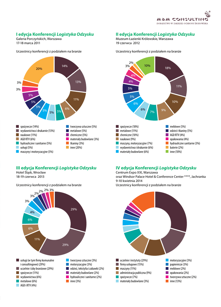 I edycja Konferencji Logistyka Odzysku II edycja Konferencji Logistyka Odzysku Uczestnicy konferencji z podziałem na branże Uczestnicy konferencji z podziałem na branże Galeria Porczyńskich, Warszawa 17-18 marca 2011 2% 3% 14% 20% Muzeum Łazienki Królewskie, Warszawa 19 czerwca 2012 10% 18% 4% 13% 13% 3% 4% 11% 5% 3% 5% 11% 5% 5% 5% 10% 6% 5% 5% 5% 6% spożywcze (14%) w ydawnictwa i drukarnie (13%) naukowe (11%) AGD RTV (6%) hydrauliczne i sanitarne (5%) usługi (5%) maszyny i motoryzacyjne (5%) 6% tworzywa sztuczne (5%) metalowe (5%) chemiczne (5%) materiały budowlane (3%) tkaniny (3%) inne (20%) III edycja Konferencji Logistyka Odzysku Hotel Śląsk, Wrocław 18-19 czerwca 2013 Uczestnicy konferencji z podziałem na branże 2% 2% 3% 2% 3% 3% 7% spożywcze (18%) metalowe (11%) chemiczne (10%) naukowe (9%) maszyny, motoryzacyjne (7%) wydawnictwa i drukarnie (6%) materiały budowlane (6%) 9% meblowe (5%) odzież i tkaniny (5%) AGD RTV (4%) opakowania (4%) hydrauliczne sanitarne (3%) baterie (2%) inne (10%) IV edycja Konferencji Logistyka Odzysku Centrum Expo XXI, Warszawa oraz Windsor Palace Hotel & Conference Center ****, Jachranka 9-10 kwietnia 2014 Uczestnicy konferencji z podziałem na branże 29% 4% 6% 6% 11% 29% usługi (w tym firmy komunalne i consultingowe) (29%) uczelnie i izby branżowe (29%) spożywcze (11%) w ydawnictwa (6%) metalowe (6%) AGD i RTV (4%) 10,87% tworzywa sztuczne (3%) motoryzacyjne (3%) odzież, tekstylia i zabawki (2%) materiały budowlane (2%) hydrauliczne i sanitarne (2%) inne (3%) uczelnie i instytuty (29%) firmy usługowe (15%) maszyny (11%) administracja publiczna (9%) spożywcze (7%) materiały budowlane (3%) motoryzacyjne (3%) papiernicze (3%) meblowe (2%) opakowania (2%) tworzywa sztuczne (2%) inne (13%)