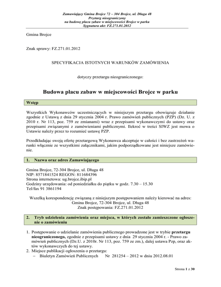 Zamawiający Gmina Brojce 72 – 304 Brojce, ul. Długa 48 Przetarg nieograniczony na budowę placu zabaw w miejscowości Brojce w parku Sygnatura akt: FZ.271.01.2012 Gmina Brojce Znak sprawy: FZ.271.01.2012 SPECYFIKACJA ISTOTNYCH WARUNKÓW ZAMÓWIENIA dotyczy przetargu nieograniczonego: Budowa placu zabaw w miejscowości Brojce w parku Wstęp Wszystkich Wykonawców uczestniczących w niniejszym przetargu obowiązuje działanie zgodnie z Ustawą z dnia 29 stycznia 2004 r. Prawo zamówień publicznych (PZP) (Dz. U. z 2010 r. Nr 113, poz. 759 ze zmianami) wraz z przepisami wykonawczymi do ustawy oraz przepisami związanymi z zamówieniami publicznymi. Ilekroć w treści SIWZ jest mowa o Ustawie należy przez to rozumieć ustawę PZP. Przedkładając swoją ofertę przetargową Wykonawca akceptuje w całości i bez zastrzeżeń warunki włącznie ze wszystkimi załącznikami, jakim podporządkowane jest niniejsze zamówienie. 1. Nazwa oraz adres Zamawiającego Gmina Brojce, 72-304 Brojce, ul. Długa 48 NIP: 8571841524 REGON: 811684396 Strona internetowa: ug.brojce.ibip.pl Godziny urzędowania: od poniedziałku do piątku w godz. 7.30 – 15.30 Tel/fax 91 3861194 Wszelką korespondencję związaną z niniejszym postępowaniem należy kierować na adres: Gmina Brojce, 72-304 Brojce, ul. Długa 48 Znak postępowania: FZ.271.01.2012 2. Tryb udzielenia zamówienia oraz miejsca, w których zostało zamieszczone ogłoszenie o zamówieniu 1. Postępowanie o udzielanie zamówienia publicznego prowadzone jest w trybie przetargu nieograniczonego, zgodnie z przepisami ustawy z dnia 29 stycznia 2004 r. - Prawo zamówień publicznych (Dz.U. z 2010r. Nr 113, poz. 759 ze zm.), dalej ustawa Pzp, oraz aktów wykonawczych do tej ustawy. 2. Miejsce publikacji ogłoszenia o przetargu: Biuletyn Zamówień Publicznych Nr 281254 – 2012 w dniu 2012.08.01 Strona 1 z 30 Zamawiający Gmina Brojce 72 – 304 Brojce, ul. Długa 48 Przetarg nieograniczony na budowę placu zabaw w miejscowości Brojce w parku Sygnatura akt: FZ.271.01.2012 strona internetowa Zamawiającego BIP: ug.brojce.ibip.pl tablica ogłoszeń w miejscu publicznie dostępnym w siedzibie Zamawiającego. 3. Opis przedmiotu zamówienia Przedmiotem zamówienia jest dostawa elementów placu zabaw oraz ich montaż na działce nr 264 w miejscowości Brojce. Należy dostarczyć oraz zamontować następujące elementy placu zabaw: 1. Zestaw wykonany ze słupów nośnych oraz belek poziomych o przekroju okrągłym i średnicy 100 i 60 mm, wykonanych z drewna bezrdzeniowego powlekanego wielowarstwowo preparatami chroniącymi przed pękaniem, zwietrzeniem, pleśnią. Słupy nośne oraz belki poziome łączone ze sobą prostopadle w jednej osi poprzez siodłowe zakończenie zabezpieczające przez obrotem wokół własnej osi i rozchwianiem. Słupy nośne i belki poziome zakończone zaokrągleniem o promieniu 50 mm. Podesty o wymiarach 1,00 x 1,00 m wykonane z desek ryflowanych i / lub ze sklejki antypoślizgowej, wmontowane w podfryzowane zagłębienia poziomych belek stanowiących elementy konstrukcyjne. Barierki oraz daszki wykonane z płyt HDL, HDPE lub ABS, dodatkowo wzmocnione metalowymi rurkami malowanymi proszkowo. Wejście wspinaczkowe wykonane ze sklejki wodoodpornej pomalowanej wodo rozpuszczalnymi farbami akrylowymi, dodatkowo wyposażone w uchwyty wspinaczkowe, w górnej części znormalizowane otwory wejściowe. Zjeżdżalnia o ślizgu wykonanym z blachy nierdzewnej, zagłębionej w burtach malowanych proszkowo. Poziom startowy zjeżdżalni usytuowany na wysokości 1,10 m i 0,85 m. Pomost z belką wykonany z belek okrągłych o średnicy 100 mm. Ruchoma belka wykonana z drewna bezrdzeniowego wyposażona w elementy zabezpieczające w postaci łańcuchów wykonanych ze stali nierdzewnej. Pomost prosty wykonany z belek poziomych okrągłych o średnicy 100 mm z podfryzowanymi zagłębieniami pod podest wykonany z desek ryflowanych i / lub sklejki antypoślizgowej. Pomost wiszący z gumy wykonany z pasa gumowego o szerokości 600 mm wzmocnionego przed rozerwaniem. Pomost wiszący z drewna ma zostać wykonany z belek okrągłych o średnicy 100 mm, wzmocnionych mocowaniem do których przymocowane są deski tworzące podłogę pomostu. Elementy metalowe ocynkowane malowane proszkowo, wykonane ze stali nierdzewnej. Montaż zestawu w ziemi na kotwach stalowych, zabezpieczonych przed korozją poprzez cynkowanie. Kolor belek w kolorze machoń lub teak. Zestaw zabawowy składać ma się z następujących elementów (dopuszcza się różnice w podanych wymiarach poszczególnych elementów +/- 0,05m) – wymiary elementów w metrach długość x szerokość x wysokość: jedna wieża z dachem czterospadowym 1,00 x 1,00 x 3,35, jedna wieża z dachem dwuspadowym 1,00 x 1,00 x 3,40, jedna wieża z dachem jednospadowym 1,00 x 1,00 x 2,85, jedna zjeżdżalnia 2,45, x 0,50 x 1,10, jedna zjeżdżalnia mniejsza 2,20 x 0,50 x 0,85, dwa pomosty 1,00 x 1,00 x 0,85, jedno wejście wspinaczkowe 1,00 x 1,00 x 0,85, jedna przeplotnia linowa 1,70 x 0,10 x 1,95jedna drabinka skośna 1,95 x 0,90 x 1,75, jedna drabinka pozioma 2,10 x 1,00 x 1,95, jeden pomost z belką 1,90 x 1,00 x 1,40, jeden pomost prosty 1,901 x 1,00 x 1,70, jeden pomost wiszący z gumy 1,90 x 1,00 x 1,70, jeden pomost wiszący z drewna 1,90 x 1,00 x 1,40. 2. Jeden zjazd linowy o wymiarach 2,65 m x 24,35 m (+/- 0,3 m). Zestaw wykonany ze słupów nośnych oraz belek poziomych o przekroju okrągłym i średnicy 100 mm, wykonanych z drewna bezrdzeniowego powlekanego wielowarstwowo preparatami chroniącymi przed pękaniem, zwietrzeniem, pleśnią. Słupy nośne oraz belki poziome łąStrona 2 z 30 Zamawiający Gmina Brojce 72 – 304 Brojce, ul. Długa 48 Przetarg nieograniczony na budowę placu zabaw w miejscowości Brojce w parku Sygnatura akt: FZ.271.01.2012 3. 4. 5. 6. 7. 8. czone ze sobą prostopadle w jednej osi poprzez siodłowe zakończenie zabezpieczające przez obrotem wokół własnej osi i rozchwianiem.