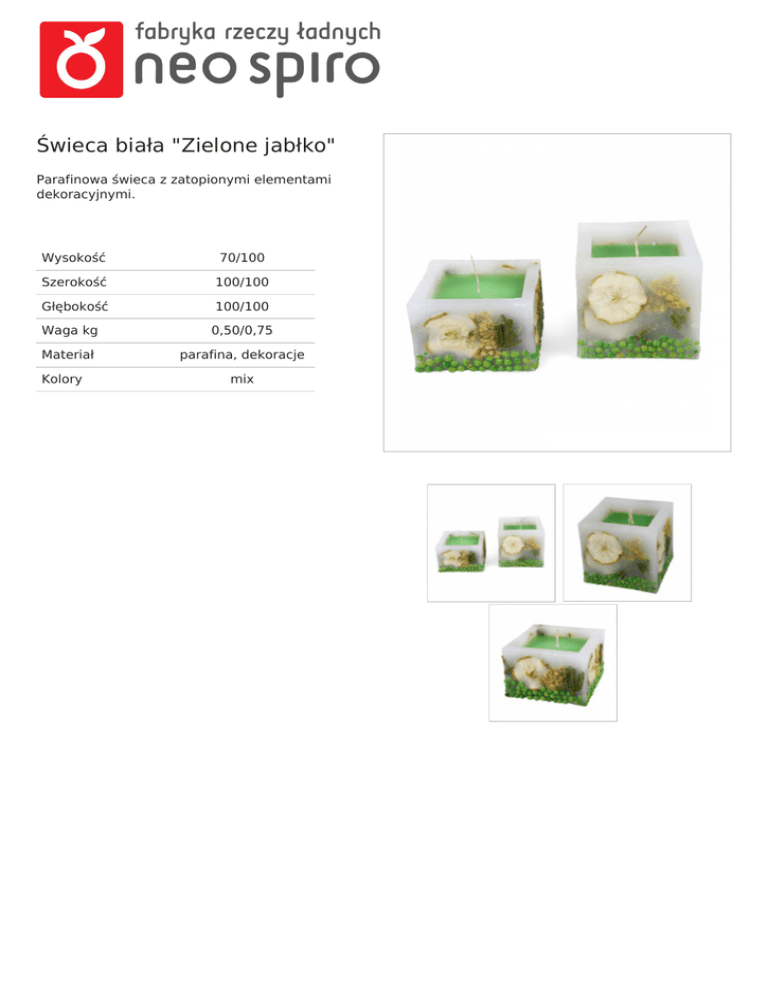 Świeca biała "Zielone jabłko" Parafinowa świeca z zatopionymi elementami dekoracyjnymi. Wysokość 70/100 Szerokość 100/100 Głębokość 100/100 Waga kg 0,50/0,75 Materiał parafina, dekoracje Kolory Powered by TCPDF (www.tcpdf.org) mix