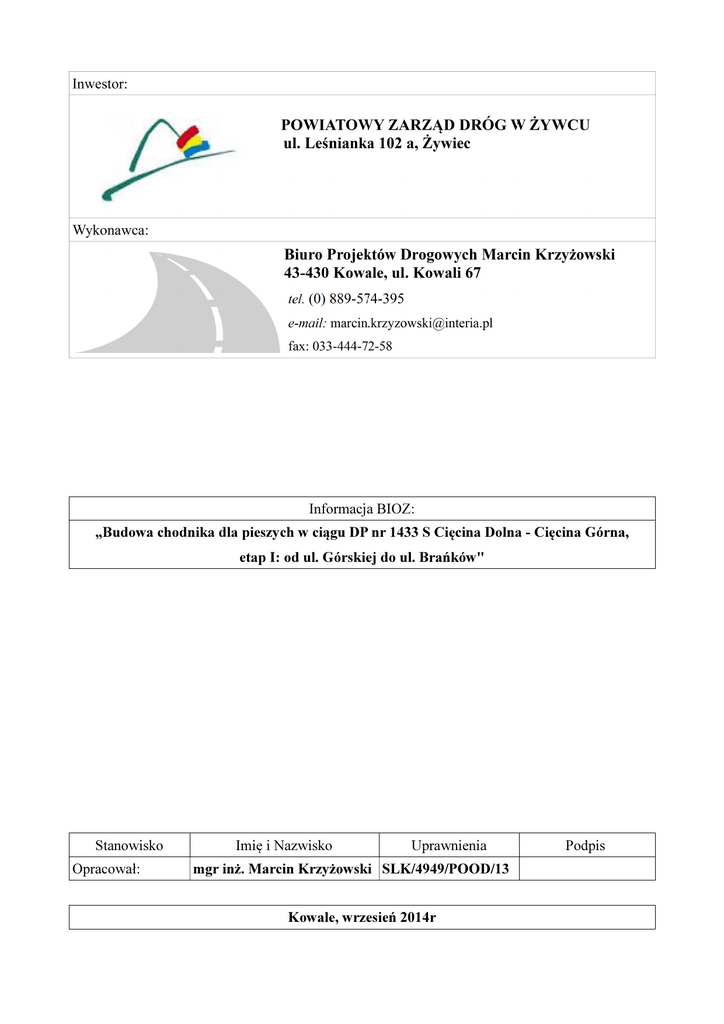 Informacja BIOZ: „Budowa chodnika dla pieszych w ciągu DP nr 1433 S Cięcina Dolna - Cięcina Górna, etap I: od ul. Górskiej do ul. Brańków" Stanowisko Opracował: Imię i Nazwisko Uprawnienia mgr inż. Marcin Krzyżowski SLK/4949/POOD/13 Kowale, wrzesień 2014r Podpis Informacja BIOZ - „Budowa chodnika dla pieszych w ciągu DP nr 1433 S Cięcina Dolna - Cięcina Górna, etap I: od ul. Górskiej do ul. Brańków" 1. Inwestor Powiatowy Zarząd Dróg w Żywcu ul. Leśnianka 102 a, Żywiec 2. Przedmiot inwestycji. Przedmiotem inwestycji jest budowa chodnika na ul. Św. Katarzyny w Cięcinie Górnej (droga powiatowa nr 1433 S Cięcina Dolna - Cięcina Górna) na odcinku około 250mb od ul. Górskiej do ul. Brańków. 3. Cel opracowania. Celem opracowania jest przygotowanie informacji dotyczącej bezpieczeństwa i ochrony zdrowia będącej podstawą do sporządzenia przez przyszłego wykonawcę robót „Planu bezpieczeństwa i ochrony zdrowia” - zgodnie z zasadami określonymi w Rozporządzeniu Ministra Infrastruktury z dnia 23 czerwca 2003 r w sprawie informacji dotyczącej bezpieczeństwa i ochrony zdrowia oraz planu bezpieczeństwa i ochrony zdrowia. 4. Informacja BIOZ 4.1 Zakres robót przy realizacji zaprojektowanego przedsięwzięcia obejmuje zadania w następującej kolejności: • Roboty przygotowawcze i porządkowe, • Zabezpieczenie terenu budowy przed osobami nieupoważnionymi, • Geodezyjne wytyczenie elementów przedsięwzięcia, • Dostawa materiałów, • Zabezpieczenie przejść i przejazdów dla mieszkańców, • Demontaż istniejącego słupa energetycznego • Zabudowę nowego słupa energetycznego wirowego • Wykonanie wykopów • Zabudowa ścianki żelbetowej prefabrykowanej Informacja BIOZ - „Budowa chodnika dla pieszych w ciągu DP nr 1433 S Cięcina Dolna - Cięcina Górna, etap I: od ul. Górskiej do ul. Brańków" • Zabudowa wpustów deszczowych wraz z przykanalikami, • Zasypanie wykopów wraz z ich zagęszczeniem, • Roboty rozbiórkowe istniejących nawierzchni i elementów infrastruktury drogowej (krawężniki, obrzeża, podbudowy) wraz z transportem, • Wykonanie wykopów pod nawierzchnię wraz z ich zabezpieczeniem i umocnieniem ścian oraz z transportem, • Zabudowa krawężników i obrzeży chodnikowych, • Wykonanie podbudowy z kruszyw dla nawierzchni i ciągów pieszych i zjazdów, • Wykonanie nawierzchni ciągów pieszych i zjazdów (kostka brukowa), • Uporządkowanie terenu budowy po wykonaniu wszystkich czynności (robót budowlanych) związanych z inwestycją, • Geodezyjna inwentaryzacja powykonawcza. 4.2 Wykaz istniejących obiektów budowlanych W obrębie prowadzenia robót znajdują się następujące obiekty budowlane: • Sieć energetyczna niskiego napięcia napowietrzna wraz z oświetleniem, • Sieć kanalizacji sanitarnej, • Sieć wodociągowa, • Sieć teletechniczna napowietrzna 4.3 Elementy, które mogą stwarzać zagrożenie bezpieczeństwa i zdrowia ludzi • Przewody linii elektroenergetycznych – możliwość porażenia prądem, • Kołowy ruch drogowy publiczny i budowlany – wypadki drogowe 4.4 Przewidywane zagrożenia występujące podczas realizacji robót budowlanych W czasie realizacji inwestycji występować będzie zagrożenie bezpieczeństwa i zdrowia ludzi: • W trakcie wykonywania wykopów o głębokości większej aniżeli 1,5m – przysypanie lub wpadnięcie do wykopu, Informacja BIOZ - „Budowa chodnika dla pieszych w ciągu DP nr 1433 S Cięcina Dolna - Cięcina Górna, etap I: od ul. Górskiej do ul. Brańków" • Prowadzenie robót w obrębie pasa drogowego przy równocześnie występującym ruchu drogowym – wypadki i zdarzenia drogowe • Prowadzenie robót przebudowy linii energetycznych – możliwość porażenia prądem, możliwość upadku z wysokości, możliwość przygniecenia • Prowadzenie robót zabudowy ścianki oporowej żelbetowej – możliwość przygniecenia 4.5 Instruktaż pracowników przed przystąpieniem do realizacji robót szczególnie niebezpiecznych Pracownicy biorący udział w procesie budowlanym powinni być przeszkoleni w ramach okresowych szkoleń BHP, zgodnie z przepisami szczegółowymi. Ponadto, bezpośrednio przed przystąpieniem do realizacji robót związanych z przedmiotową inwestycją należy przeprowadzić indywidualny instruktaż polegający na: • Określeniu sposobu bezpiecznego wykonywania prac opisanych w punkcie 4; • Szczegółowym poinformowaniu pracowników o występujących zagrożeniach podczas realizacji robót • Przedstawieniu metod postępowania w przypadku wystąpienia bezpośredniego zagrożenia życia lub zdrowia. Odpowiednie przeszkolenie zawodowe oraz przeszkolenie BHP powinno być potwierdzone odpowiednim dokumentem. Pracownicy zatrudnieni przy wykonywaniu prac na budowie winni zostać wyposażeni przez pracodawcę w odzież roboczą i ochronną, zgodnie z obowiązującymi w tym zakresie przepisami. Odzież ochronna oraz sprzęt ochronny powinny posiadać odpowiednie atesty. 4.6 Techniczno - organizacyjne środki zapobiegawcze Dla zapobieżenia przewidywanym zagrożeniom należy przedsięwziąć następujące środki: • Oznakować i zabezpieczyć teren przed dostępem osób postronnych przynajmniej taśmą ostrzegawczą na słupkach wraz z tabliczkami „Teren budowy - osobom postronnym wstęp wzbroniony”, • Pracownicy powinni stosować odzież ochronną oraz ochronne nakrycia głowy, • Zadbać o dobrą komunikację na terenie budowy, dotyczącą wyznaczenia dojścia pracowników, dostawy i miejsca składowania materiałów budowlanych, zejścia do wykopów oraz uwzględnić Informacja BIOZ - „Budowa chodnika dla pieszych w ciągu DP nr 1433 S Cięcina Dolna - Cięcina Górna, etap I: od ul. Górskiej do ul. Brańków" możliwość ewentualnej ewakuacji osób zagrożonych lub poszkodowanych, • Wykopy liniowe powinny być prowadzone bądź na rozkop z zachowaniem przepisowego nachylenia skarp wykopu 