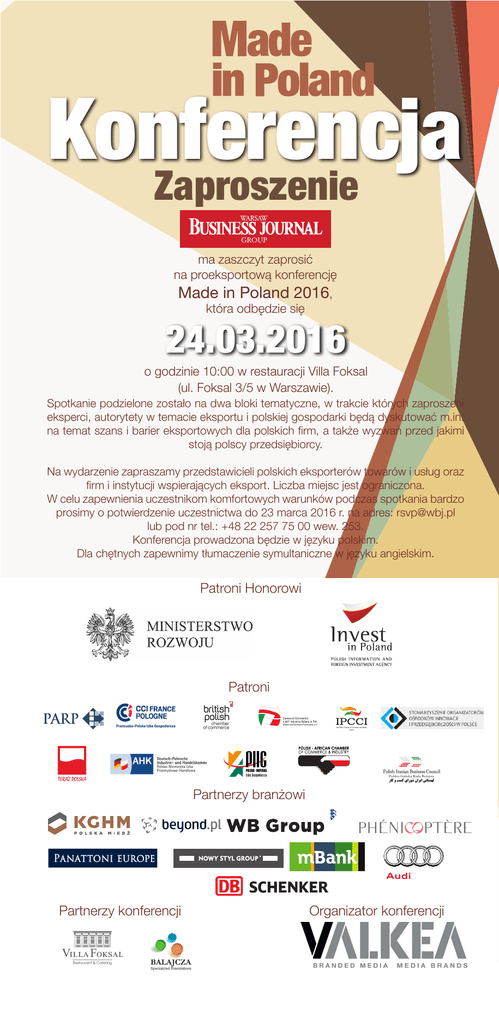 Konferencja Zaproszenie ma zaszczyt zaprosić na proeksportową konferencję Made in Poland 2016, która odbędzie się 24.03.2016 o godzinie 10:00 w restauracji Villa Foksal (ul. Foksal 3/5 w Warszawie). Spotkanie podzielone zostało na dwa bloki tematyczne, w trakcie których zaproszeni eksperci, autorytety w temacie eksportu i polskiej gospodarki będą dyskutować m.in. na temat szans i barier eksportowych dla polskich firm, a także wyzwań przed jakimi stoją polscy przedsiębiorcy. Na wydarzenie zapraszamy przedstawicieli polskich eksporterów towarów i usług oraz firm i instytucji wspierających eksport. Liczba miejsc jest ograniczona. W celu zapewnienia uczestnikom komfortowych warunków podczas spotkania bardzo prosimy o potwierdzenie uczestnictwa do 23 marca 2016 r. na adres: [email protected] lub pod nr tel.: +48 22 257 75 00 wew. 253. Konferencja prowadzona będzie w języku polskim. Dla chętnych zapewnimy tłumaczenie symultaniczne w języku angielskim. Patroni Honorowi Patroni Partnerzy branżowi Partnerzy konferencji Organizator konferencji Konferencja 24.03.2016r. Restauracja Villa Foksal PROGRAM KONFERENCJI 10:00-10:30 10:30-10:45 REJESTRACJA GOŚCI POWITANIE Jacek Ciesnowski, redaktor naczelny Warsaw Business Journal Group 10.45-11.45 PANELl I: POTENCJAŁ EKSPORTU POLSKICH FIRM Jakie produkty i marki polskie są najlepiej rozpoznawane w Europie i na świecie? Jakie produkty i usługi mają szanse zawojować świat? Jak powinny się promować? Czy marka “Made in Poland” jest powodem do dumy? Moderator: Jacek Ciesnowski, redaktor naczelny Warsaw Business Journal Group Paneliści: l Andrzej Czernek, wiceprezes zarządu Fundacji Polskiego Godła Promocyjnego „Teraz Polska” l Marek Foryński, dyrektor zarządzający Panattoni Europe lM arzena Mażewska, prezes Stowarzyszenia Organizatorów Ośrodków Innowacji i Przedsiębiorczości w Polsce lK atarzyna Soszka-Ogrodnik, rzecznik prasowy Polsko-Niemieckiej Izby Przemysłowo-Handlowej l Michał Wilczyński, kierownik ds. sprzedaży Nowy Styl Group l Piotr Wojciechowski, prezes WB Group 11:45-12:00 PRZERWA KAWOWA 12.00-13.00 PANEL II: JAK WSPIERAĆ POLSKICH EKSPORTERÓW Szanse eksportowe dla polskich firm. W dobie internetu pozyskanie klientów spoza kraju powinno być łatwiejsze - czy tak jest rzeczywiście? Na jakie bariery napotykają polscy przedsiębiorcy na rynkach zagranicznych? Kto może im pomóc je pokonać? Moderator: Beata Socha, Managing Editor Warsaw Business Journal Group Paneliści: lA leksander Libera, Pełnomocnik Zarządu ds. Polskich Inwestycji Zagranicznych Polskiej Agencji Informacji i Inwestycji Zagranicznych S.A. lN adia Bouacid, Dyrektor Centrum Rozwoju Biznesu Francusko-Polskiej Izby Gospodarczej lJ acek Sosnowski, prezes Polsko-Irańskiej Rady Biznesu lM onika Żochowska, prezes Phenicoptere l Tomasz Sobol, dyrektor marketingu Beyond.pl 13.00-14.30 LUNCH, CZĘŚĆ NETWORKINGOWA Patroni Honorowi Patroni Partnerzy branżowi Partnerzy konferencji Organizator konferencji