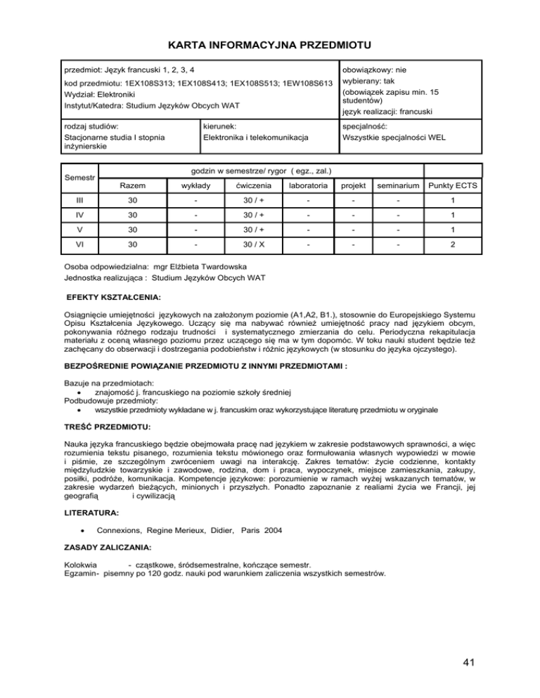 KARTA INFORMACYJNA PRZEDMIOTU przedmiot: Język francuski 1, 2, 3, 4 kod przedmiotu: 1EX108S313; 1EX108S413; 1EX108S513; 1EW108S613 Wydział: Elektroniki Instytut/Katedra: Studium Języków Obcych WAT rodzaj studiów: Stacjonarne studia I stopnia inżynierskie kierunek: Elektronika i telekomunikacja obowiązkowy: nie wybierany: tak (obowiązek zapisu min. 15 studentów) język realizacji: francuski specjalność: Wszystkie specjalności WEL godzin w semestrze/ rygor ( egz., zal.) Semestr Razem wykłady ćwiczenia laboratoria projekt seminarium Punkty ECTS III 30 - 30 / + - - - 1 IV 30 - 30 / + - - - 1 V 30 - 30 / + - - - 1 VI 30 - 30 / X - - - 2 Osoba odpowiedzialna: mgr Elżbieta Twardowska Jednostka realizująca : Studium Języków Obcych WAT EFEKTY KSZTAŁCENIA: Osiągnięcie umiejętności językowych na założonym poziomie (A1,A2, B1.), stosownie do Europejskiego Systemu Opisu Kształcenia Językowego. Uczący się ma nabywać również umiejętność pracy nad językiem obcym, pokonywania różnego rodzaju trudności i systematycznego zmierzania do celu. Periodyczna rekapitulacja materiału z oceną własnego poziomu przez uczącego się ma w tym dopomóc. W toku nauki student będzie też zachęcany do obserwacji i dostrzegania podobieństw i różnic językowych (w stosunku do języka ojczystego). BEZPOŚREDNIE POWIĄZANIE PRZEDMIOTU Z INNYMI PRZEDMIOTAMI : Bazuje na przedmiotach: • znajomość j. francuskiego na poziomie szkoły średniej Podbudowuje przedmioty: • wszystkie przedmioty wykładane w j. francuskim oraz wykorzystujące literaturę przedmiotu w oryginale TREŚĆ PRZEDMIOTU: Nauka języka francuskiego będzie obejmowała pracę nad językiem w zakresie podstawowych sprawności, a więc rozumienia tekstu pisanego, rozumienia tekstu mówionego oraz formułowania własnych wypowiedzi w mowie i piśmie, ze szczególnym zwróceniem uwagi na interakcję. Zakres tematów: życie codzienne, kontakty międzyludzkie towarzyskie i zawodowe, rodzina, dom i praca, wypoczynek, miejsce zamieszkania, zakupy, posiłki, podróże, komunikacja. Kompetencje językowe: porozumienie w ramach wyżej wskazanych tematów, w zakresie wydarzeń bieżących, minionych i przyszłych. Ponadto zapoznanie z realiami życia we Francji, jej geografią i cywilizacją LITERATURA: • Connexions, Regine Merieux, Didier, Paris 2004 ZASADY ZALICZANIA: Kolokwia - cząstkowe, śródsemestralne, kończące semestr. Egzamin - pisemny po 120 godz. nauki pod warunkiem zaliczenia wszystkich semestrów. 41