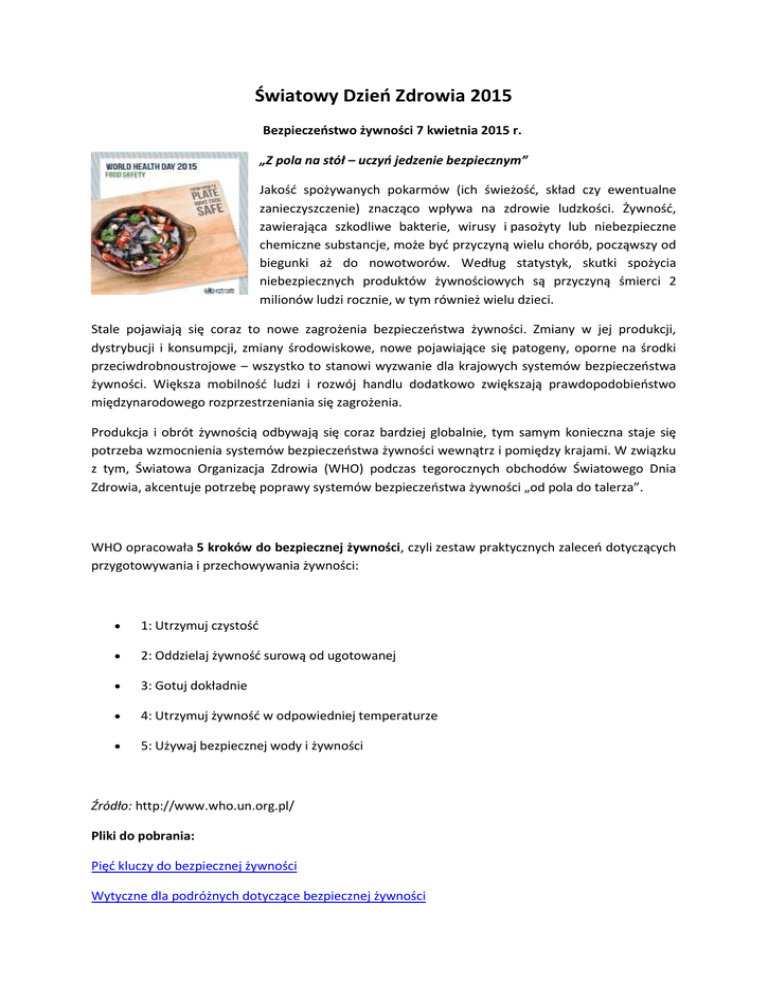 Światowy Dzień Zdrowia 2015 Bezpieczeństwo żywności 7 kwietnia 2015 r. „Z pola na stół – uczyń jedzenie bezpiecznym” Jakość spożywanych pokarmów (ich świeżość, skład czy ewentualne zanieczyszczenie) znacząco wpływa na zdrowie ludzkości. Żywność, zawierająca szkodliwe bakterie, wirusy i pasożyty lub niebezpieczne chemiczne substancje, może być przyczyną wielu chorób, począwszy od biegunki aż do nowotworów. Według statystyk, skutki spożycia niebezpiecznych produktów żywnościowych są przyczyną śmierci 2 milionów ludzi rocznie, w tym również wielu dzieci. Stale pojawiają się coraz to nowe zagrożenia bezpieczeństwa żywności. Zmiany w jej produkcji, dystrybucji i konsumpcji, zmiany środowiskowe, nowe pojawiające się patogeny, oporne na środki przeciwdrobnoustrojowe – wszystko to stanowi wyzwanie dla krajowych systemów bezpieczeństwa żywności. Większa mobilność ludzi i rozwój handlu dodatkowo zwiększają prawdopodobieństwo międzynarodowego rozprzestrzeniania się zagrożenia. Produkcja i obrót żywnością odbywają się coraz bardziej globalnie, tym samym konieczna staje się potrzeba wzmocnienia systemów bezpieczeństwa żywności wewnątrz i pomiędzy krajami. W związku z tym, Światowa Organizacja Zdrowia (WHO) podczas tegorocznych obchodów Światowego Dnia Zdrowia, akcentuje potrzebę poprawy systemów bezpieczeństwa żywności „od pola do talerza”. WHO opracowała 5 kroków do bezpiecznej żywności, czyli zestaw praktycznych zaleceń dotyczących przygotowywania i przechowywania żywności: 1: Utrzymuj czystość 2: Oddzielaj żywność surową od ugotowanej 3: Gotuj dokładnie 4: Utrzymuj żywność w odpowiedniej temperaturze 5: Używaj bezpiecznej wody i żywności Źródło: http://www.who.un.org.pl/ Pliki do pobrania: Pięć kluczy do bezpiecznej żywności Wytyczne dla podróżnych dotyczące bezpiecznej żywności