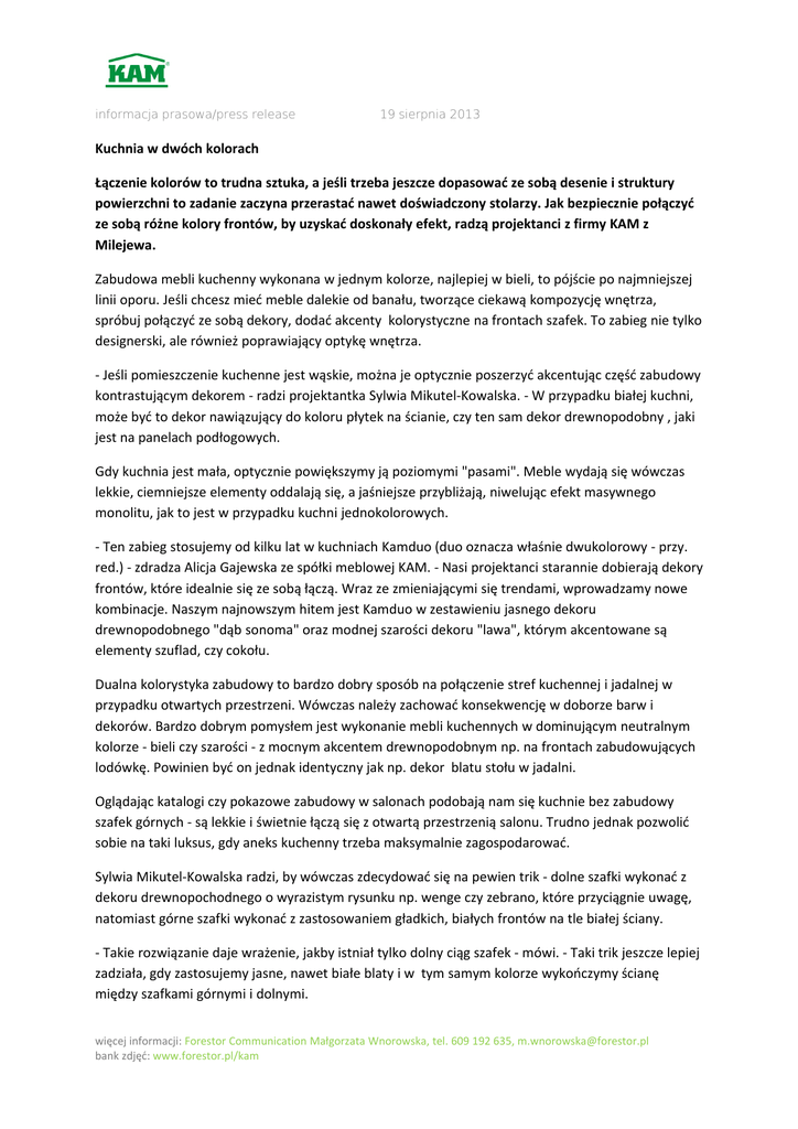 informacja prasowa/press release 19 sierpnia 2013 Kuchnia w dwóch kolorach Łączenie kolorów to trudna sztuka, a jeśli trzeba jeszcze dopasować ze sobą desenie i struktury powierzchni to zadanie zaczyna przerastać nawet doświadczony stolarzy. Jak bezpiecznie połączyć ze sobą różne kolory frontów, by uzyskać doskonały efekt, radzą projektanci z firmy KAM z Milejewa. Zabudowa mebli kuchenny wykonana w jednym kolorze, najlepiej w bieli, to pójście po najmniejszej linii oporu. Jeśli chcesz mieć meble dalekie od banału, tworzące ciekawą kompozycję wnętrza, spróbuj połączyć ze sobą dekory, dodać akcenty kolorystyczne na frontach szafek. To zabieg nie tylko designerski, ale również poprawiający optykę wnętrza. - Jeśli pomieszczenie kuchenne jest wąskie, można je optycznie poszerzyć akcentując część zabudowy kontrastującym dekorem - radzi projektantka Sylwia Mikutel-Kowalska. - W przypadku białej kuchni, może być to dekor nawiązujący do koloru płytek na ścianie, czy ten sam dekor drewnopodobny , jaki jest na panelach podłogowych. Gdy kuchnia jest mała, optycznie powiększymy ją poziomymi "pasami". Meble wydają się wówczas lekkie, ciemniejsze elementy oddalają się, a jaśniejsze przybliżają, niwelując efekt masywnego monolitu, jak to jest w przypadku kuchni jednokolorowych. - Ten zabieg stosujemy od kilku lat w kuchniach Kamduo (duo oznacza właśnie dwukolorowy - przy. red.) - zdradza Alicja Gajewska ze spółki meblowej KAM. - Nasi projektanci starannie dobierają dekory frontów, które idealnie się ze sobą łączą. Wraz ze zmieniającymi się trendami, wprowadzamy nowe kombinacje. Naszym najnowszym hitem jest Kamduo w zestawieniu jasnego dekoru drewnopodobnego "dąb sonoma" oraz modnej szarości dekoru "lawa", którym akcentowane są elementy szuflad, czy cokołu. Dualna kolorystyka zabudowy to bardzo dobry sposób na połączenie stref kuchennej i jadalnej w przypadku otwartych przestrzeni. Wówczas należy zachować konsekwencję w doborze barw i dekorów. Bardzo dobrym pomysłem jest wykonanie mebli kuchennych w dominującym neutralnym kolorze - bieli czy szarości - z mocnym akcentem drewnopodobnym np. na frontach zabudowujących lodówkę. Powinien być on jednak identyczny jak np. dekor blatu stołu w jadalni. Oglądając katalogi czy pokazowe zabudowy w salonach podobają nam się kuchnie bez zabudowy szafek górnych - są lekkie i świetnie łączą się z otwartą przestrzenią salonu. Trudno jednak pozwolić sobie na taki luksus, gdy aneks kuchenny trzeba maksymalnie zagospodarować. Sylwia Mikutel-Kowalska radzi, by wówczas zdecydować się na pewien trik - dolne szafki wykonać z dekoru drewnopochodnego o wyrazistym rysunku np. wenge czy zebrano, które przyciągnie uwagę, natomiast górne szafki wykonać z zastosowaniem gładkich, białych frontów na tle białej ściany. - Takie rozwiązanie daje wrażenie, jakby istniał tylko dolny ciąg szafek - mówi. - Taki trik jeszcze lepiej zadziała, gdy zastosujemy jasne, nawet białe blaty i w tym samym kolorze wykończymy ścianę między szafkami górnymi i dolnymi. więcej informacji: Forestor Communication Małgorzata Wnorowska, tel. 609 192 635, [email protected] bank zdjęć: www.forestor.pl/kam informacja prasowa/press release 19 sierpnia 2013 Białe fronty można łączyć z każdym kolorem i dekorem. Znacznie trudniej połączyć ze sobą dwa różne dekory imitujące rysunek drewna. - W takie sytuacji należy zdecydowanie unikać różnych gatunków drewna, które różnią się rysunkiem i wielkością słojów - ostrzega projektantka. - Producenci oferują obecnie gotowe zestawienia kolorystyczne, które się ze sobą świetnie komponują, warto z nich skorzystać, niż ryzykować złym doborem frontów od różnych producentów. W ofercie firmy KAM znajdują się ciekawe zestawienia frontów OLIVIA ze zintegrowanym uchwytem. Świetnie pasować będzie ze sobą ciemniejszy dekor mali i dąb sonoma, utrzymane w podobnej, matowej konwencji. BANK ZDJĘĆ: www.forestor.pl/kam fot. KAM Czasem wystarczy niewielki akcent pojedynczych frontów, by całkowicie odmienić monotonną zabudowę kuchni. więcej informacji: Forestor Communication Małgorzata Wnorowska, tel. 609 192 635, [email protected] bank zdjęć: www.forestor.pl/kam informacja prasowa/press release 19 sierpnia 2013 Białe szafki górne na tle białej ściany dodają lekkości kuchni, która przyciąga mocnym dekorem dolnej zabudowy. Taki trik warto zastosować w kuchniach otwartcyh na salon. KAMDUO to wciąż poszerzana oferta "dwukolorowych" kuchni, które cieszą się ogromną popularnością Połączenie dwóch dekorów drewnopodobnych to najtrudniesze zadanie. Producenci oferują często gotowe zestawienia pasujących do siebie frontów. więcej informacji: Forestor Communication Małgorzata Wnorowska, tel. 609 192 635, [email protected] bank zdjęć: www.forestor.pl/kam