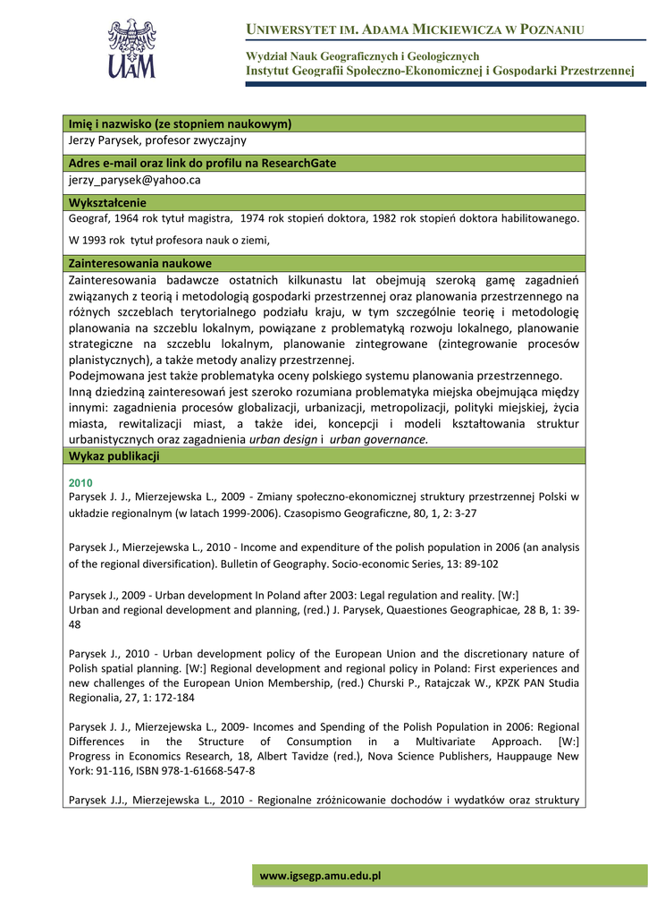 UNIWERSYTET IM. ADAMA MICKIEWICZA W POZNANIU Wydział Nauk Geograficznych i Geologicznych Instytut Geografii Społeczno-Ekonomicznej i Gospodarki Przestrzennej Imię i nazwisko (ze stopniem naukowym) Jerzy Parysek, profesor zwyczajny Adres e-mail oraz link do profilu na ResearchGate [email protected] Wykształcenie Geograf, 1964 rok tytuł magistra, 1974 rok stopień doktora, 1982 rok stopień doktora habilitowanego. W 1993 rok tytuł profesora nauk o ziemi, Zainteresowania naukowe Zainteresowania badawcze ostatnich kilkunastu lat obejmują szeroką gamę zagadnień związanych z teorią i metodologią gospodarki przestrzennej oraz planowania przestrzennego na różnych szczeblach terytorialnego podziału kraju, w tym szczególnie teorię i metodologię planowania na szczeblu lokalnym, powiązane z problematyką rozwoju lokalnego, planowanie strategiczne na szczeblu lokalnym, planowanie zintegrowane (zintegrowanie procesów planistycznych), a także metody analizy przestrzennej. Podejmowana jest także problematyka oceny polskiego systemu planowania przestrzennego. Inną dziedziną zainteresowań jest szeroko rozumiana problematyka miejska obejmująca między innymi: zagadnienia procesów globalizacji, urbanizacji, metropolizacji, polityki miejskiej, życia miasta, rewitalizacji miast, a także idei, koncepcji i modeli kształtowania struktur urbanistycznych oraz zagadnienia urban design i urban governance. Wykaz publikacji 2010 Parysek J. J., Mierzejewska L., 2009 - Zmiany społeczno-ekonomicznej struktury przestrzennej Polski w układzie regionalnym (w latach 1999-2006). Czasopismo Geograficzne, 80, 1, 2: 3-27 Parysek J., Mierzejewska L., 2010 - Income and expenditure of the polish population in 2006 (an analysis of the regional diversification). Bulletin of Geography. Socio-economic Series, 13: 89-102 Parysek J., 2009 - Urban development In Poland after 2003: Legal regulation and reality. [W:] Urban and regional development and planning, (red.) J. Parysek, Quaestiones Geographicae, 28 B, 1: 3948 Parysek J., 2010 - Urban development policy of the European Union and the discretionary nature of Polish spatial planning. [W:] Regional development and regional policy in Poland: First experiences and new challenges of the European Union Membership, (red.) Churski P., Ratajczak W., KPZK PAN Studia Regionalia, 27, 1: 172-184 Parysek J. J., Mierzejewska L., 2009- Incomes and Spending of the Polish Population in 2006: Regional Differences in the Structure of Consumption in a Multivariate Approach. [W:] Progress in Economics Research, 18, Albert Tavidze (red.), Nova Science Publishers, Hauppauge New York: 91-116, ISBN 978-1-61668-547-8 Parysek J.J., Mierzejewska L., 2010 - Regionalne zróżnicowanie dochodów i wydatków oraz struktury www.igsegp.amu.edu.pl UNIWERSYTET IM. ADAMA MICKIEWICZA W POZNANIU Wydział Nauk Geograficznych i Geologicznych Instytut Geografii Społeczno-Ekonomicznej i Gospodarki Przestrzennej spożycia ludności Polski w latach 1999-2006. Biuletyn Instytutu Geografii Społeczno-Ekonomicznej i Gospodarki Przestrzennej Uniwersytetu im. Adama Mickiewicza w Poznaniu, Seria Rozwój Regionalny i Polityka Regionalna, 11, Bogucki Wydawnictwo Naukowe, Poznań: 103, ISBN 978-83-62662-II-I Parysek J., Wojtasiewicz L., Gruchman B., 2010 - Wyzwania i kierunki rozwoju aglomeracji poznańskiej. Biblioteka Aglomeracji Poznańskiej, 4, Bogucki Wydawnictwo Naukowe, Poznań: 57, ISBN 978-83-62662-27-2 Parysek J., 2010 - Gospodarka przestrzenna i rola partycypacji społecznej w procesie planowania przestrzennego. [W:] Gospodarka przestrzenna społeczeństwu, 1, (red.) W. Ratajczak., K. Stachowiak, Bogucki Wydawnictwo Naukowe, Poznań: 79 – 98, ISBN 978-83-62662-21-0 Parysek J., 2010. Potrzeby kształcenia kadr administracji publicznej w zakresie w zakresie zarządzania rozwojem. Analiza na poziomie krajowym. [W:] Potrzeby kształcenia kadr administracji publicznej w zakresie zarządzania rozwojem, (red.) J. Weltrowska – Jęch, Centrum Analiz Przestrzennych i Społeczno-Ekonomicznych, Instytut Geografii Społeczno – Ekonomicznej i Gospodarki Przestrzennej Uniwersytetu im. A. Mickiewicza w Poznaniu, Poznań:12 –38, ISBN 978-83-930742-4-2 Parysek J., 2010 - Rola planowania w rozwoju społeczno – gospodarczym i przestrzennym miast polskich po 1989 roku. [W:] Koncepcje i instrumenty zarządzania procesami rozwoju i rewitalizacji miast, (red.) J. Słodczyk, E. Szafranek, Studia Miejskie, Wydawnictwo Uniwersytetu Opolskiego, Opole: 13-28, ISBN 978– 83–7395–404-5 Parysek J., 2010 - Rozwój miast a polityka miejska w Polsce po 1989 roku. [W:] Przekształcenia struktur regionalnych. Aspekty społeczne, ekonomiczne i przyrodnicze, (red.) S. Ciok., P. Migoń, Wydawnictwo Uniwersytetu Wrocławskiego, Wrocław: 117-132, ISBN 978-83-928255-7-9 Parysek J.J., Mierzejewska L., 2010 - Regionalne zróżnicowanie dochodów i wydatków oraz struktury spożycia ludności Polski w latach 1999-2006. Biuletyn Instytutu Geografii Społeczno-Ekonomicznej i Gospodarki Przestrzennej Uniwersytetu im. Adama Mickiewicza w Poznaniu, Seria Rozwój Regionalny i Polityka Regionalna, 11, Bogucki Wydawnictwo Naukowe, Poznań: 103 ISBN 978-83-62662-II-I Parysek J., 2010 - Urban policy in the context of contemporary urbanisation processes and development issues of Polish cities. Journal of Urban and Regional Analysis, 2, 2: 33–44 Parysek J., 2010 - Rola samorządów lokalnych w rozwoju społeczno – gospodarczym gmin. [W:] Samorząd terytorialny 20 lat po ….: Ekonomiczno – finansowe i prawne aspekty funkcjonowania samorządu terytorialnego, Wenerska B. (red.), Zeszyty Naukowe Państwowej Wyższej Szkoły Zawodowej im. Prezydenta S. Wojciechowskiego w Kaliszu, Kalisz: 41 – 54 (praca ukazała się w 2010 roku), ISBN 97883-60137-68-0 2011 Parysek J., 2011 - Współczesna polska suburbanizacja i polityka miejska (aktualność hipotez C. Colby’ego po 80 latach). [W:] Koncepcje i problemy badawcze geografii, Marci