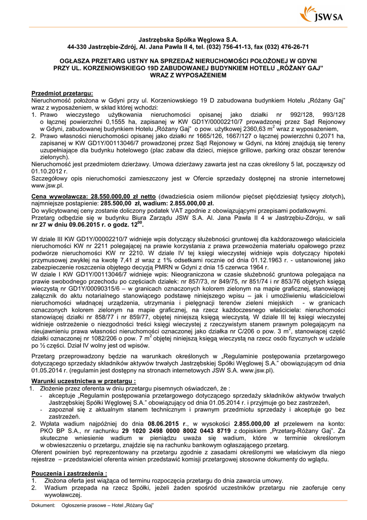 Jastrzębska Spółka Węglowa S.A. 44-330 Jastrzębie-Zdrój, Al. Jana Pawła II 4, tel. (032) 756-41-13, fax (032) 476-26-71 OGŁASZA PRZETARG USTNY NA SPRZEDAś NIERUCHOMOŚCI POŁOśONEJ W GDYNI PRZY UL. KORZENIOWSKIEGO 19D ZABUDOWANEJ BUDYNKIEM HOTELU „RÓśANY GAJ” WRAZ Z WYPOSAśENIEM Przedmiot przetargu: Nieruchomość połoŜona w Gdyni przy ul. Korzeniowskiego 19 D zabudowana budynkiem Hotelu „RóŜany Gaj” wraz z wyposaŜeniem, w skład której wchodzi: 1. Prawo wieczystego uŜytkowania nieruchomości opisanej jako działki nr 992/128, 993/128 o łącznej powierzchni 0,1555 ha, zapisanej w KW GD1Y/00002210/7 prowadzonej przez Sąd Rejonowy 2 w Gdyni, zabudowanej budynkiem Hotelu „RóŜany Gaj” o pow. uŜytkowej 2360,63 m wraz z wyposaŜeniem, 2. Prawo własności nieruchomości opisanej jako działki nr 1665/126, 1667/127 o łącznej powierzchni 0,2071 ha, zapisanej w KW GD1Y/00113046/7 prowadzonej przez Sąd Rejonowy w Gdyni, na której znajdują się tereny uzupełniające dla budynku hotelowego (plac zabaw dla dzieci, miejsce grillowe, parking oraz obszar terenów zielonych). Nieruchomość jest przedmiotem dzierŜawy. Umowa dzierŜawy zawarta jest na czas określony 5 lat, począwszy od 01.10.2012 r. Szczegółowy opis nieruchomości zamieszczony jest w Ofercie sprzedaŜy dostępnej na stronie internetowej www.jsw.pl. Cena wywoławcza: 28.550.000,00 zł netto (dwadzieścia osiem milionów pięćset pięćdziesiąt tysięcy złotych), najmniejsze postąpienie: 285.500,00 zł, wadium: 2.855.000,00 zł. Do wylicytowanej ceny zostanie doliczony podatek VAT zgodnie z obowiązującymi przepisami podatkowymi. Przetarg odbędzie się w budynku Biura Zarządu JSW S.A. Al. Jana Pawła II 4 w Jastrzębiu-Zdroju, w sali 00 nr 27 w dniu 09.06.2015 r. o godz. 12 . W dziale III KW GD1Y/00002210/7 widnieje wpis dotyczący słuŜebności gruntowej dla kaŜdorazowego właściciela nieruchomości KW nr 2211 polegającej na prawie korzystania z prawa przewoŜenia materiału opałowego przez podwórze nieruchomości KW nr 2210. W dziale IV tej księgi wieczystej widnieje wpis dotyczący hipoteki przymusowej zwykłej na kwotę 7,41 zł wraz z 1% odsetkami rocznie od dnia 01.12.1963 r. - ustanowionej jako zabezpieczenie roszczenia objętego decyzją PMRN w Gdyni z dnia 15 czerwca 1964 r. W dziale I KW GD1Y/00113046/7 widnieje wpis: Nieograniczona w czasie słuŜebność gruntowa polegająca na prawie swobodnego przechodu po częściach działek: nr 857/73, nr 849/75, nr 851/74 i nr 853/76 objętych księgą wieczystą nr GD1Y/00090315/6 – w granicach oznaczonych kolorem zielonym na mapie graficznej, stanowiącej załącznik do aktu notarialnego stanowiącego podstawę niniejszego wpisu – jak i umoŜliwieniu właścicielowi nieruchomości władnącej urządzenia, utrzymania i pielęgnacji terenów zieleni miejskich - w granicach oznaczonych kolorem zielonym na mapie graficznej, na rzecz kaŜdoczesnego właściciela: nieruchomości stanowiącej działki nr 858/77 i nr 859/77, objętej niniejszą księgą wieczystą. W dziale III tej księgi wieczystej widnieje ostrzeŜenie o niezgodności treści księgi wieczystej z rzeczywistym stanem prawnym polegającym na 2 nieujawnieniu prawa własności nieruchomości oznaczonej jako działka nr C/206 o pow. 3 m , stanowiącej część 2 działki oznaczonej nr 1082/206 o pow. 7 m objętej niniejszą księgą wieczystą na rzecz osób fizycznych w udziale po ½ części. Dział IV wolny jest od wpisów. Przetarg przeprowadzony będzie na warunkach określonych w „Regulaminie postępowania przetargowego dotyczącego sprzedaŜy składników aktywów trwałych Jastrzębskiej Spółki Węglowej S.A.” obowiązującym od dnia 01.05.2014 r. (regulamin jest dostępny na stronach internetowych JSW S.A. www.jsw.pl). Warunki uczestnictwa w przetargu : 1. ZłoŜenie przez oferenta w dniu przetargu pisemnych oświadczeń, Ŝe : - akceptuje „Regulamin postępowania przetargowego dotyczącego sprzedaŜy składników aktywów trwałych Jastrzębskiej Spółki Węglowej S.A.” obowiązujący od dnia 01.05.2014 r. i przyjmuje go bez zastrzeŜeń, - zapoznał się z aktualnym stanem technicznym i prawnym przedmiotu sprzedaŜy i akceptuje go bez zastrzeŜeń. 2. Wpłata wadium najpóźniej do dnia 08.06.2015 r., w wysokości 2.855.000,00 zł przelewem na konto: PKO BP S.A., nr rachunku 29 1020 2498 0000 8002 0443 8719 z dopiskiem „Przetarg-RóŜany Gaj”. Za skuteczne wniesienie wadium w pieniądzu uwaŜa się wadium, które w terminie określonym w obwieszczeniu o przetargu, znajdzie się na rachunku bankowym ogłaszającego przetarg. Oferent powinien być reprezentowany na przetargu zgodnie z zasadami określonymi we właściwym dla niego rejestrze – przedstawiciel oferenta winien przedstawić komisji przetargowej stosowne dokumenty do wglądu. Pouczenia i zastrzeŜenia : 1. ZłoŜona oferta jest wiąŜąca od terminu rozpoczęcia przetargu do dnia zawarcia umowy. 2. Wadium przepada na rzecz Spółki, jeŜeli Ŝaden spośród uczestników przetargu nie zaoferuje ceny wywoławczej. Dokument: Ogłoszenie prasowe – Hotel „RóŜany Gaj” 3. 4. 5. 6. Nabywca, który w terminie określonym przez sprzedającego, lecz nie później niŜ w chwili zawarcia umowy w formie aktu notarialnego, nie wpłaci całej ceny nabycia na konto podane przez sprzedającego i uchyli się od zawarcia umowy, traci prawo wynikające z przybicia oraz złoŜone wadium. Wadium złoŜone przez oferentów, których oferty nie zostaną przyjęte, zostanie zwrócone bezpośrednio po dokonaniu wyboru oferty. Wadium złoŜone przez nabywcę w pieniądzu zostanie zarachowane na poczet ceny nabycia. Oferty nabycia składane przez cudzoziemców oraz osoby prawne z udziałem kapitału zagranicznego, winny spełniać warunki wynikające z ustawy z dnia 24.03.1920 r. o nabywaniu nieruchomości przez cudzoziemców (Dz. U. z 2004 r. Nr 167, poz. 1758 z późn. zm.) Sprzedawca zastrzega sob