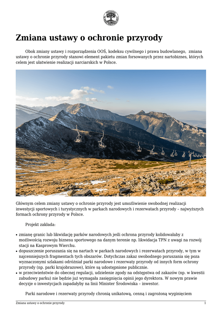 Zmiana ustawy o ochronie przyrody Obok zmiany ustawy i rozporządzenia OOŚ, kodeksu cywilnego i prawa budowlanego, zmiana ustawy o ochronie przyrody stanowi element pakietu zmian forsowanych przez nartobiznes, których celem jest ułatwienie realizacji narciarskich w Polsce. Głównym celem zmiany ustawy o ochronie przyrody jest umożliwienie swobodnej realizacji inwestycji sportowych i turystycznych w parkach narodowych i rezerwatach przyrody – najwyższych formach ochrony przyrody w Polsce. Projekt zakłada: ● ● ● zmianę granic lub likwidację parków narodowych jeśli ochrona przyrody kolidowałaby z możliwością rozwoju biznesu sportowego na danym terenie np. likwidacja TPN z uwagi na rozwój stacji na Kasprowym Wierchu. dopuszczenie poruszania się na nartach w parkach narodowych i rezerwatach przyrody, w tym w najcenniejszych fragmentach tych obszarów. Dotychczas zakaz swobodnego poruszania się poza wyznaczonymi szlakami odróżniał parki narodowe i rezerwaty przyrody od innych form ochrony przyrody (np. parki krajobrazowe), które są udostępnione publicznie. w przeciwieństwie do obecnej regulacji, udzielenie zgody na odstępstwa od zakazów (np. w kwestii zabudowy parku) nie będzie już wymagała zasięgnięcia opinii jego dyrektora. W nowym prawie decyzje o inwestycjach zapadałyby na linii Minister Środowiska – inwestor. Parki narodowe i rezerwaty przyrody chronią unikatową, cenną i zagrożoną wyginięciem Zmiana ustawy o ochronie przyrody 1 przyrodę. Obejmują ochroną ostatnie już enklawy ginących siedlisk i ostoje rzadkich zwierząt i roślin. W Polsce parki narodowe zajmują jedynie 1% powierzchni naszego kraju. Realizacja inwestycji narciarskich w takiej lokalizacji jest nie do pogodzenia z możliwością i zasadami ochrony przyrody, ponieważ powodowałaby niedające się skompensować znaczące negatywne oddziaływanie na środowisko. Szczególnie jest to widoczne w Tatrzańskim Parku Narodowym, gdzie każdy dalszy rozwój inwestycji narciarskich na Kasprowym Wierchu powodowałby degradację krajobrazu i tatrzańskiej przyrody. Większość parków narodowych objęta jest także ochroną w postaci obszarów Natura 2000. Projekt jest także sprzeczny z krajowymi i europejskim prawem środowiskowym. Dopuszczenie budowy obiektów sportowych w parkach narodowych jest także ewidentnym przedłożeniem zysków inwestorów nad dobro całego społeczeństwa, jakim jest ochrona przyrody. Projekt wniesiony pod obrady sejmu w maju 2015 r. przez Komisję Kultury Fizycznej, Sportu i Turystyki. Po wyborach parlamentarnych w październiku 2015 r. prace nad projektem przerwano. Z uwagi na powracające próby udostępnienia parków narodowych i rezerwatów przyrody dla rozwoju stacji narciarskich, zagrożenie zmiany ustawy o ochronie przyrody jest w dalszym ciągu realne. Zmiana ustawy o ochronie przyrody 2