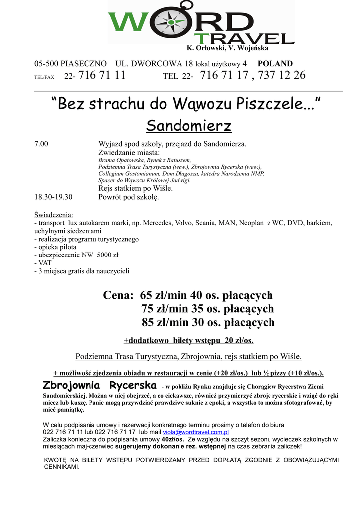 K. Orłowski, V. Wojeńska 05-500 PIASECZNO UL. DWORCOWA 18 lokal użytkowy 4 TEL/FAX 22- 716 71 11 TEL 22- 716 71 17 POLAND , 737 12 26 “Bez strachu do Wąwozu Piszczele...” Sandomierz 7.00 Wyjazd spod szkoły, przejazd do Sandomierza. Zwiedzanie miasta: Brama Opatowska, Rynek z Ratuszem, Podziemna Trasa Turystyczna (wew.), Zbrojownia Rycerska (wew.), Collegium Gostomianum, Dom Długosza, katedra Narodzenia NMP. Spacer do Wąwozu Królowej Jadwigi. 18.30-19.30 Rejs statkiem po Wiśle. Powrót pod szkołę. Świadczenia: - transport lux autokarem marki, np. Mercedes, Volvo, Scania, MAN, Neoplan z WC, DVD, barkiem, uchylnymi siedzeniami - realizacja programu turystycznego - opieka pilota - ubezpieczenie NW 5000 zł - VAT - 3 miejsca gratis dla nauczycieli Cena: 65 zł/min 40 os. płacących 75 zł/min 35 os. płacących 85 zł/min 30 os. płacących +dodatkowo bilety wstępu 20 zł/os. Podziemna Trasa Turystyczna, Zbrojownia, rejs statkiem po Wiśle. + możliwość zjedzenia obiadu w restauracji w cenie (+20 zł/os.) lub ½ pizzy (+10 zł/os.). Zbrojownia Rycerska - w pobliżu Rynku znajduje się Chorągiew Rycerstwa Ziemi Sandomierskiej. Można w niej obejrzeć, a co ciekawsze, również przymierzyć zbroje rycerskie i wziąć do ręki miecz lub kuszę. Panie mogą przywdziać prawdziwe suknie z epoki, a wszystko to można sfotografować, by mieć pamiątkę. W celu podpisania umowy i rezerwacji konkretnego terminu prosimy o telefon do biura 022 716 71 11 lub 022 716 71 17 lub mail [email protected] Zaliczka konieczna do podpisania umowy 40zł/os. Ze względu na szczyt sezonu wycieczek szkolnych w miesiącach maj-czerwiec sugerujemy dokonanie rez. wstępnej na czas zebrania zaliczek! KWOTĘ NA BILETY WSTĘPU POTWIERDZAMY PRZED DOPŁATĄ ZGODNIE Z OBOWIĄZUJĄCYMI CENNIKAMI. Wyciąg z warunków uczestnictwa imprez turystycznych organizowanych przez B.P. Word Travel (pełna wersja warunków uczestnictwa dostępna jest u nauczyciela organizującego wycieczkę) : 13. W przypadku rezygnacji lub nie uczestniczenia Uczestnika w wykupionej imprezie Organizator uprawniony jest do potrącenia RZECZYWIŚCIE PONIESIONYCH KOSZTÓW. 14. Zmiana uczestnika nie pociąga za sobą kosztów finansowych. 18. Uczestnik odpowiada za wszelkie szkody materialne wyrządzone w trakcie trwania imprezy (zniszczenia w hotelu, autokarze) 15. Jeżeli w programie jest wyjazd poza granicę Polski - uczestnik winien posiadać na miejscu zbiórki aktualnie obowiązujące dokumenty uprawniające do przekroczenia granic krajów objętych programem imprezy (wyłącznie dowód osobisty lub paszport ważny min. 6 m-cy od daty powrotu). 9 B. W przypadku chorób uznawanych za przewlekłe uczestnik winien na własny koszt wykupić dodatkowe ubezpieczenie ! (dotyczy wycieczek zagranicznych) Klient przez dokonanie wpłaty (całkowitej lub częściowej) akceptuje program wycieczki i warunki uczestnictwa.