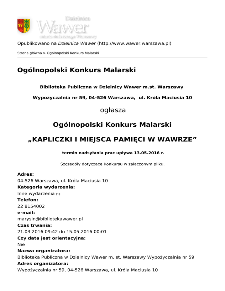 Opublikowano na Dzielnica Wawer (http://www.wawer.warszawa.pl) Strona główna > Ogólnopolski Konkurs Malarski Ogólnopolski Konkurs Malarski Biblioteka Publiczna w Dzielnicy Wawer m.st. Warszawy Wypożyczalnia nr 59, 04-526 Warszawa, ul. Króla Maciusia 10 ogłasza Ogólnopolski Konkurs Malarski „KAPLICZKI I MIEJSCA PAMIĘCI W WAWRZE” termin nadsyłania prac upływa 13.05.2016 r. Szczegóły dotyczące Konkursu w załączonym pliku. Adres: 04-526 Warszawa, ul. Króla Maciusia 10 Kategoria wydarzenia: Inne wydarzenia [1] Telefon: 22 8154002 e-mail: [email protected] Czas trwania: 21.03.2016 09:42 do 15.05.2016 00:01 Czy data jest orientacyjna: Nie Nazwa organizatora: Biblioteka Publiczna w Dzielnicy Wawer m. st. Warszawy Wypożyczalnia nr 59 Adres organizatora: Wypożyczalnia nr 59, 04-526 Warszawa, ul. Króla Maciusia 10 Telefon organizatora: 22 8154002 e-mail organizatora: [email protected] Strona www organizatora: bibliotekawawer.pl Galeria: Załączniki: Regulamin Ogólnopolskiego Konkursu Malarskiego (1).pdf [2] (151.95KB) URL źródłowy: http://www.wawer.warszawa.pl/pl/strona/ogolnopolski-konkurs-malarski Linki [1] http://www.wawer.warszawa.pl/pl/strona/inne-wydarzenia [2] http://www.wawer.warszawa.pl/sites/default/files/field/attachments/Regulamin%20Og%C3%B3lnopolsk