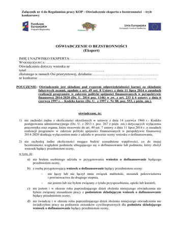 Załącznik nr 4 do Regulaminu pracy KOP - Oświadczenie eksperta o bezstronności - tryb konkursowy OŚWIADCZENIE O BEZSTRONNOŚCI (Ekspert) IMIĘ I NAZWISKO EKSPERTA: ……………………………………………………………… WNIOSKODAWCA: ...….…………………………………………………………………………… Oświadczenie dotyczy wniosku nr tytuł:…………………………………………….….........., złożonego w ramach Osi priorytetowej, działania:……………………………………………… nr konkursu: ……………………………………………………………..…………………….. POUCZENIE: Oświadczenie jest składane pod rygorem odpowiedzialności karnej za składanie fałszywych zeznań, zgodnie z art. 49 ust. 8 Ustawy z dnia 11 lipca 2014 o zasadach realizacji programów w zakresie polityki spójności finansowanych w perspektywie finansowej 2014-2020 (Dz. U. 2014 poz. 1146) w zw. z art. 233 § 6 ustawy z dnia 6 czerwca 1997 r. – Kodeks karny (Dz. U. z 1997 r. Nr 88, poz. 553, z późn. zm.). oświadczam, że: 1) nie zachodzi żadna z okoliczności określonych w ustawie z dnia 14 czerwca 1960 r.- Kodeks postępowania administracyjnego (Dz. U. z 2013 r. poz. 267 z późn. zm.) dotyczących wyłączenia pracownika oraz organu, które stosownie do art. 49 ust. 7 ustawy z dnia 11 lipca 2014 r. o zasadach realizacji programów w zakresie polityki spójności finansowanych w perspektywie finansowej 2014-2020 skutkują wyłączeniem mnie z udziału w procesie oceny wniosku o dofinansowanie, 2) nie zachodzą żadne okoliczności mogące budzić uzasadnione wątpliwości, co do mojej bezstronności względem podmiotu ubiegającego się o dofinansowanie lub podmiotu, który złożył wniosek będący przedmiotem oceny, w tym, że: a) nie brałem osobistego udziału w przygotowaniu wniosku o dofinansowanie będącego przedmiotem oceny, b) z osobą przygotowującą wniosek o dofinansowanie będący przedmiotem oceny: nie łączy lub nie łączył mnie związek małżeński, stosunek pokrewieństwa i powinowactwa do drugiego stopnia, nie jestem lub nie byłem związany z tytułu przysposobienia, opieki lub kurateli, c) nie jestem i w okresie roku poprzedzającego dzień złożenia niniejszego oświadczenia nie byłem związany stosunkiem pracy z podmiotem składającym wniosek o dofinansowanie będący przedmiotem oceny, d) nie świadczę i w okresie roku poprzedzającego dzień złożenia niniejszego oświadczenia nie świadczyłem pracy na podstawie stosunków cywilnoprawnych dla podmiotu składającego wniosek o dofinansowanie będący przedmiotem oceny, e) nie jestem i w okresie roku poprzedzającego dzień złożenia niniejszego oświadczenia nie byłem członkiem organów zarządzających i nadzorczych podmiotu składającego wniosek o dofinansowanie będący przedmiotem oceny, f) nie jestem i w okresie roku poprzedzającego dzień złożenia niniejszego oświadczenia nie byłem wspólnikiem, udziałowcem lub akcjonariuszem podmiotu składającego wniosek o dofinansowanie będący przedmiotem oceny, działającego w formie spółki prawa handlowego, g) nie brałem osobistego udziału w przygotowaniu wniosku o dofinansowanie konkurującego o dofinansowanie z wnioskiem będącym przedmiotem oceny, h) z podmiotem składającym wniosek o dofinansowanie, którego wniosek konkuruje o dofinansowanie z wnioskiem będącym przedmiotem oceny: nie łączy lub nie łączył mnie związek małżeński, stosunek pokrewieństwa i powinowactwa do drugiego stopnia, nie jestem lub nie byłem związany z tytułu przysposobienia, opieki lub kurateli, i) nie jestem i w okresie roku poprzedzającego dzień złożenia niniejszego oświadczenia nie byłem związany stosunkiem pracy z którymkolwiek podmiotem składającym wniosek o dofinansowanie, którego wniosek konkuruje o dofinansowanie z wnioskiem będącym przedmiotem oceny, j) nie świadczę i w okresie roku poprzedzającego dzień złożenia niniejszego oświadczenia nie świadczyłem pracy na podstawie stosunków cywilnoprawnych dla któregokolwiek podmiotu składającego wniosek o dofinansowanie, którego wniosek konkuruje o dofinansowanie z wnioskiem będącym przedmiotem oceny, k) nie jestem i w okresie roku poprzedzającego dzień złożenia niniejszego oświadczenia nie byłem członkiem organów zarządzających i nadzorczych któregokolwiek podmiotu składającego wniosek o dofinansowanie, którego wniosek konkuruje o dofinansowanie z wnioskiem będącym przedmiotem oceny, l) nie jestem i w okresie roku poprzedzającego dzień złożenia niniejszego oświadczenia nie byłem wspólnikiem, udziałowcem lub akcjonariuszem któregokolwiek podmiotu składającego wniosek o dofinansowanie działającego w formie spółki prawa handlowego, którego wniosek konkuruje o dofinansowanie z wnioskiem będącego przedmiotem oceny, m) z osobą przygotowującą wniosek o dofinansowanie konkurujący o dofinansowanie z wnioskiem będącym przedmiotem oceny: nie łączy lub nie łączył mnie związek małżeński, stosunek pokrewieństwa i powinowactwa do drugiego stopnia, nie jestem lub nie byłem związany z tytułu przysposobienia, opieki lub kurateli, n) nie jestem i w okresie roku poprzedzającego dzień złożenia niniejszego oświadczenia nie byłem związany stosunkiem pracy z którymkolwiek podmiotem przygotowującym wniosek o dofinansowanie będący przedmiotem oceny lub wniosek konkurujący o dofinansowanie z wnioskiem będącym przedmiotem oceny, o) nie świadczę i w okresie roku poprzedzającego dzień złożenia niniejszego oświadczenia nie świadczyłem pracy na podstawie stosunków cywilnoprawnych dla któregokolwiek podmiotu przygotowującego wniosek o dofinansowanie będący przedmiotem oceny lub wniosek konkurujący o dofinansowanie z wnioskiem będącym przedmiotem oceny, p) nie jestem i w okresie roku poprzedzającego dzień złożenia niniejszego oświa