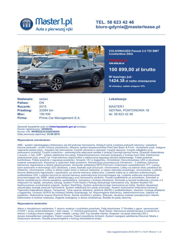 TEL. 58 623 42 46 [email protected] VOLKSWAGEN Passat 2.0 TDI BMT Comfortline DSG PROMOCJA 109 499,00 zł 100 899,00 zł brutto W leasingu już: 1424.38 zł netto miesięcznie 36 miesięcy, opłata wstępna 10% Nadwozie: Paliwo: Rocznik: Przebieg: Moc: Firma: sedan ON 2015 33384 km 150 KM Prime Car Management S.A. Lokalizacja: MASTER1 GDYNIA, PONTONOWA 18 tel. 58 623 42 46 Sprawdź bezpłatnie auto na historiapojazdu.gov.pl podając: Numer rejestracyjny: GD064GL Numer VIN: WVWZZZ3CZGE039205 Datę pierwszej rejestracji: 23.09.2015 Wyposażenie standardowe: ABS - system zapobiegający blokowaniu się kół podczas hamowania, Airbag 6 sztuk (czołowe poduszki kierowcy i pasażera, boczne poduszki - przód, kurtyny powietrzne), Aktywny system bezpieczeństwa PreCrash Basic & Front - domykanie szyb, wstępne napinanie pasów bezp., Asystent siły hamowania, Czujnik ciśnienia w oponach, Czujnik deszczu, Czujnik odległości przy parkowaniu przód/tył, Czujnik zmierzchu - automatyczne włączanie świateł z funkcją Coming/Leaving Home, Dywaniki materiałowe z przodu i z tyłu, ESP - system stabilizacji toru jazdy, Elektromechaniczny hamulec postojowy z funkcją Auto-Hold, Elektryczne podnoszenie szyb, przód i tył, Fotel kierowcy ergoComfort z elektryczną regulacją odcinka lędźwiowego, Fotele przednie komfortowe, Fotele przednie z regulacją wysokości, Gniazdo 12V w bagażniku, Immobilizer, Kierunkowskazy LED w obudowie lusterek zewnętrznych, Kieszenie w oparciach foteli przednich, Klimatyzacja automatyczna Climatronic - 3 strefowa, Kolumna kierownicy regulowana w dwóch płaszczyznach, Komputer pokładowy MFA Premium z kolorowym wyświetlaczem TFT, Lampy tylne wykonane w technologii LED (diodowe), Listwy dookoła szyb bocznych, chromowane, Listwy na osłonie wlotu powietrza do chłodnicy, chromowane, Listwy w dolnej części drzwi w kolorze nadwozia, w części zderzaka przedniego, chromowane, Lusterka boczne elektrycznie regulowane i ogrzewane, po stronie kierowcy asferyczne, Lusterka make-up w osłonach p/słonecznych, podświetlane LED, Lusterko boczne po stronie kierowcy automatycznie przyciemniające się, Lusterko wsteczne automatycznie przyciemniające się, MSR- układ przeciwblokujący przy hamowaniu silnikiem, Przedni podłokietnik ze schowkiem, Schowek w desce rozdzielczej po stronie pasażera, podświetlany, zamykany z funkcją chłodzenia, Schowek w konsoli środkowej z przodu z 2 miejscami na napoje, zamykany żaluzją, System Front Assist z funkcją awaryjnego hamowania City, System Keyless Go bezkluczykowe uruchamianie pojazdu, System Start/Stop, System automatycznego hamowania po kolizji, System rekuperacji odzyskujący energię podczas hamowania, System stabilizacji toru jazdy przyczepy, System wykrywania zmęczenia kierowcy, Tapicerka materiałowa Weave, Tempomat, Tylne oparcie składane, dzielone (60/40) z podłokietnikiem, otworem i funkcją składania z bagażnika, Uchwyty ISOFIX do instalacji fotelika dziecięcego, tył, Wspomaganie kierownicy, elektromechniczne, zależne od prędkości, Wykońzenie wnęrza Diamond Silver, Zamek centralny z pilotem, Zderzaki, obudowy lusterek zewnętrznych i klamki lakierowane w kolorze nadwozia, Zegarek analogowy w desce rozdzielczej, Światła do jazdy dziennej Wyposażenie dealerskie: Alarm z niezależnym zasilaniem, f. dozoru wnętrza i czujnikiem przechyłu, Felgi aluminiowe 17 Nivelles z ogum. samouszczel. 215/55 + śruby antykradzieżowe + koło zapas. 17, Kamera parkowania - Rear Assist, Kierownica wielofunkcyjna 3-ramienna w skórze z funkcją zmiany biegów, Lakier metalik, Lampy LED Top (światła mijania, drogowe i do jazdy dziennej LED z dynam.doświetleniem zakrętów), Pakiet Lusterka, Pakiet oświetlenie Ambient, System nawigacji satelitarnej Discover Media z dotykowym ekranem, Światła przeciwmgielne z funkcją doświetlania skrętu Opis wygenerowano 28.02.2017 o 12:01 Strona 1 z 2 Master1 to punkt sprzedaży samochodów Masterlease, pierwszego właściciela. Wszystkie auta zostały zakupione w polskim salonie, posiadają wycenę rzeczoznawcy, były regularnie serwisowane podczas użytkowania i posiadają udokumentowaną historię zdarzeń serwisowych. W Master1.pl znajdziecie Państwo szeroki wachlarz ubezpieczeń komunikacyjnych. Nasza oferta skierowana jest zarówno do klientów indywidualnych jak i firm. Wszelkich formalności można dokonać na miejscu. Opis wygenerowano 28.02.2017 o 12:01 Strona 2 z 2