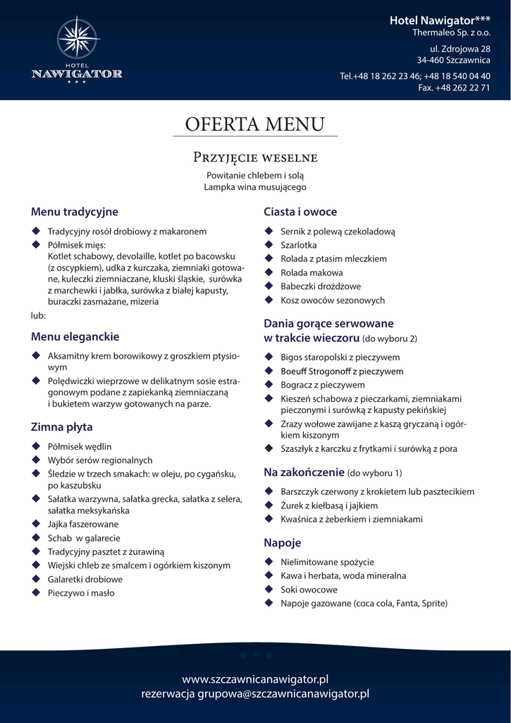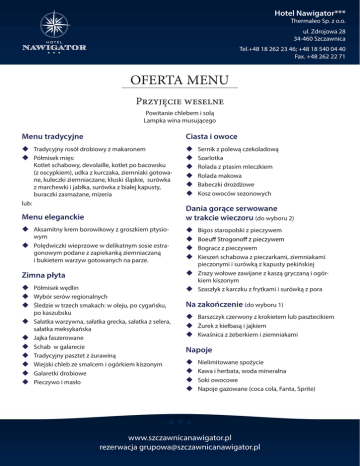 Hotel Nawigator*** Thermaleo Sp. z o.o. ul. Zdrojowa 28 34-460 Szczawnica Tel.+48 18 262 23 46; +48 18 540 04 40 Fax. +48 262 22 71 OFERTA MENU Powitanie chlebem i solą Lampka wina musującego Menu tradycyjne Ciasta i owoce Tradycyjny rosół drobiowy z makaronem Półmisek mięs: Kotlet schabowy, devolaille, kotlet po bacowsku (z oscypkiem), udka z kurczaka, ziemniaki gotowane, kuleczki ziemniaczane, kluski śląskie, surówka z marchewki i jabłka, surówka z białej kapusty, buraczki zasmażane, mizeria lub: Dania gorące serwowane w trakcie wieczoru (do wyboru 2) Menu eleganckie Aksamitny krem borowikowy z groszkiem ptysio- wym Polędwiczki wieprzowe w delikatnym sosie estragonowym podane z zapiekanką ziemniaczaną i bukietem warzyw gotowanych na parze. Zimna płyta Półmisek wędlin Wybór serów regionalnych Śledzie w trzech smakach: w oleju, po cygańsku, Sernik z polewą czekoladową Szarlotka Rolada z ptasim mleczkiem Rolada makowa Babeczki drożdżowe Kosz owoców sezonowych po kaszubsku Sałatka warzywna, sałatka grecka, sałatka z selera, sałatka meksykańska Jajka faszerowane Schab w galarecie Tradycyjny pasztet z żurawiną Wiejski chleb ze smalcem i ogórkiem kiszonym Galaretki drobiowe Pieczywo i masło Bigos staropolski z pieczywem Bogracz z pieczywem Kieszeń schabowa z pieczarkami, ziemniakami pieczonymi i surówką z kapusty pekińskiej Zrazy wołowe zawijane z kaszą gryczaną i ogórkiem kiszonym Szaszłyk z karczku z frytkami i surówką z pora Na zakończenie (do wyboru 1) Barszczyk czerwony z krokietem lub pasztecikiem Żurek z kiełbasą i jajkiem Kwaśnica z żeberkiem i ziemniakami Napoje Nielimitowane spożycie Kawa i herbata, woda mineralna Soki owocowe Napoje gazowane (coca cola, Fanta, Sprite) www.szczawnicanawigator.pl rezerwacja [email protected]