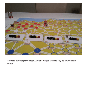 Pierwsza aktywacja Mon ego. Amiens wzięte. Odcięte trzy pola w centrum frontu. 2 Etap. Obie akcje poszły na aktywacje IICND, który zajął Ostendę. Stad pomysl, żeby w grze zezwalac wylacznie na jednokrotną aktywację tego samego korpusu. Inna sprawa, ze IICND i tak jest już niezdolny do dalszej akcji. W swoich dotychczasowych aktywacjach IICND wylosowal Starving Civilians, wydał swoją żywność, po czym wylosował Viva La Libera on i kolejnych cywili. Dwa medale! 3 etap. XXX zajmuje Brukselę ale konczy mu się amunicja, bo trafil na niemiecka ID. W tym momencie odczuwalem cisnienie na Niemców. Powaznie balem się, ze Alianci wskocza za Ren już za chwile. Stad decyzja o wstawieniu Niemca do Eindhoven a nie do Arnhem. Czwarty etap. IBR przemiescil się o 6 pol. Etap 5. IBR idzie na Flessingę odblokowac ujscie Skaldy. Oba pozostale korpusy stoja bez niezbednego zaopatrzenia. Niemcy obsadzaja Holandie. Zaopatrzenie laduje w Ostendzie, Monty wykorzystuje swoja zdolnosc specjalna. Etap 6. Zaopatrzenie trafia do I i XXX korpusow (obie akcje wydane na LOC). Oba szykuja się do ostatniego skoku. Etap 7. XXX wchodzi na pozycje wyjsciowe. IBR zajmuje Flessingę. Tutaj niedopatrzenie, Niemcy powinni obsadzic Arnhem a nie Brede. Przyjmijmy, że tak się stało. 8 Etap. W pierwszej akcji Monty sciaga zaopatrzenie do Antwerpii (podwojny zestaw podstawowy) w drugiej wykonuje Market, zrzucają DPD historycznie na trzy pola. 9 etap. XXXBR rusza do operacji Garden. Zaopatrzenie: 3 paliwa, 3 amunicje. W pierwszym impulsie atakuje Nijmegen i niszczy Niemca (traci 1 paliwo i 1 amunicje, bo 1 amunicje dodaje mu DPD). W drugim impulsie dowozi zaopatrzenie i uzupelnia zapasy. 10 etap. W zalozeniu mial to być przedostatni etap gry, gdyż przyjalem, ze gra konczy się po wyłożeniu 11 Niemca, bez wzgledu na to, jak wielu się ich rozbije. Pod koniec tego etapu spadlyby wszystkie DPD (wytrzymują tylko 2 etapy). W pierwszym impulsie XXXBR atakuje Eindhoven. Trafia na ID (2), zużywa zatem 1 paliwo (ruch) oraz 1 amunicję, bo drugą amunicję daje mu zrzucona DPD. Zostaje mu 2 paliwa i 2 amunicje. W drugim impulsie, XXXBR wydaje 1 paliwo, wchodzi do Arnhem, gdzie napotyka 9 SS PzD Hohenstauffen i rozbija ją wydając ostatnie paliwo, 2 amunicje oraz 1 amunicje dodaną przez DPD. VICTORY! Rozgrywka trwała 40 minut. Pierwsza aktywacja Mon ego. Amiens wzięte.