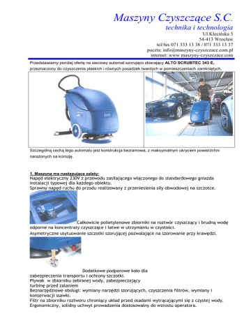 Maszyny Czyszczące S.C. technika i technologia Ul.Klecińska 5 54-413 Wrocław tel/fax 071 333 13 38 / 071 333 13 37 poczta: [email protected] internet: www maszyny-czyszczace.com Przedstawiamy poniŜej ofertę na sieciowy automat szorująco zbierający ALTO SCRUBTEC 343 E, przeznaczony do czyszczenia płaskich i równych posadzek twardych w pomieszczeniach zamkniętych. Szczególną cechą tego automatu jest konstrukcja bezramowa, z maksymalnym ukryciem powierzchni naraŜonych na korozję. 1. Maszyna ma następujące zalety: Napęd elektryczny 230V z przewodu zasilającego włączonego do standardowego gniazda instalacji typowej dla kaŜdego obiektu. Sprawny napęd ruchu do przodu realizowany z przeniesienia siły obwodowej na szczotce. Całkowicie polietylenowe zbiorniki na roztwór czyszczący i brudną wodę odporne na koncentraty czyszczące i łatwe w utrzymaniu w czystości. Asymetryczne usytuowanie szczotki szorującej pozwalające na szorowanie przy krawędzi. Dodatkowe podporowe koło dla zabezpieczenia transportu i ochrony szczotki. Pływak w zbiorniku zebranej wody, zabezpieczający turbinę przed zalaniem Beznarzędziowe obsługi: wymiany narzędzi szorujących, czyszczenia filtrów, wymiany i konserwacji ssawki. Filtr na zbiorniku roztworu chroniący układ przed osadami wytrącającymi się z czystej wody. Ergonomiczny, solidny uchwyt prowadzenia dostosowalny do wzrostu operatora. Białe bieŜniki na kołach jezdnych pozwalające na pracę na kaŜdej posadzce. Długi, 20 metrowy przewód zasilający zapewniający zasięg pracy w promieniu 40m. Zestaw wyłączników na pulpicie maszyny z przełącznikami napędów. Ergonomiczny uchwyt prowadzenia Pełna regulacja „0-max” podawanej ilości wody na posadzkę. Prosty i odporny na koncentraty, grawitacyjny system podawania wody na posadzkę. Zawiesie na szczotkę szorującą lub uchwyt do padów zapenia stałą dostępność potrzebnego narzędzia szorującego. Zawór spustowy resztek roztworu ze zbiornika pozwala na wymianę rodzaju uŜywanego środka czyszczącego. WąŜ spustowy wody brudnej z łatwym zaworem spustowym zapewniający skuteczne i szybkie opróŜnienie zbiornika. Mechanizm regulacji pochylenia szczotki dzięki któremu moŜna ustawiać nacisk na posadzkę oraz prędkość ruchu jazdy do przodu, Boczna rolka krawędziowa na osłonie szczotki chroni przed otarciami. 2. Dane techniczne Parametr Szerokość robocza [mm]: Średnica szczotki [mm]: Szerokość zbierania wody [mm]: Pojemność zbiornika wody czystej [l]: Pojemnośc zbiornika wody brudnej [l]: Wydatek wody na szczotkę/pad [l/min]: Wydajność teoretyczna [m2/godz]: Parametry zasilania elektrycznego [V/~/Hz/A]: Pobór mocy silnika szczotek [W]: Prędkość obrotowa szczotek [1/min]: Pobór mocy turbiny ssącej [W]: Masa własna maszyny gotowej do pracy [kg]: Wymiary zewnętrzne dł.x szer.x wys. [mm]: Minimalny promień skretu [mm]: Średnica kół transportowych [mm]: Maksymalny nacisk kół na posadzkę[N/mm]: Maksym. nacisk szczotki lub padu na posadzkę [kg]: Podciśnienie na turbinie ssącej [mmH2O]: Głośność [(poziom ciśnienia akustycznego)[dB(A): Długość przewodu zasilającego [m]: Wielkość 430 (17”) 430 (17”) 720 31 30 0,3 - 1 1720 230/~1/50/1 1100 150 550W 75 1120 x 570 x 860 750 250 0,23 28 1316 71 20 3. Konfiguracja standardowa. Maszyna podstawowa o numerze katalogowym 908 7119 020, Ssawka prosta z gumami zbierającymi poliuretanowymi, Szczotka szorująca standardowa, Przewód zasilający 20m. 4. Ogólne warunki handlowe i serwisowe. Maszyna objęta jest pełną, dwunastomiesięczną gwarancją na wszystkie podzespoły i akcesoria, obejmującą robociznę, dojazd, koszt wymienianych części i podzespołów. Szczegółowe warunki gwarancji zawarte są w Karcie Gwarancyjnej wydawanej wraz z maszyną. Warunkiem dostawy jest złoŜenie pisemnego zamówienia przez upowaŜnionego przedstawiciela zamawiającego. Jeśli podane w nim oczekiwania zamawiającego odbiegają od złoŜonej oferty, warunki dostawy określone są w potwierdzeniu przyjęcia zamówienia. Termin dostawy określony jest jako 4 do 5 tygodni od daty zamówienia, jeśli kontrakt nie stanowi innaczej. Termin ten moŜna znacznie skrócić, jeśli zamówiony model maszyny znajduje się w magazynie w Polsce. Warunki płatności określone są w kontrakcie lub potwierdzeniu przyjęcia zamówienia do realizacji i obejmują ceny w PLN. Ceny wyliczane są na podstawie kursu EUR w stosunku do PLN. Zastrzegamy sobie prawo zmiany ceny w okresie waŜności oferty, jeśli nastąpi skokowy wzrost wartości EUR przekraczający 5%. Koszt dostawy nie jest wliczony w cenę. Terminy płatności ustalane są indywidualnie. MoŜemy zapewnić realizację dostawy w ramach leasingu we wspólpracy z JTO FINANCE lub innym leasingodawcą wybranym przez zamawiającego. Automat szorująco zbierający ALTO SCRUBTEC dostarczany jest w stanie gotowym do pracy, zaopatrzony w polską instrukcję obsługi oraz deklarację producenta o zgodności z obowiązującymi normami. Nabywca maszyn ma zapewnione pełne, nieodpłatne szkolenie operatorów przy przekazywaniu maszyny. Szkolenie to obejmuje informacje o teorii funkcjonowania maszyny, praktyczne przeszkolenie w zakresie obsługi maszyny oraz jej konserwacji. Przeszkolony operator maszyny jest w pełni przygotowany do bezpiecznego uŜytkowania, zgodnego z przeznaczeniem maszyny oraz instrukcją obsługi. Zapewniamy dowolną ilość szkoleń według uznania zamawiającego, w dowolnym czasie, odpłatnie jak za usługi serwisowe. Pełna obsługa serwisowa zapewniona jest przez nasz serwis w okresie gwarancyjnym i pogwarancyjnym. Zapewnione jest zgłoszenie się serwisu w ciągu 24 godzin, w dni robocze. TakŜe w okresie pogwarancyjnym zapewnione są maszyny zastępcze, na czas dłuŜszego wyłączenia maszyny z eksploatacji. MoŜemy zapewnić inne niŜ standardowe warunki serwisowania w trybie odrębnie zawartych umów. Dostawa realizowana jest nasz