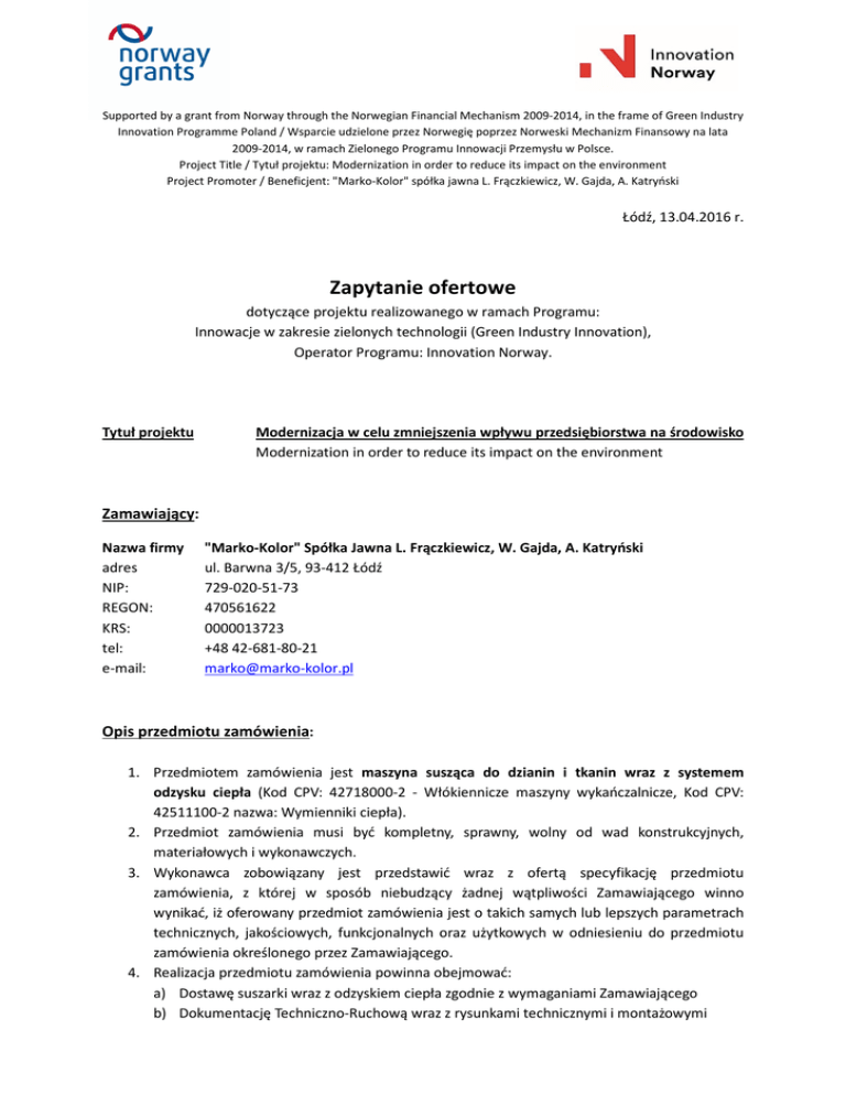Supported by a grant from Norway through the Norwegian Financial Mechanism 2009-2014, in the frame of Green Industry Innovation Programme Poland / Wsparcie udzielone przez Norwegię poprzez Norweski Mechanizm Finansowy na lata 2009-2014, w ramach Zielonego Programu Innowacji Przemysłu w Polsce. Project Title / Tytuł projektu: Modernization in order to reduce its impact on the environment Project Promoter / Beneficjent: "Marko-Kolor" spółka jawna L. Frączkiewicz, W. Gajda, A. Katryński Łódź, 13.04.2016 r. Zapytanie ofertowe dotyczące projektu realizowanego w ramach Programu: Innowacje w zakresie zielonych technologii (Green Industry Innovation), Operator Programu: Innovation Norway. Tytuł projektu Modernizacja w celu zmniejszenia wpływu przedsiębiorstwa na środowisko Modernization in order to reduce its impact on the environment Zamawiający: Nazwa firmy adres NIP: REGON: KRS: tel: e-mail: "Marko-Kolor" Spółka Jawna L. Frączkiewicz, W. Gajda, A. Katryński ul. Barwna 3/5, 93-412 Łódź 729-020-51-73 470561622 0000013723 +48 42-681-80-21 [email protected] Opis przedmiotu zamówienia: 1. Przedmiotem zamówienia jest maszyna susząca do dzianin i tkanin wraz z systemem odzysku ciepła (Kod CPV: 42718000-2 - Włókiennicze maszyny wykańczalnicze, Kod CPV: 42511100-2 nazwa: Wymienniki ciepła). 2. Przedmiot zamówienia musi być kompletny, sprawny, wolny od wad konstrukcyjnych, materiałowych i wykonawczych. 3. Wykonawca zobowiązany jest przedstawić wraz z ofertą specyfikację przedmiotu zamówienia, z której w sposób niebudzący żadnej wątpliwości Zamawiającego winno wynikać, iż oferowany przedmiot zamówienia jest o takich samych lub lepszych parametrach technicznych, jakościowych, funkcjonalnych oraz użytkowych w odniesieniu do przedmiotu zamówienia określonego przez Zamawiającego. 4. Realizacja przedmiotu zamówienia powinna obejmować: a) Dostawę suszarki wraz z odzyskiem ciepła zgodnie z wymaganiami Zamawiającego b) Dokumentację Techniczno-Ruchową wraz z rysunkami technicznymi i montażowymi Supported by a grant from Norway through the Norwegian Financial Mechanism 2009-2014, in the frame of Green Industry Innovation Programme Poland / Wsparcie udzielone przez Norwegię poprzez Norweski Mechanizm Finansowy na lata 2009-2014, w ramach Zielonego Programu Innowacji Przemysłu w Polsce. Project Title / Tytuł projektu: Modernization in order to reduce its impact on the environment Project Promoter / Beneficjent: "Marko-Kolor" spółka jawna L. Frączkiewicz, W. Gajda, A. Katryński c) Wszystkie elementy składowe suszarki wraz z układem odzysku ciepła: I. Układ wprowadzający (ze składki oraz dużych i małych nawojów) z centrowaniem wraz z zasobnikiem typu J-Box II. Dwa fulardy (odżymający, apreturujący) III. Prostowacz wątku do dzianin i tkanin IV. Układ wejściowy do suszarki (dziewiarski – łamany), z podparowaniem V. Komory suszące (8 sztuk) 3m VI. Układ wyjściowy suszarki z chłodzeniem VII. Obcinarka brzegów VIII. System obcinania brzegów do poliestrów – opcjonalnie (dodatkowa punktacja przy ocenie ofert) IX. Układ kontroli wątku wraz z raportowaniem błędów X. Układ pomiaru i kontroli gramatury – opcjonalnie (dodatkowa punktacja przy ocenie ofert) XI. System sterowania maszyny z możliwością akwizycji danych do sytemu informatycznego Zamawiającego XII. Układ wyprowadzający z nawijarkami do małych i dużych nawojów oraz na składkę XIII. Układ odzysku ciepła powietrze - powietrze XIV. Kanały, podesty i konstrukcje wsporcze d) Montaż lub instrukcja montażu, Dokumentacja Techniczno-Ruchowa, certyfikat CE, uruchomienie, testy oraz szkolenie e) Transport elementów wraz z ubezpieczeniem (warunki DAP Łódź) Zakres dostawy: A: dostawa maszyny suszącej do dzianin i tkanin wraz z systemem odzysku ciepła - szt. 1 Specyfikacja techniczna: Stan techniczny: wszystkie składowe elementy maszyny suszącej oraz systemu odzysku ciepła - fabrycznie nowe. Podstawowe wymagania techniczno-technologiczne suszarki: Maks. szerokość robocza – 2600 mm Min. szerokość robocza – 700 mm Maksymalna temperatura powietrza - 220 st. C Minimalna temperatura powietrza - 100 st. C Prędkość łańcucha zawierająca przedział od 5 do 100 m/min Rodzaj łańcucha - poziomy z klipsami System podawania z naddawaniem kontrolowanym falownikiem: Transporter w zakresie -5 + 50 Górny wałek w zakresie -10 +80 Dolny wałek w zakresie -10 +20 Supported by a grant from Norway through the Norwegian Financial Mechanism 2009-2014, in the frame of Green Industry Innovation Programme Poland / Wsparcie udzielone przez Norwegię poprzez Norweski Mechanizm Finansowy na lata 2009-2014, w ramach Zielonego Programu Innowacji Przemysłu w Polsce. Project Title / Tytuł projektu: Modernization in order to reduce its impact on the environment Project Promoter / Beneficjent: "Marko-Kolor" spółka jawna L. Frączkiewicz, W. Gajda, A. Katryński Liczba pól (3m) – 8 Napięcie zasilania: 3 X 400 Volt, 50 Hz +/-%5, Napięcie sterowania 1: 1 X 230 Volt , 50 Hz, +N , + PE, Napięcie sterowania 2: 24 Volt DC Ciśnienie powietrza zasilającego: 6 Bar System wentylatorów wyciągowych: 2 lub 3 wentylatory promieniowe sterowane falownikiem Wejście do maszyny z centrowaniem wraz z zasobnikiem typu J-Box - dla małych i dużych nawojów oraz ze składki System odsysania (VACCUM POMPA) Fulard z regulacją dozowania apretur: 1 odżymający z dużą siłą odżymania, 1 do apretury z grzaną wanną, Prostowacz wątku dla dzianin i tkanin Wejście dziewiarskie z podparowaniem - 6m (łamana rama) Napęd indywidualny łańcuchów transportowych dla każdej strony Grzanie gazowe (gaz ziemny) Kontrola temperatury powietrza oraz towaru Wyjście z maszyny - do małych i dużych nawojów (z kontrolą naprężenia) oraz na składkę Układ kontroli wątku (korekta łuków szybkością wałka wyjściowego, korekta skosów za po pośrednictwem regulacji wałka na wejściu) w