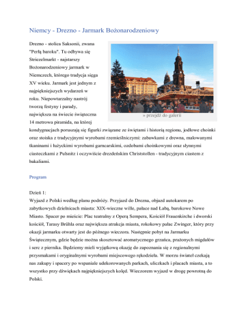 Niemcy - Drezno - Jarmark Bożonarodzeniowy Drezno - stolica Saksonii, zwana "Perłą baroku". Tu odbywa się Striezelmarkt - najstarszy Bożonarodzeniowy jarmark w Niemczech, którego tradycja sięga XV wieku. Jarmark jest jednym z najpiękniejszych wydarzeń w roku. Niepowtarzalny nastrój tworzą festyny i parady, największa na świecie świąteczna » przejdź do galerii 14 metrowa piramida, na której kondygnacjach poruszają się figurki związane ze świętami i historią regionu, jodłowe choinki oraz stoiska z tradycyjnymi wyrobami rzemieślniczymi: zabawkami z drewna, malowanymi tkaninami i łużyckimi wyrobami garncarskimi, ozdobami choinkowymi oraz słynnymi ciasteczkami z Pulsnitz i oczywiście drezdeńskim Christstollen - tradycyjnym ciastem z bakaliami. Program Dzień 1: Wyjazd z Polski według planu podróży. Przyjazd do Drezna, objazd autokarem po zabytkowych dzielnicach miasta: XIX-wieczne wille, pałace nad Łabą, barokowe Nowe Miasto. Spacer po mieście: Plac teatralny z Operą Sempera, Kościół Frauenkirche i dworski kościół, Tarasy Brühla oraz największa atrakcja miasta, rokokowy pałac Zwinger, który przy okazji jarmarku otwarty jest do późnego wieczora. Następnie pobyt na Jarmarku Świątecznym, gdzie będzie można skosztować aromatycznego grzańca, prażonych migdałów i serc z piernika. Będziemy mieli wyjątkową okazję do zapoznania się z regionalnymi przysmakami i oryginalnymi wyrobami miejscowego rękodzieła. W morzu świateł czekają nas zakupy i spacery po wspaniale udekorowanych parkach, uliczkach i placach miasta, a to wszystko przy dźwiękach najpiękniejszych kolęd. Wieczorem wyjazd w drogę powrotną do Polski. Dzień 2: Przyjazd do kraju i zakończenie wycieczki. Świadczenia Transport: Autokar turystyczny. Ubezpieczenie: Signal Iduna S.A. Realizacja programu turystycznego. Opieka pilota. Informacje praktyczne Trasa przejazdu: Katowice - Drezno (ok. 500 km) - ok. 7 godz. http://www.weihnachtsmarkt-dresden.net/ Cena nie zawiera biletów wstępu do zwiedzanych obiektów - orientacyjny koszt ok. 15 EUR. Terminy i ceny Nr grupy Niemcy - Drezno - Jarmark Bożonarodzeniowy Data (skrót: DREZNO JARMARK BOZONARODZENIOWY BRAK) Cena KDJD1203 03.12 - 04.12 249 zł 199 zł Promocja Plan podróży Rezerwuj 2 dni KDJD1210 10.12 - 11.12 249 zł 199 zł Promocja Plan podróży Rezerwuj 2 dni