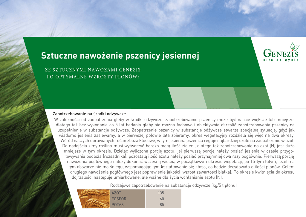 Sztuczne nawożenie pszenicy jesiennej ZE SZTUCZNYMI NAWOZAMI GENEZIS PO OPTYMALNE WZROSTY PLONÓW! Zapotrzebowanie na środki odywcze W zależności od zaopatrzenia gleby w środki odżywcze, zapotrzebowanie pszenicy może być na nie wie˛ksze lub mniejsze, dlatego też bez wykonania co 5 lat badania gleby nie można fachowo i obiektywnie określić zapotrzebowania pszenicy na uzupełnienie w substancje odżywcze. Zaopatrzenie pszenicy w substancje odżywcze stwarza specjalna˛ sytuacje˛, gdyż jak wiadomo jesienia˛ zasiewamy, a w pierwszej połowie lata zbieramy, okres wegetacyjny rozdziela sie˛ wie˛c na dwa okresy. Wśród naszych uprawianych roślin zboża kłosowe, w tym jesienna pszenica reguje najbardziej czule na zaopatrzenie w azot. Do nadejścia zimy roślina musi wytworzyć bardzo mała˛ ilość zieleni, dlatego też zapotrzebowanie na azot (N) jest dużo mniejsze w tym okresie. Dziela˛c wyliczona˛ porcje˛ azotu; jej pierwsza˛ porcje˛ należy posiać jesienia˛ w czasie przygotowywania podłoża (rozsadnika), pozostała˛ ilość azotu należy posiać przynajmniej dwa razy pogłównie. Pierwsza˛ porcje˛ nawożenia pogłównego należy dokonać wczesna˛ wiosna˛ w pocza˛tkowym okresie wegetacji, po 15-tym lutym, jeżeli na tym obszarze nie ma śniegu, wspomagaja˛c tym kształtowanie sie˛ kłosa, co be˛dzie decydowało o ilości plonów. Celem drugiego nawożenia pogłównego jest poprawienie jakości (wzrost zawartości białka). Po okresie kwitnie˛cia do okresu dojrzałości naste˛puje umiarkowane, ale ważne dla życia wchłanianie azotu (N). Rodzajowe zapotrzebowanie na substancje odżywcze (kg/5 t plonu) AZOT FOSFOR POTAS 135 60 85 Sztuczne nawożenie pszenicy jesiennej Nawożenie sztuczne azotem jesiennej pszenicy ROŚLINA PSZENICA JESIENNA JESIENNY PODSTAWOWY NAWÓZ AZOTOWY, JEŻELI NIE JEST WSKAZANE UŻYCIE KOMPLEXOWEGO NAWOZU SZTUCZNEGO 30% całego zapotrzebowania na azot WIOSENNY NAWÓZ AZOTOWY PODSTAWOWY I POGŁÓWNY Genezis Saletrzak lub Saletrzak z Siarka ˛ Genezis Saletra amonowa Genezis Mocznik ZAPOTRZEBOWANIE NA NAWOZY SZTUCZNE (kg/ha) ZAOPATRZENIE GLEBY W SUBSTANCJE ODŻYWCZE SŁABE ŚREDNIE DOBRE 500 350–400 300 300–400 250–350 200–250 250 200 150 Nawożenie sztuczne NPK pszenicy jesiennej ZAPOTRZEBOWANIE NA NAWOZY SZTUCZNE (kg/ha) ROŚLINA PODSTAWOWY NAWÓZ JESIENNY ZAOPATRZENIE GLEBY W SUBSTANCJE ODŻYWCZE SŁABE Genezis NPK 16:9:14+12S PSZENICA JESIENNA Genezis NPK 20:10:10+17S ŚREDNIE DOBRE 300–400 250–300 150–250 Genezis NP 15:25+11S 300–400 250–300 Genezis NPK 8:21:21+4S 350–400 250–350 Nawożenie dolistne pszenicy jesiennej ROŚLINA WIOSENNY NAWÓZ DOLISTNY PSZENICA JESIENNA Mikromix-A Kłosowy lub Mikromix-A Miedź Péti Mix Komplex Plusz A, B lub Genezis-Pétisol N-wzbogacony, P- i K-wzbogacony ZAPOTRZEBOWANIE NA NAWOZY SZTUCZNE 3-4 l/ha 5 kg/ha 5 l/ha PODANE W TABELI ILOŚCI NAWOZÓW SZTUCZNYCH MAJA˛ WYŁA˛CZNIE CHARAKTER ORIENTACYJNY! DOKŁADNE ZALECENIA DOTYCZA˛CE SKŁADU ORAZ ILOŚCI OKREŚLA FACHOWY DORADCA NA PODSTAWIE WYNIKÓW BADAŃ GLEBY! W CELU UZYSKANIA DALSZYCH INFORMACJI PROSIMY O KONTAKT Z NASZYMI PRZEDSTAWICIELAMI! Nitrogénművek Zrt. H-8105 Pétfürdő, Hősök tere 14. ■ Agnieszka Sarkowicz > [email protected] > Tel.: (+48)697-723-015 > Fax: (+48)32/230-2150 ■ Jarosław Urzędowski > [email protected] > Tel.: (+48)516-336-670 > Fax: (+48)32/230-2150 WWW.NITROGEN.HU