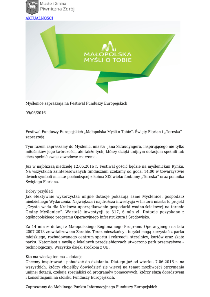 AKTUALNOŚCI Myślenice zapraszają na Festiwal Funduszy Europejskich 09/06/2016 Festiwal Funduszy Europejskich „Małopolska Myśli o Tobie”. Święty Florian i „Tereska” zapraszają. Tym razem zapraszamy do Myślenic, miasta Jana Sztaudyngera, inspirującego nie tylko miłośników jego twórczości, ale także tych, którzy dzięki unijnym dotacjom spełnili lub chcą spełnić swoje zawodowe marzenia. Już w najbliższą niedzielę 12.06.2016 r. Festiwal gościć będzie na myślenickim Rynku. Na wszystkich zainteresowanych funduszami czekamy od godz. 14.00 w towarzystwie dwóch symboli miasta: pochodzącej z końca XIX wieku fontanny „Tereska” oraz pomnika Świętego Floriana. Dobry przykład Jak efektywnie wykorzystać unijne dotacje pokazują same Myślenice, gospodarz niedzielnego Wydarzenia. Największa i najdroższa inwestycja w historii miasta to projekt „Czysta woda dla Krakowa uporządkowanie gospodarki wodno-ściekowej na terenie Gminy Myślenice”. Wartość inwestycji to 317, 6 mln zł. Dotacje pozyskano z ogólnopolskiego programu Operacyjnego Infrastruktura i Środowisko. Za 14 mln zł dotacji z Małopolskiego Regionalnego Programu Operacyjnego na lata 2007-2013 zrewitalizowano Zarabie. Teraz mieszkańcy i turyści mogą korzystać z parku miejskiego, rozbudowanego centrum sportu i rekreacji, strzelnicy, kortów oraz skate parku. Natomiast z myślą o lokalnych przedsiębiorcach utworzono park przemysłowo – technologiczny. Wszystko dzięki środkom z UE. Kto ma wiedzę ten ma …dotacje Chcemy inspirować i pobudzać do działania. Dlatego już od wtorku, 7.06.2016 r. na wszystkich, którzy chcieliby dowiedzieć się więcej na temat możliwości otrzymania unijnej dotacji, czekają specjaliści od programów pomocowych, którzy służą doradztwem i konsultacjami na stoisku Funduszy Europejskich. Zapraszamy do Mobilnego Punktu Informacyjnego Funduszy Europejskich. W godz. 11.00-18.00 (podczas Festiwalu w godz. 14.00-19.00) można bezpłatnie porozmawiać ze specjalistami Punktu Informacyjnego Funduszy Europejskich, Małopolskiej Agencji Rozwoju Gospodarczego, Wojewódzkiego Urzędu Pracy w Krakowie, Fundacji Rozwoju Regionu Rabka, Programu Współpracy Transgranicznej Interreg VA Polska – Słowacja 2014-2020 oraz Małopolskiego Centrum Przedsiębiorczości na temat rozwoju ścieżki zawodowej czy dotacji dla firm, instytucji i organizacji pozarządowych (szczegółowy program dyżurów na stronie: www.festiwal.fundusze.malopolska.pl/info-o-funduszach). Na myślenickim rynku nie zabraknie także beneficjentów unijnej pomocy. Swoje projekty prezentować bedą: Mago-Bawełniany Raj, Powiat Limanowski, Ekokropka Anny Janik, Szkoła Górska – Niepubliczna Placówka Kształcenia Ustawicznego, Makuk, Gmina Myślenice, Wood & Crafts, HEN-HAFT Pracownia Strojów Ludowych i Stylizowanych Henryki Poniewierskiej, SPIN – Faro Consulting, Uzdrowisko Krynica-Żegiestów S.A., Gmina Ochotnica Dolna, Wstążką malowane Klaudii Naściszewskiej, QBEUSZ, Galeria pod Lilianną, Przewodnik po Małopolsce oraz stoisko „Rynek Pracy”. Na sportowo Wieczorem wspólnie kibicujemy biało – czerwonym. Na specjalnie przygotowanych telebimach transmitować będziemy pierwszy mecz Polaków na Mistrzostwach Europy w Piłce Nożnej „Francja 2016”. Oprócz wielu aktywności, na uczestników Festiwalu Funduszy Europejskich czeka spora dawka dobrej muzyki. Wystąpią Anna i Kinga Gurgul, które wygrały pierwszą edycję programu „Aplauz, Aplauz”. Usłyszymy także Martynę Raczek, wielokrotną laureatkę najważniejszych konkursów wokalnych i artystycznych, a także energetyczne zespoły Porch i Gryps. Bezpośrednio przed głównym koncertem zaśpiewa Paulina Bisztyga, dziennikarka muzyczna Radia Kraków, autorka wielu tomików poezji, tekstów piosenek i autorskich albumów. Gwiazdą wieczoru będzie zespół Afromental (godz. 20:30). Kalendarz imprez w ramach Festiwalu Funduszy Europejskich „Małopolska myśli o Tobie” 12 czerwca – Myślenice (Rynek) - gwiazda: Afromental 7 sierpnia – Oświęcim (Rynek) - gwiazda: Dawid Podsiadło 21 sierpnia – Olkusz (Rynek) - gwiazda: Zakopower 28 sierpnia – Nowy Sącz (Rynek) - gwiazda: Afromental Organizatorem Festiwalu Funduszy Europejskich „Małopolska myśli o Tobie” jest Urząd Marszałkowski Województwa Małopolskiego. Więcej informacji o Festiwalu: www.festiwal.fundusze.malopolska.pl Facebook: Małopolska. Fundusze Europejskie Do pobrania: PLAKAT